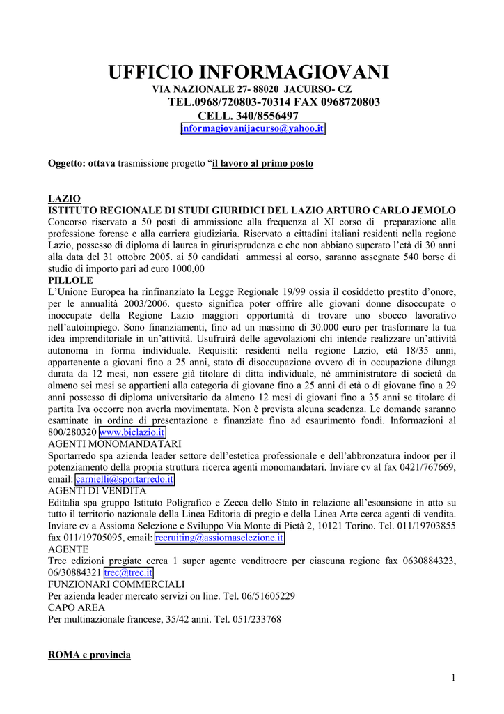 UFFICIO INFORMAGIOVANI VIA NAZIONALE 27- 88020 JACURSO- CZ TEL.0968/720803-70314 FAX 0968720803 CELL. 340/8556497 [email protected] Oggetto: ottava trasmissione progetto “il lavoro al primo posto LAZIO ISTITUTO REGIONALE DI STUDI GIURIDICI DEL LAZIO ARTURO CARLO JEMOLO Concorso riservato a 50 posti di ammissione alla frequenza al XI corso di preparazione alla professione forense e alla carriera giudiziaria. Riservato a cittadini italiani residenti nella regione Lazio, possesso di diploma di laurea in girurisprudenza e che non abbiano superato l’età di 30 anni alla data del 31 ottobre 2005. ai 50 candidati ammessi al corso, saranno assegnate 540 borse di studio di importo pari ad euro 1000,00 PILLOLE L’Unione Europea ha rinfinanziato la Legge Regionale 19/99 ossia il cosiddetto prestito d’onore, per le annualità 2003/2006. questo significa poter offrire alle giovani donne disoccupate o inoccupate della Regione Lazio maggiori opportunità di trovare uno sbocco lavorativo nell’autoimpiego. Sono finanziamenti, fino ad un massimo di 30.000 euro per trasformare la tua idea imprenditoriale in un’attività. Usufruirà delle agevolazioni chi intende realizzare un’attività autonoma in forma individuale. Requisiti: residenti nella regione Lazio, età 18/35 anni, appartenente a giovani fino a 25 anni, stato di disoccupazione ovvero di in occupazione dilunga durata da 12 mesi, non essere già titolare di ditta individuale, né amministratore di società da almeno sei mesi se appartieni alla categoria di giovane fino a 25 anni di età o di giovane fino a 29 anni possesso di diploma universitario da almeno 12 mesi di giovani fino a 35 anni se titolare di partita Iva occorre non averla movimentata. Non è prevista alcuna scadenza. Le domande saranno esaminate in ordine di presentazione e finanziate fino ad esaurimento fondi. Informazioni al 800/280320 www.biclazio.it AGENTI MONOMANDATARI Sportarredo spa azienda leader settore dell’estetica professionale e dell’abbronzatura indoor per il potenziamento della propria struttura ricerca agenti monomandatari. Inviare cv al fax 0421/767669, email: [email protected] AGENTI DI VENDITA Editalia spa gruppo Istituto Poligrafico e Zecca dello Stato in relazione all’esoansione in atto su tutto il territorio nazionale della Linea Editoria di pregio e della Linea Arte cerca agenti di vendita. Inviare cv a Assioma Selezione e Sviluppo Via Monte di Pietà 2, 10121 Torino. Tel. 011/19703855 fax 011/19705095, email: [email protected] AGENTE Trec edizioni pregiate cerca 1 super agente venditroere per ciascuna regione fax 0630884323, 06/30884321 [email protected] FUNZIONARI COMMERCIALI Per azienda leader mercato servizi on line. Tel. 06/51605229 CAPO AREA Per multinazionale francese, 35/42 anni. Tel. 051/233768 ROMA e provincia 1 OSPEDALE MADRE VANNINI DI ROMA Avviso pubblico per incarico quinquennale di direttore di chirurgia generale. Rif. G.U. 67/2005scad. 23/9/2005 COMUNE DI ROMA Concorso pubblico per la formazione di una graduatoria finalizzata all’assegnazione di trecento licenze per l’esercizio del servizio pubblico non di linea. Rif. G.U. 66/2005 scadenza 30/9/2005 ISTITUTO ROMANO DI SAN MICHELE ROMA Concorso pubblico per la copertura a tempo indeterminato di un posto di operatore socio sanitario. Rif. G.U. 69/2005 scadenza 30/9/2005 SARTE PROTOTISTE E SARTE Rif. FJF/05R. per l’atelier fendi di Roma, fax 06/33450464, mail [email protected] SENIOR TRAVEL COUNSELLOR RIF. 6- TRAVEL CONUSELLOR RIF.68/WORKFORCE PLANNER Per American express service. Mail [email protected], fax 06/3224376 RESPONSABILE INTERNAL AUDITING Per gruppo assicurativo-finanziario, con laurea in discipline economiche, età max 35 anni. Sede lavoro Roma. Fax 06/3224376 VARIE FIGURE Centro estetico ricerca responsabile pubbliche relazioni rif.a, estetista diplomata rif. B, età 20/35 anni, fax 06/61110352 DIETRO AL BANCO O ALLA SCRIVANIA Impiegati di studi professionali e addetti per supermercati romani. Cominciamo dai supermercati. Dove occorrono 30 tra scaffalasti e magazzinieri, 50 cassieri e 100 addetti ai banchi della macelleria, gastronomia, pescheria e ortofrutta. Servono, infine, 20 commessi esperti. Per vari reparti “ no- food”. Il curriculum va spedito all’ indirizzo di posta elettronica [email protected] Quanto ai profili impiegatizi, Articolo1 deve individuare 5 addetti all’ufficio estero, con esperienza, ottimo inglese, uso del pc ed età tra i 25 e i 35 anni. Reclutamento in corso anche per 7 segretarie esperte, con padronanza di inglese e francese, e 18 contabili con 2 anni di esperienza. Il curriculum va inviato all’ e-mail [email protected] COMMERCIALE ESTERNO ROMA Rif. COMRM, 28/35 anni. Con diploma o laurea . sito www.bartolini.it AGENTI Azienda leader nazionale aditoria Free- Prees ricerca agenti giovani automuniti pe operare sul territorio, inviare cv a fax 06/43580245 MONTATORI Società oeprante settore impianti di condizionamento ricerca per sede di Roma n. 4 montatori termici, inviare cv al fax 06/95595045 AZIENDA POLICLINICO UMBERTO I Concorso per 80 posti di operatore tecnico addetto all’assistenza Ota. Rif.G.U. 67/2005- scad. 23/9/2005 COLLABORATRICE ALLA VENDITA Per agenzia alta rappresentanza pelletteria. 20/40 anni. Tel. 06/45438610 AGENTI DI VENDITA Per sabel produttrice di cosmetici naturali, 30/40 anni, diploma superiore.fax 011/9951481 AZIENDA OSPEDALIERA S. CAMILLO – C. FORLANINI DI ROMA Avviso pubblico per il conferimento di un incarico di durata minima quinquennale per la copertura di un posto di direttore del SITOR. Rif. G.U. 68/2005 scadenza 26/9/2005 ELETTRICISTI A ROMA Azienda di Roma zona Appia Antica operante settore elettrico cerca elettricisti per impianti civili ed industriali. Età 20/40 anni. Cv a InTempo spa via Marche 56, 00187 Roma, o via fax 06/42391559. AGENTI MONOMANDATARI 2 Per multinazionale tedesca Berner, rif. CS/05, fisso mensile, provvigioni e premi, fax 045/8670266, mail [email protected] 100 VENDITO