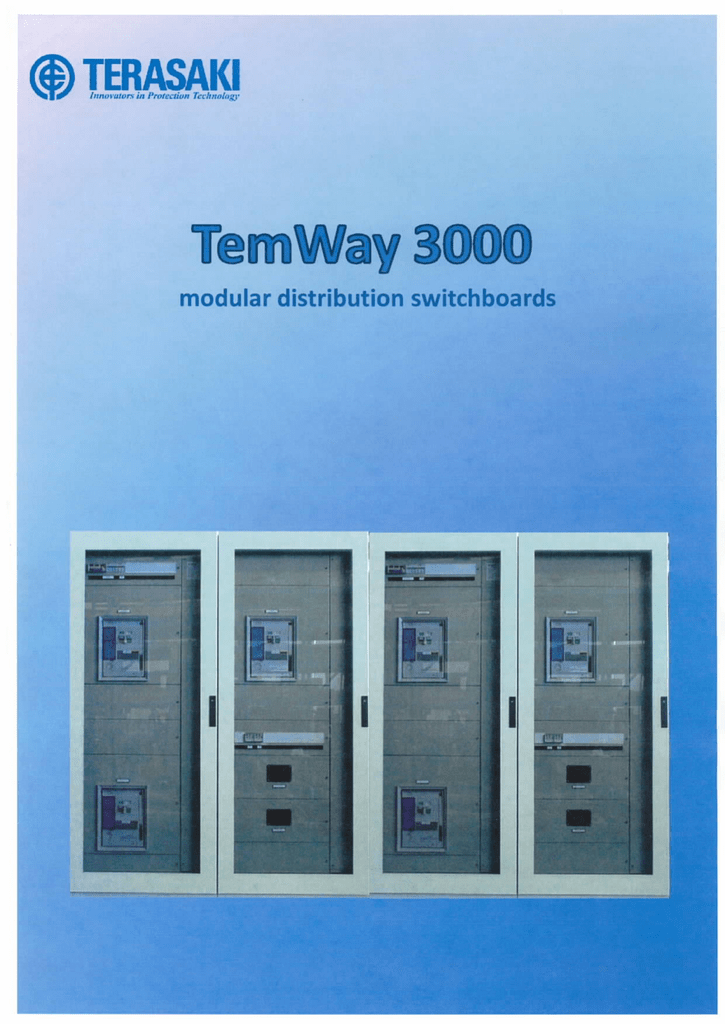 TemWay 3000 TemWay 3000 is Terasaki switchboards line for main, secondary and terminal distribution of electrical energy in low-voltage systems with rated currents up to 3000A and rated short time current 50kA for 1s. TemWay 3000 switchboards are tested and certified in accordance with international standard IEC 439-1. TemWay 3000 switchboards have been designed and manufactured to meet various installation needs and designed for the installation of Terasaki ACBs, mccbs and mcbs, as well as any other type of equipment and complementary device. Modular construction allows you to create structures with width and depth easy to be adapted to any distribution system for office and industrial sectors. TemWay3000 is a new concept product in the panel building ambit for electrical boards able to satisfy various demands of a continuos progressive market. Our deep background in planing and manufacturing of electrical boards has allowed the realization of a product able to adapt itself to any use. Metal structures are made of Aluzinc 15÷20/10mm thick steel having Sendizimir galvanized treatment. Structures are assembled using galvanized bolts. Painted external metal parts are treated by washing and degreasing in a phosfating tunnel using iron phosfate. Painting of the structures and doors is made of epoxy powder 60 mm thick, fine textured semi-gloss finish. We use an automatic cycle plant having final heating treatment 180°C. Standard color is RAL 7035. Other colors are available upon request. TemWay 3000 switchboards have been developped and realised in compliance with international standard IEC 439-1 for nominal currents up to 3000A and certified by the Italian laboratory Centro Elettrotecnico Sperimentale Italiano (CESI) for rated short time current 50kA for 1s, with certificate CER-96/018538. -3- TemWay 3000 - 06/2011 General features Several lenghts and depths can be realised just using basic structures to be choosen among standarized widths and depths. Width Widths of the TemWay 3000 structures has been designed to allow easy positioning of equipment and any size of Terasaki circuit breakers. Three widths are available: - 690mm, - 845mm, - 1000mm. Height: 2150mm. A basic structure of 400mm width is available to be used when front accessibility to the back of switchboard is required. No equipment can be installed in this structure. When necessary, it is possible to assemble more columns side by side, so obtaining cabinets with unlimitated lenght. M TemWay 3000 - 06/2011 -4- General features Depth TemWay3000 basic structure depth can be choosen among following values: - 250mm, - 400mm, - 600mm, - 800mm. When a deeper board is required, it's possible to assemble one or more columns back to back, so obtaining cabinets with unlimited depth. Lateral view -5- TemWay 3000 - 06/2011 General features Size and busbars Designing TemWay3000 we deeply considered all problems connected with traditional panel building systems. There were several problems to solve in order to install big sized devices and switches inside a standard cabinet and to keep spare for busbars. For this reason we thought to make possible different dimensions of the TemWay3000 width columns. So devices and switches of different sizes can now be easily installed. Busbar compartment Busbars can be allocated on top or on bottom or on side of structure. Side allocation depends by structure width according following drawings. - 690mm structure has no busbar compartment. - 845mm structure can have 155mm busbar compartment installed on one side. - 1000mm structure allows more solutions. The first is two busbar compartment 155mm each, at both sides of the structure. The second is a 310mm busbar compartment just at one side of the structure. Busbar compartment TemWay 3000 - 06/2011 -6- General features Rising cables raceway duct It is really an intelligent solution TemWay3000 standardized widths allow one or more cables ascents inside one column, keeping always available a 520mm internal width. This allows to easily fit every ACB and mccb. It is not anymore necessary to put heavy and expensive columns for cables ascents next the electrical board. Now, by a simple and cheap segregation and a frontal panel which can be fitted in few minutes, you can obtain reliable cables ascent. Besides to house the rising duct, the raceway inside each column can be used to house terminal boards. This solution becomes absolutely necessary in 845mm and 1000mm columns to assure a wide rising space, or in case you want a Power Center column with complete frontal accessibility. Cable ducts possible positioning -7- TemWay 3000 - 06/2011 General features Flexible compartments Electrical equipment can be easily installed into dedicated modular compartment. Compartments width is 520mm (door 590mm). Heights are related to breaker size as reported here below. Compartments for mcb and Din equipments are 520mm width (door 590mm), heights are 200mm, 375mm, 550mm for 1, 2 or 3 row of 28 DIN modules each. Measurement compartment can be installed in every part of each structure along its height. Bus duct dedicated compartment can be also used to fit measuremnt instruments, if necessary. Each compartments has its own IP30 door. TemWay 3000 switchboards have been designed to have mccbs horizontal installed. 125A, 250A, 1600A sizes can also be installed in the upright position. ACBs can be only vertical installed. All switches can be fed both from the ON (up) side and the OFF (bottom) side. TemWay 3000 - 06/2011 -8- General features Segregation forms (EN 60439-1) Segregation form is defined as the type of division within the switchboard provided by barriers or partitions, metal or insulating type. TemWay 3000 can be provided with one of the following segregation form: - 1: no segregation; - 2: separation of busbars from the power functional units; - 3: separation of the power supply busbars from the functional units and separation of all functional units each other, except thei