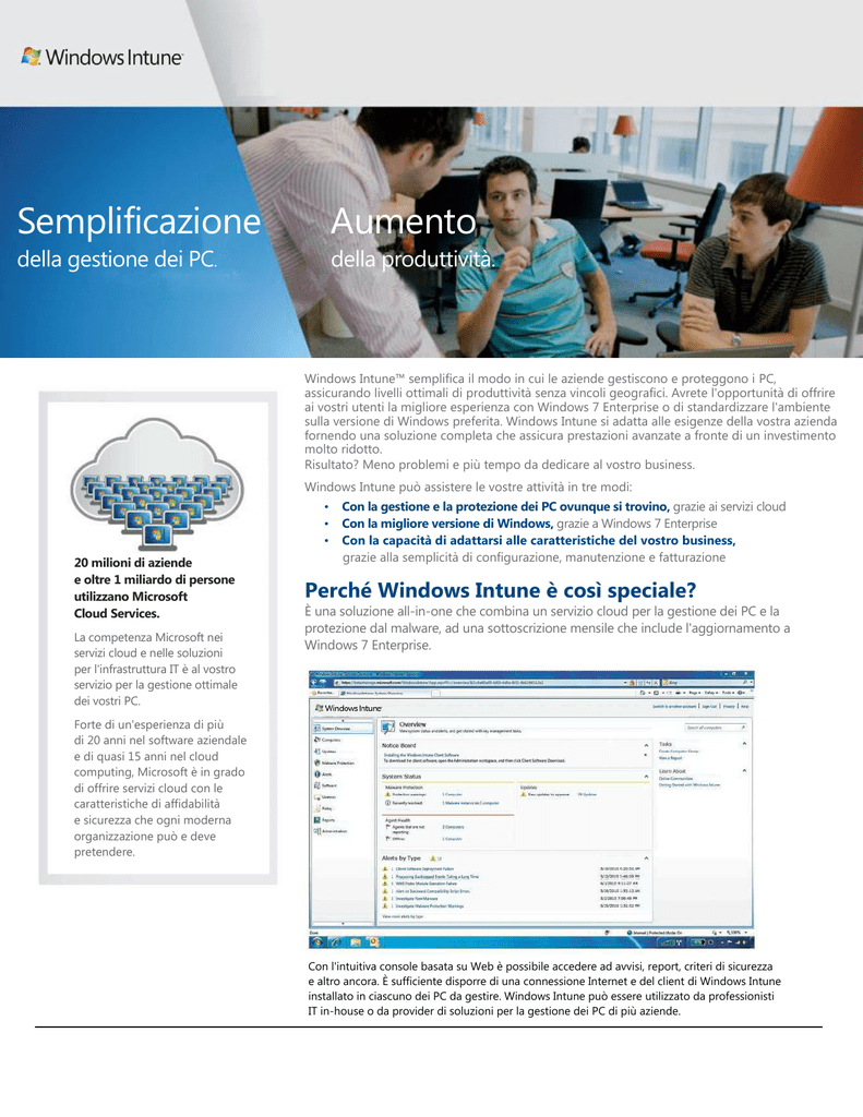 Semplificazione Aumento della gestione dei PC. della produttività. Windows Intune™ semplifica il modo in cui le aziende gestiscono e proteggono i PC, assicurando livelli ottimali di produttività senza vincoli geografici. Avrete l'opportunità di offrire ai vostri utenti la migliore esperienza con Windows 7 Enterprise o di standardizzare l'ambiente sulla versione di Windows preferita. Windows Intune si adatta alle esigenze della vostra azienda fornendo una soluzione completa che assicura prestazioni avanzate a fronte di un investimento molto ridotto. Risultato? Meno problemi e più tempo da dedicare al vostro business. Windows Intune può assistere le vostre attività in tre modi: • • • 20 milioni di aziende e oltre 1 miliardo di persone utilizzano Microsoft Cloud Services. La competenza Microsoft nei servizi cloud e nelle soluzioni per l'infrastruttura IT è al vostro servizio per la gestione ottimale dei vostri PC. Con la gestione e la protezione dei PC ovunque si trovino, grazie ai servizi cloud Con la migliore versione di Windows, grazie a Windows 7 Enterprise Con la capacità di adattarsi alle caratteristiche del vostro business, grazie alla semplicità di configurazione, manutenzione e fatturazione Perché Windows Intune è così speciale? È una soluzione all-in-one che combina un servizio cloud per la gestione dei PC e la protezione dal malware, ad una sottoscrizione mensile che include l'aggiornamento a Windows 7 Enterprise. Forte di un'esperienza di più di 20 anni nel software aziendale e di quasi 15 anni nel cloud computing, Microsoft è in grado di offrire servizi cloud con le caratteristiche di affidabilità e sicurezza che ogni moderna organizzazione può e deve pretendere. Con l'intuitiva console basata su Web è possibile accedere ad avvisi, report, criteri di sicurezza e altro ancora. È sufficiente disporre di una connessione Internet e del client di Windows Intune installato in ciascuno dei PC da gestire. Windows Intune può essere utilizzato da professionisti IT in-house o da provider di soluzioni per la gestione dei PC di più aziende. 100 Seat Deal What makes Windows Intune unique? Quali sono i vantaggi offerti da Windows Intune? Gestione e protezione dei PC Gestione degli aggiornamenti Gestione centralizzata della distribuzione di aggiornamenti e service pack Microsoft verso tutti i PC connessi alla console di Windows Intune, con conseguente riduzione delle attività di routine del personale IT Protezione dei PC dal malware Protezione dei PC dalle minacce più recenti con un sistema centralizzato basato sul Microsoft Malware Protection Engine, che utilizza le stesse affidabili tecnologie di Microsoft Forefront® Endpoint Protection e Microsoft Security Essentials Monitoraggio proattivo dei PC Ricezione di avvisi su aggiornamenti e minacce che facilitano l'identificazione proattiva e la risoluzione anticipata dei problemi prima che influenzino l’uso dei PC e abbiano un impatto sul vostro business Assistenza remota Risoluzione dei problemi dei PC, indipendentemente dall'ubicazione degli utenti, tramite assistenza remota Inventario hardware e software Traccia delle risorse hardware e software utilizzate in azienda per gestire con efficienza asset, licenze e conformità Impostazione dei criteri di sicurezza Gestione centralizzata delle impostazioni per aggiornamenti, firewall e protezione dal malware per tutti i PC, anche su computer esterni alla rete aziendale Standardizzazione Aggiornamento a Windows 7 Enterprise Aggiornamento dei PC a Windows 7 Enterprise, che include un'interfaccia utente intuitiva e migliorata, funzionalità avanzate di ricerca e la crittografia delle unità BitLocker® per proteggere i dati riservati Standardizzazione sulla versione di Windows desiderata Massima flessibilità di standardizzare il parco PC aziendale su un'unica piattaforma Windows (Windows 7 Enterprise, Windows Vista® o Windows XP) e ottenere automaticamente i diritti sulle versioni future di Windows senza dover acquistare licenze di aggiornamento Soluzione all-in-one Soluzione completa Windows Intune offre in un unico acquisto una soluzione completa che include funzioni di gestione dei PC, protezione dal malware, aggiornamenti di Windows e molto altro Immediatezza di utilizzo Non comporta nessuna configurazione server ed è subito utilizzabile per gestire e proteggere i PC Costi e manutenzione ridotti Poiché il servizio cloud Windows Intune è ospitato da Microsoft, non ci sono costi di manutenzione di server e software di gestione dei PC a livello locale Aggiornamenti garantiti L'acquisizione di nuove funzionalità, di aggiornamenti di Windows Intune o relativi al sistema operativo Windows è automatica per tutto il periodo in cui la sottoscrizione è attiva Fatturazione semplice Windows Intune è acquistabile con un piano di pagamenti mensili predeterminati che favoriscono una più accurata previsione delle spese Per ulteriori informazioni su Windows Intune, visitate il sito all'indirizzo www.microsoft.it/windowsintune Componente aggiuntivo opzionale: Microsoft Desktop Optimization Pack Con la sottoscrizione a Windows Intune, avete anche la possibilità di acquistare Microsoft Desktop Optimization Pack (MDOP), un set di strumenti di gestione avanzata dei desktop. MDOP migliora ulteriormente sicurezza e controllo e facilita la risoluzione dei problemi critici non gestiti dal servizio cloud, come la diagnosi e il recupero dei PC non avviabili. Per ulteriori informazioni, visitate il sito all'indirizzo www.microsoft.it/windows/enterprise/products/mdop Le informazioni incluse in questo documento sono relative a un prodotto software in versione pr ovvisoria, che potrà essere modificato in modo sostanziale precedentemente al suo primo rilascio commerciale. Conseguentemente, le informazioni potrebbero non descrivere o rispecchiare il prodotto software in modo preciso al momento del suo rilascio al pubblico. Questo documento ha scopo esclusivamente informativo e Microsof