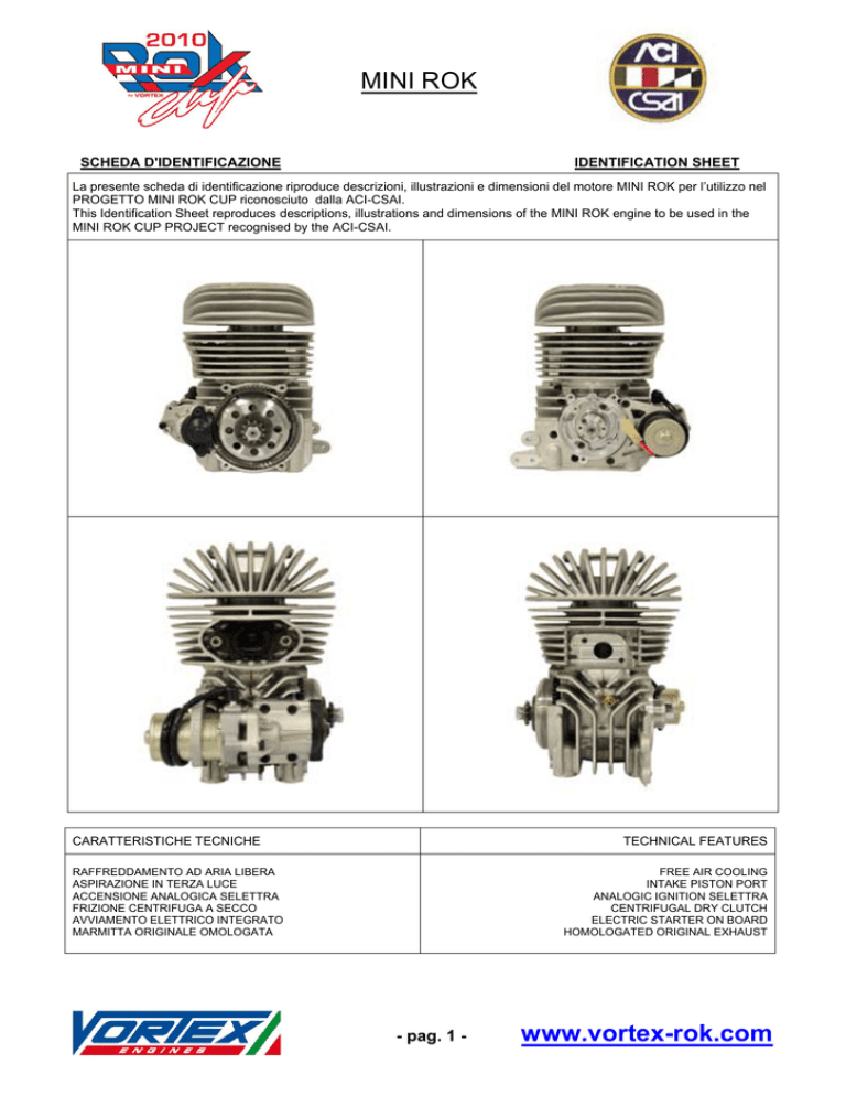 MINI ROK SCHEDA D'IDENTIFICAZIONE IDENTIFICATION SHEET La presente scheda di identificazione riproduce descrizioni, illustrazioni e dimensioni del motore MINI ROK per l’utilizzo nel PROGETTO MINI ROK CUP riconosciuto dalla ACI-CSAI. This Identification Sheet reproduces descriptions, illustrations and dimensions of the MINI ROK engine to be used in the MINI ROK CUP PROJECT recognised by the ACI-CSAI. CARATTERISTICHE TECNICHE TECHNICAL FEATURES RAFFREDDAMENTO AD ARIA LIBERA ASPIRAZIONE IN TERZA LUCE ACCENSIONE ANALOGICA SELETTRA FRIZIONE CENTRIFUGA A SECCO AVVIAMENTO ELETTRICO INTEGRATO MARMITTA ORIGINALE OMOLOGATA FREE AIR COOLING INTAKE PISTON PORT ANALOGIC IGNITION SELETTRA CENTRIFUGAL DRY CLUTCH ELECTRIC STARTER ON BOARD HOMOLOGATED ORIGINAL EXHAUST - pag. 1 - www.vortex-rok.com MINI ROK IMPORTANTE – IMPORTANT TUTTI LE PARTI DEL MOTORE DEVONO ESSERE ORIGINALI VORTEX. ALL THE ENGINE PARTS MUST BE ORIGINAL BY VORTEX. FOTO DEL MOTORE LATO SUPERIORE PICTURE ENGINE UPPER SIDE FOTO DEL MOTORE LATO INFERIORE PICTURE ENGINE LOWER SIDE BASE CILINDRO CYLINDER BASE TESTA E CAMERA DI COMBUSTIONE CYLINDERHEAD AND COMBUSTION CHAMBER FOTO DEI CARTER PICTURE OF THE CRANKCASE FOTO INTERNA DEL CARTER INTERIOR PICTURE OF THE CRANKCASE - pag. 2 - www.vortex-rok.com MINI ROK IMPORTANTE – IMPORTANT TUTTI LE PARTI DEL MOTORE DEVONO ESSERE ORIGINALI VORTEX. ALL THE ENGINE PARTS MUST BE ORIGINAL BY VORTEX. INFORMAZIONI DI BASE E CARATTERISTICHE TECNICHE TECHNICAL INFORMATION AND CHARACTERTICS Tolleranze Cilindrata massima Max displacement Alesaggio massimo Max allowed bore Corsa Stroke Sistema di ammissione Admission system in the cylinder Sistema di raffreddamento Cooling system Carburatore 60 cc. Mini Kart Carburettor 60 cc. Mini Kart Numero dei canali di ammissione Number of transfers Forma della luce di scarico Shape of exhaust transfer Larghezza della luce di scarico Widht of exhaust transfer Larghezza della luce di aspirazione Widht of admission transfer Altezza totale del pistone Total height of piston Peso del pistone Weight of piston 60 cc. 42,10 mm 43,00 mm. +/- 0,10 mm. Piston Port Ad aria libera Free Air Da 18,00 mm., a vaschetta, di tipo non elettronico, sistema del massimo con regolazione meccanica della miscela a mezzo di spillo conico, sistema del minimo con getto e vite di regolazione miscela o aria, con omologazione nazionale in corso di validità. Diametro minimo del collettore: mm. 18,00 18,00 mm., float chamber carburettor, non electronic type, system of maximum with jet and mechanical regulation of mixture through a conical needle, system of minimum with jet and mixture regulation screw or air; with national homologation in course of validity. Diameter minimum of the intake: mm. 18,00 2 A 4 angoli At 4 angles 28,00 mm. +/- 0,10 mm. 26,00 mm. +/- 0,10 mm. 49 mm. +/- 0.8 mm. 63 gr. +/- 5 gr. Peso albero motore con biella Weight of crankshaft with conrod 1313 g. +/- 3% del peso totale,of total weight. Forma della camera di combustione Shape of combustion chamber Sferica,verificabile con dima fornita dal Costruttore Spherical,verifiable with gauge supplied by the Manufacturer - pag. 3 - www.vortex-rok.com MINI ROK IMPORTANTE – IMPORTANT TUTTI LE PARTI DEL MOTORE DEVONO ESSERE ORIGINALI VORTEX. ALL THE ENGINE PARTS MUST BE ORIGINAL BY VORTEX. Pignone Pignon Volume della camera di combustione Volume of combustion chamber Frizione Mod 2009(Centrifuga, a secco, senza alcuna possibilità di registrazione esterna, peso min. gr. 950 – max gr. 1050 completa di frizione, corona di avviamento, e di viti di fissaggio, diametro esterno della campana min mm. 88,00 – max mm. 93,00). Z11 6,80 cc. Min, sopra filetto candela con inserto 6,80 cc. Min, over spark plug thread with Mod 2009 Peso : 980 g Weight: 980g Clutch Mod 2009 (Centrifugal, dry, without any possibility of external adjustment, min. Weight gr. 950 – max gr. 1050 complete of clutch, start gear, and fixing screws, external diameter of the clutch housing min mm. 88,00 – max mm. 93,00) Frizione Mod 2010(Centrifuga, a secco, senza alcuna possibilità di registrazione esterna). Mod 2009 Diametro della campana : 89.5 mm. Diameter of the clutch housing : 89.5 mm. Clutch Mod 2010 (Centrifugal, dry, without any possibility of external adjustment). Mod 2010 Diametro interno della campana:84.5+/-0.1mm. Diameter internal of the clutch housing:84.5+/-0.1 mm Mod 2010 Peso : 815 +/- 15 g Weight: 815 +/- 15g ANGOLI D’APERTURA misurati con spessimetro da mm. 0.20 avente larghezza mm10 e disco graduato con diametro 200mm. B OPENING ANGLES measured through a thickness gauge of 0,20 mm having width of 10 mm and degrees wheel with 200 mm diameter. Tolleranze Travasi 116°,5’ +/- 1° Transfers Ammissione 142° +/- 2° Admission Scarico 154° +/- 2° Exhaust C MATERIALI Le parti del motore in lega d’alluminio devono essere realizzate esclusivamente per fusione o pressofusione. E’ vietato realizzare le parti del motore dal pieno. The engine’s parts in aluminium alloy must be realized exclusively through casting or pressure die-casting. It’s forbidden to realize the engine’s parts from the block. In lega d’alluminio, canna in ghisa con esclusione di cromature e nikasil Cilindro Aluminium alloy, cast iron liner excluding chromium-plating and nikasil Cylinder - pag. 4 - www.vortex-rok.com MINI ROK IMPORTANTE – IMPORTANT TUTTI LE PARTI DEL MOTORE DEVONO ESSERE ORIGINALI VORTEX. ALL THE ENGINE PARTS MUST BE ORIGINAL BY VORTEX. SVILUPPO DEL CILINDRO CYLINDER DEVELOPEMENT DISEGNO DELLA BASE CILINDRO DRAWING OF CYLINDER BASE SEZIONE DEL CILINDRO CYLINDER SECTION - pag. 5 - www.vortex-rok.com MINI ROK IMPORTANTE – IMPORTANT TUTTI LE PARTI DEL MOTORE DEVONO ESSERE ORIGINALI VORTEX. ALL THE ENGINE PARTS MUST BE ORIGINAL BY VORTEX. DISEGNO DELLA TESTA E CAMERA DI COMBUSTIONE DRAWING OFCYLINDERHEAD AND COMBUSTION CHAMBER ALBERO MOTORE CRANKSHAFT - pag. 6 - www.vortex-rok.com MINI ROK IMPORTANTE – IMPORTANT TUTTI LE PARTI DEL MOTORE DEVONO ESSE