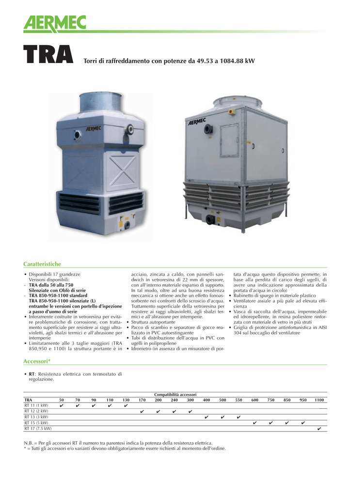 TRA Torri di raffreddamento con potenze da 49.53 a 1084.88 kW Caratteristiche • Disponibili 17 grandezze Verisoni disponibili: - TRA dalla 50 alla 750 Silenziate con Oblò di serie - TRA 850-950-1100 standard TRA 850-950-1100 silenziate (L) entrambe le versioni con portello d’ispezione a passo d’uomo di serie • Interamente costruite in vetroresina per evitare problematiche di corrosione, con trattamento superficiale per resistere ai raggi ultravioletti, agli sbalzi termici e all'abrasione per intemperie • Limitatamente alle 3 taglie maggiori (TRA 850,950 e 1100) la struttura portante è in • • • • acciaio, zincata a caldo, con pannelli sandwich in vetroresina di 22 mm di spessore, con all'interno materiale espanso di supporto. In tal modo, oltre ad una buona resistenza meccanica si ottiene anche un effetto fonoassorbente nei confronti dello scroscio d'acqua. Trattamento superficiale della vetroresina per resistere ai raggi ultravioletti, agli sbalzi termici e all'abrasione per intemperie. Struttura autoportante Pacco di scambio e separatore di gocce realizzato in PVC autoestinguente Tubi di distribuzione dell'acqua in PVC con ugelli in polipropilene Idrometro (in assenza di un misuratore di por- • • • • tata d'acqua questo dispositivo permette, in base alla perdita di carico degli ugelli, di avere una indicazione approssimata della portata d'acqua in circolo) Rubinetto di spurgo in materiale plastico Ventilatore assiale a più pale ad elevata efficienza Vasca di raccolta dell'acqua, impermeabile ed idrorepellente, in resina poliestere rinforzata con materiale di vetro in più strati Griglia di protezione antinfortunistica in AISI 304 sul boccaglio del ventilatore Accessori* • RT: Resistenza elettrica con termostato di regolazione. TRA RT 11 (1 kW) RT 12 (2 kW) RT 13 (3 kW) RT 15 (5 kW) RT 17 (7.5 kW) 50 ✔ 70 ✔ 90 ✔ 110 ✔ 130 ✔ 170 ✔ Compatibilità accessori 200 240 300 ✔ ✔ 400 500 550 ✔ ✔ ✔ 600 750 850 950 ✔ ✔ ✔ ✔ 1100 ✔ N.B. = Per gli accessori RT il numero tra parentesi indica la potenza della resistenza elettrica. * = Tutti gli accessori e/o varianti devono obbligatoriamente essere richiesti al momento dell’ordine. ✔ Dati tecnici Mod. TRA Potenzialità Portata aria Portata acqua Perdite di carico Potenza motore Poli motore Poli motore (doppia polarità) Ventilatori Ugelli Pressione sonora* kW m3/h l/h kPa kW n. n. n. n. dB (A) Mod. TRA Potenzialità Portata aria Portata acqua Perdite di carico Potenza motore Poli motore Poli motore (doppia polarità) Ventilatori Ugelli Pressione sonora Pressione sonora (vers. L) kW m3/h l/h kPa kW n. n. n. n. dB (A) dB (A) 50 49,53 4500 7100 42 0,55 4 4/8 1 1 52 70 69,06 4500 9900 32 0,75 4 4/8 1 1 52 90 88,60 8100 12700 52 0,75 4 4/8 1 1 54 110 107,44 8100 15400 32 0,75 4 4/8 1 1 54 130 125,58 8100 18000 42 1,1 6 6/12 1 1 54 170 168,14 12600 24100 28 1,1 6 6/12 1 1 54 200 197,67 12600 28330 35 1,5 6 6/8 1 1 54 240 242,09 18100 34700 23 1,5 6 6/8 1 4 55 400 405,35 28350 58100 28 2,2 6 6/8 1 4 57 500 488,37 28350 70000 40 4 6 6/12 1 4 57 550 574,19 36000 82300 55 5,5 6 6/12 1 4 58 600 604,88 45350 86700 30 4 6 6/12 1 9 61 750 767,44 45350 110000 48 5,5 6 8/16 1 9 61 850 856,74 58000 122800 49 5,5 8 8/16 1 16 62 56 950 941,86 58000 135000 25 5,5 8 8/16 1 16 62 56 1100 1084,88 67000 155500 32 7,5 8 8/16 1 16 64 57 300 302,33 18100 43300 40 2,2 6 6/8 1 4 55 * = le taglie dalla 50 alla 750 sono esclusivamente silenziate. Alimentazione elettrica = 3~ 230V 50Hz; 3N~ 400V 50Hz. Le prestazioni sono riferite alle seguenti condizioni: Valori riferibili a misurazioni in accordo alla norma ISO 3744, effettuate in campo libero ed in assenza di rumore di fondo, con carico idraulico medio. Livello di pressione sonora ad una distanza dalla torre di 15 m, misurato ad 1,5 metri di altezza da terra. Tolleranza sui valori +/-2 dbA. - temperatura aria entrante 23,5 °C B.U.; - temperatura acqua entrante 35 °C; - temperatura acqua uscente 29 °C Dati dimensionali (mm) A C B Mod. TRA Altezza Larghezza Profondità Peso A B C kg 50 2110 800 800 75 70 2110 800 800 75 90 2595 1000 1000 85 110 2595 1000 1000 95 130 2595 1000 1000 95 170 2800 1200 1200 170 200 2800 1200 1200 170 240 2860 1400 1400 210 300 2860 1400 1400 210 400 3140 1740 1740 410 Mod. TRA Altezza Larghezza Profondità Peso A B C kg 500 3140 1740 1740 410 550 3380 1900 2100 500 600 3450 2100 2300 555 750 3450 2100 2300 580 850 3650 2030 2360 850 850L 3900 2030 2360 850 950 3650 2030 2360 815 950L 3900 2030 2360 815 1100 3650 2360 2360 915 1100L 3900 2360 2360 915 Aermec si riserva la facoltà di apportare in qualsiasi momento tutte le modifiche ritenute necessarie per il miglioramento del prodotto con eventuale modifica dei relativi dati tecnici. Aermec S.p.A. Via Roma, 996 - 37040 Bevilacqua (VR) - Italia Tel. 0442633111 - Telefax 044293730 www.aermec.com Cod.: STRAUI.04 / 1211 TRA 850-1100 TRA 850L-1100L TRA 50-750