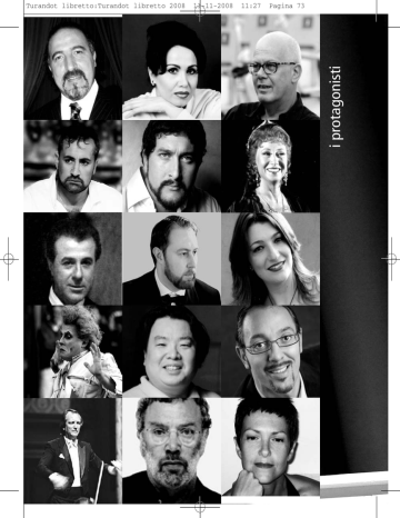 11-11-2008 11:27 Pagina 73 i protagonisti Turandot libretto:Turandot libretto 2008 Turandot libretto:Turandot libretto 2008 11-11-2008 11:27 Pagina 74 OLIVER VON DOHNANYI direttore d’orchestra E’ è nato a Trencin e ha studiato violino, composizione e direzione d’orchestra al Conservatorio di Bratislava e a Vienna all’Academy of Music, sotto la guida di Vaclav Neumann e Otmar Suitner. Ha ricevuto riconoscimenti in molti concorsi tra cui il “Concorso Respighi” a Siena, il “Talich Competition of the Prague Spring” e ancora lo stesso premio dalla televisione ungherese nel 1985 e il premio speciale al Salzburg Festival nel 1989 per la registrazione televisiva dell’opera Memento di Juraj Filas con la Prague Symphony Orchestra. Dal 1979 al 1986 è stato direttore della Slovak Radio Symphony Orchestra a Bratislava e dal 1986 al 1991 direttore musicale della Slovak National Opera, con la quale ha effettuato varie tournée in Spagna, Bulgaria, Cina, Ungheria, Germania, Olanda e al Festival di Edimburgo nel 1990, dove ha diretto produzioni di Faust (ricevendo anche un premio speciale) e di Principe Igor. E’ stato anche direttore artistico del “Charles University Art Ensemble” e del “Canticorum Iubilo Chamber Ensemble” a Praga e direttore della “Czechoslovak Radio Symphony Orchestra” a Bratislava. E’ direttore musicale del National Theatre Prague (dal 2004), è diventato direttore ospite della “Slovak Sinfonietta Chamber Orchestra” nel 2005 ed è stato incaricato della direzione del “National Moravian-Silesian Theatre” di Ostrava nel marzo 2006. Nel luglio 2007, è stato nominato direttore della Slovak National Opera. Il M° von Dohnanyi ha effettuato delle tournée con le orchestre Slovak Philharmonic, Slovak Sinfonietta, Zagreb Radio Symphony Orchestra, Slovak Radio Symphony Orchestra e ha lavorato pure con la St. Petersburg Philharmonic Orchestra, la Czech Philharmonic, i London Mozart Players, la Saarländischer Rundfunk, la Radio Symphony Bratislava, la Yomiuri Nippon Symphony Orchestra, la Chicago Sinfonietta, la Royal Liverpool Philharmonic Orchestra, e la Vorisek Symphony Orchestra in Francia, Italia, Germania, Olanda, Ungheria, Praga, Repubblica Slovacca, Svizzera, Giappone e Regno Unito. Ha effettuato molte registrazioni per Naxos, Lyra, Opus/Audiphon, Panton, Supraphon e Marco Polo, tra le quali una raccolto di composizioni di Glinka, Khatchaturian, RimskyKorsakov e Tchaikovsky con la English Chamber Orchestra per l’etichetta Novalis. Tra le produzioni d’opera che ha diretto: Carmen, La Gioconda, Hamlet e La Sposa venduta all’Opera North, Falstaff e Mefistofele alla English National Opera, Der Widerspenstigen Zähmung al Festival di Wexford, Aida alla Deutsche Oper am Rhein di Düsseldorf, Il Barbiere di Siviglia e Il Turco in Italia all’Opera di Statro di Praga. La Sposa venduta e Il caso Makropoulos alla Janacek Opera di Brno, la prima esecuzione di Golem di Hanus Barton, Don Giovanni, La Sposa venduta e Cyrano De Bergerac a Ostrava, La Bohème e La Traviata a Turandot libretto:Turandot libretto 2008 11-11-2008 11:27 Pagina 75 Osaka, Der Fliegende Holländer a Kassel, Mefistofele a Basilea, Rusalka a Zurigo, una recita in forma di concerto di Ernani con la English Chamber Orchestra al Barbican di Londra, The excursions of Mr Broucek al Charleston Festival, Tosca e Die Lustige Witwe per la Reisopera, Falstaff e Jenufa per il Royal Danish Theatre di Copenhagen, una recita in forma di concerto di Libuše per l’Edinburgh International Festival, Ariadne auf Naxos per la Britten-Pears School di Aldeburgh, Macbeth e Romeo et Juliette per il Badisches Staatstheater di Karlsruhe e La Sposa venduta, Rigoletto, La Traviata, Rusalka, Macbeth, Libuse, Don Pasquale, Tosca e Aida per il National Theatre. Ha diretto anche una Serata di Balletto alla Wiener Staatsoper, Alexander Nevsky al Teatro Teatro San Carlo di Napoli, Cinderella di Prokofiev, A Midsummer night’s dream e la prima esecuzione di In the blue garden per il Bayerisches Staatsballett di Monaco di Baviera, Roméo et Juliette di Prokofiev a Zurigo, Don Giovanni a Lecce, e Macbeth a Bratislava. Nel 2007 concerti a Hong Kong, Praga, Budapest e un concerto di gala all’Opera North, mentre per quanto concerne le produzioni d’opera, La Sposa venduta alla Baltimore Opera e Don Pasquale, La Traviata, Libuse, Samson et Delilah e Rusalka per il Teatro Nazionale di Praga e Cyrano De Bergerac e La Sposa venduta al National Moravian-Silesian Theatre di Ostrava, Norma al Teatro Nazionale di Praga; Jenufa a Malaga (Spagna); Madama Butterfly, Aida, La Bohème e Requiem di Verdi al New Slovak National Theatre di Bratislava; Ariadne auf Naxos e Don Giovanni al National Moravian-Silesian Theatre di Ostrava. HENNING BROCKHAUS regista Nato a Plettenberg in Germania, nel 1965 si diploma in lingue. Nello stesso anno ha iniziato gli studi musicali alla Nordwest-Deutsche Musikakademie Detmold, dove si è diplomato in clarinetto. Dopo una carriera promettente come clarinettista ha ripreso gli studi alla Freie Universität di Berlino, dove ha studiato psicologia, filosofia e scienza del teatro. In seguito ha seguito, come assistente volontario alla regia, diverse produzioni sia alla rinomata Volksbühne Berlin DDR (con Benno Besson e Heiner Müller), sia al Berliner Ensemble (con Manfred Weckwerth), che alla Staatsoper di Berlino con Ruth Berghaus. Nel 1975 l’incontro con Giorgio Strehler segna il suo orientamento definitivo verso la regia, in seguito diviene infatti assistente e stretto collaboratore del fondatore del Piccolo Teatro di Milano. Al Piccolo Teatro, sempre a fianco di Strehler, lavora negli allestimenti dell’Anima buona di Sezuan di Brecht (Amburgo e Piccolo Teatro di Milano), El nost Milan di Bertolazzi, La tempesta di Shakespeare, Il temporale di Strindberg, Giorni felici di Beckett, La storia della bambola abbandonata di Sastre, La grande magia di De Filippo, Arlecchino servitore di due p