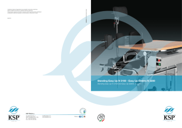 L’azienda si riserva di apportare ai suoi prodotti, senza alcun preavviso, tutte le modifiche tecniche e/o estetiche ritenute opportune. The Company reserves the right to introduce all the technical and/or aesthetical modifications deemed necessary to their products, without prior notice. 09/2013 Standing Easy Up N 3100 - Easy Up Elektro N 3200 Standing Easy Up N 3100 and Easy Up Elektro N 3200 KSP ITALIA S.r.l. Via dell’Artigianato, 1 06031 Bevagna (PG) - Italy Tel. +39 0742 361947 Fax +39 0742 361946 [email protected] www.kspitalia.com Follow us Piani tavolo Table plane Tavolo inclinabile e regolabile in altezza e profondità antero-posteriore. Inclinable table and adjustable in height and anteroposterior depth. 740 720 645 85 - 106 94 - 121 41 - 62 (34-62) 97 - 113 65 Dati tecnici 75 - 102 160 0- 25 25 20 - 46 27 - 32 103 Technical data EASY UP 740 94 - 121 160 645 82 - 103 56 27 - 32 EASY UP ELEKTRO 740 720 645 85 - 106 94 - 121 97 - 113 41 - 62 (34-62) 25 103 75 - 102 160 0- 25 740 20 - 46 41 - 62 (34-62) 97 - 113 0- 25 65 EasyUp N 3100 Standing 20 - 46 27 - 32 Caratteristiche Tecniche - Misura regolabile da medio a grande per adulti. -Telaio portante con doppie colonne di scorrimento telescopico per la regolazione indipendente dell’altezza del poggiamani e del tavolo. Verniciato con polveri poliesteri ed epossipoliesteri. -Base completa di 2 ruote D. mm 40 per lo spostamento. -Pedana in legno finitura noce con fori per il fissaggio del fermatacchi e del fermapiedi. -Tavolo in legno finitura noce regolabile in altezza, profondità antero-posteriore e inclinazione. Technical Features - Adjustable size from medium to large for adults. - Supporting frame with double columns of telescopic sliding for the independent height adjustment of the hand rails and the table. Varnished with polyester and epoxypolyester powders. - Base complete with 2 wheels D. 40 mm for the transfer. - Wooden platform in walnut finish with holes for fixing the heel stopper and the foot stopper. - Wooden table in walnut finish adjustable in height, anteroposterior depth and inclination. ACCESSORI IN DOTAZIONE / ACCESSORIES INCLUDED N 3001 Ginocchiere imbottite ad ergonomia variabile, regolabili indipendentemente in altezza, larghezza e profondità. Kneepad padded with variable ergonomics, independently adjustable in height, width and depth. N 3002 Fermatacchi estraibili regolabili in antero-posteriore e laterale. Extractable heel stopper adjustable in anteroposterior and lateral position. N 3003 Sostegno pettorale regolabile in altezza e in profondità. Pectoral support adjustable in height and depth. N 3004 Spinta posteriore regolabile in anteroposteriore con chiusura di sicurezza e predisposta per il montaggio degli accessori. Maniglione per apertura e chiusura della spinta posteriore. Rear thrust adjustable in anteroposterior position with safety lock and arranged for the accessories mounting. Handle for opening and closing of the rear thrust. Riconducibile ai seguenti codici ISO: 03.48.21.036 - 03.48.21.118 - 03.48.21.106 Attributable to the following codes ISO: 03.48.21.036 - 03.48.21.118 - 03.48.21.106 Iscritto al Repertorio Dispositivi Medici con N. 960180 presso il Ministero della Sanità. Registered to the Medical Devices Database and Repertory with Nr. 960180 at the Ministry of Health. Tutti i codici ISO del Nomenclatore Tariffario devono essere considerati indicativi. Il medico prescrittore, ai sensi dell’Art. 1 c.5 del N.T., può decidere sulla “Riconducibilità per omogeneità funzionale”. All ISO codes of the Tariff Nomenclature have to be considered as approximate. The prescriber, in accordance with the Art. 1 c.5 of the N.T., can decide on “Traceability for functional homogeneity.” EasyUp N 3200 Elektro Standing Caratteristiche Tecniche - Misura regolabile da medio a grande per adulti. - Telaio portante con doppie colonne di scorrimento telescopico per la regolazione indipendente dell’altezza del poggiamani e del tavolo. Verniciato con polveri poliesteri ed epossipoliesteri. - Base completa di 4 ruote piroettanti D. mm 100 per lo spostamento. - Pedana in legno finitura noce con fori per il fissaggio del fermatacchi e del fermapiedi. - Tavolo in legno finitura noce regolabile in altezza, profondità antero-posteriore e inclinazione. - Gruppo elettrico per la movimentazione di salita e discesa della fascia di sollevamento. Motore 230V-300W e scheda elettronica di controllo. Completo di pulsantiera a filo e cavo di alimentazione. - Pulsante anteriore di fine corsa utente. - Pulsante integrato supplementare per il comando di salita e discesa. - Pulsante di emergenza. Technical Features - Adjustable size from medium to large for adults. - Supporting frame with double columns of telescopic sliding for the independent height adjustment of the hand rails and the table. Varnished with polyester and epoxypolyester powders. - Base complete with 4 wheels D. 100 mm for the transfer. - Wooden platform in walnut finish with holes for fixing the heel stopper and the foot stopper. - Wooden table in walnut finish adjustable in height, anteroposterior depth and inclination. - Electric group for moving up and down the lift strap. Motor 230V-300W and electronic control board. Complete with wired push-button panel and power cable. - Stroke-end user anterior button. - Additional integrated button to control the ascent and descent. - Emergency button. ACCESSORI IN DOTAZIONE / ACCESSORIES INCLUDED N 3001 Ginocchiere imbottite ad ergonomia variabile, regolabili indipendentemente in altezza, larghezza e profondità. Kneepad padded with variable ergonomics, independently adjustable in height, width and depth. N 3002 Fermatacchi estraibili regolabili in antero-posteriore e laterale. Extractable heel stopper adjustable in anteroposterior and lateral position. N 3201 - N 3202 Imbracatura di sollevamento completa di cintura pelvica realizzata in tessuto antimacchia, lavabile, antiallergico e atossico. Hoisting s