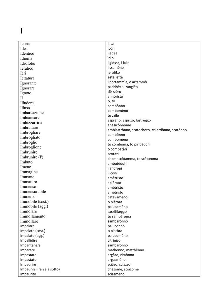 I Icona Idea Identico Idioma Idrofobo Ieratico Ieri Iettatura Ignorante Ignorare Ignoto Il Illudere Illuso Imbarcazione Imbiancare Imbizzarrirsi Imbrattare Imbrogliare Imbrogliato Imbroglio Imbroglione Imbrunire Imbrunire (l') Imbuto Imene Immagine Immane Immaturo Immenso Immensurabile Immerso Immobile (sost.) Immobile (agg.) Immolare Immollamento Immollare Impalare Impalato (sost.) Impalato (agg.) Impallidire Impantanarsi Imparare Impastare Impastato Impaurire Impaurirsi (farsela sotto) Impaurito i, ta icòni i edèa ìdio i glòssa, i lalìa lissamèno ieràtiko estè, eftè i portammìa, o artammò paddhèco, zanglèo dè zzèro annòristo o, to combònno combomèno to zzìlo asprèno, asprìzo, lustrèggo anasicònnome amblastrònno, scatochèzo, zzilardònno, scatònno combònno combomèno to còmboma, to piribàddhi o combatàri scotàzi chamoscòtamma, to scòtamma ambutèddhi i andropì i icòni amètristo aplèrato amètristo amètristo catevamèno o plàtora palucomèno sacrifikèggo to sambàroma sambarònno palucònno o platòra palucomèno citrinìzo sambarònno mathènno, matthènno argàzo, zimònno argasmèno sciàzo, sciàzzo chèzome, sciàzome sciasmèno Impedire Impedire (l'espansione, di ingrandirsi) Imperare Impetigine Impeto Impiagare Impiagato Impiastro Impiccare Impiccio impigrirsi Impinguare Impoltronirsi Impolverare Importante Importare (nel senso di interessarsi) Impostare (il taglio di un albero) Impostatura (del taglio) Impotente Impoverire Imprecare Imprecazione Improvvisamente Impudente Impuntarsi Imputridire In Inacidirsi Inalberare Inalberarsi Inaridire Inaugurare Incagliarsi Incalcolabile Incandescente Incantare Incantesimo Incatarrarsi Incavare Incavato Incenso (colore) Inchinarsi Inchino Inchiodare Inchiostro Inciampare Incignato Incisione inciso Incitare Inclinare Inclinato Incolto colào stilònno prostàzo, kumandèggo i pitìchena to amboma lagònno lagomèno to amblàstri, to cataplàsma cremànno to talòrno litrarìzome pachèno litrarìzome carrastiàzo epifànio 'nportèggo, curègguo podariàzo i podarìa zzìro ftochìzo, pojinnònno catariàzo, flastimào i càtara pòsso i fàccia proibita combiàzo gludiàzzo, zzènno se azzidiàzo sicònno sicònnome zzerèno ncignèggo pìsso amètristo ciòmeno kànno majìa i majìa sinnachònnome cuvagliàzo cùvalo livanò chigliàzome, cigliàzzome to kìgliama carfònno to melàni scundàzo accheròmeno i commàda commèno cendào, stigào jèrro traclò argò, chèrcio Incominciare Inconocchiare Incontrarsi Incontro Incornare Incorregibile Incotto Incurvare Incustodito Indelebile Indemoniato Indicare Indietro Indigestione Indipendenza Indisposto (essere) Indiviso Indomito Indossare Indovino Indugiante Indurire Infangare Infangarsi Infante Infarinare Infastidirsi Infelice Infermo Infettare Infiammarsi Infiammato Infilare infilzare Infino Infornare Infreddolito Infruttuoso Ingannare Ingannato Inganno Ingegno Inghiottire Ingiallire Ingiallito Inginocchiarsi Inginocchiato Ingiuria Ingiuriare Ingordo Ingrassare Ingravidare Ingresso accherònno alecatìzzo, lecatìzo apandènno, pandènno i apàndisi ceratào pacamèno i fucìda stravònno acanùnisto anàsvisto demoniàli dìfo apìssu o còmbo to ozzupòdi malaciàzome amìriasto amèroto vàddho o astròlogo addìazzo zarònno vulutrònno, vulutrègguo vulutrònnome to nìpio alevrònno siddhièggome lipimèno àrrusto, arrustàri, rachùni cammarònno floghìzo paraddhumemmèno, floghimèno suriàzo suriàzo fìna affurrìzo rigastò àcarpo combònno, angannègguo combomèno to apiàddhi to gnègno, o ammialò diavàzo citrinìzo gialìno angonatìzzo gonatistò i vrisìa, to frùstemma vrìzo cannarùto pachèno guàddho òtimo, gastrònno i èmbasi Ingrossarsi Inguini Inimicizia Iniziare Iniziato Inizio Innaffiare Innamorarsi Innanzi Innanzitutto Innervosirsi Innestare Innestato Innesto Innesto Innumerato Innumerevole Inoltre inondare Inquietare Inquieto Inquietudine Insaccare Insanguinare Insaponare Insegnare Inseminato Inseparato Insetto (dei legumi) Insieme Insipido Installare Intralciare Insulso Insultare Insulto Intagliare Intanto Intatto Integro Intelletto Intendere Interamente Interessare Interiora Intero Interpretare Interpretazione Interrogare Interrompere Intesa Intestino Intimorire chrondèno ta angonàglia i ostrìa, i oftìa 'mbènno, accherònno accheromèno to èmbima, to acchèroma potìzo limbìzome ambrò prìta 'zze òlo narviàzome cendrào, cendrònno ciandomèno to cendrì to ciàndima amètristo amètristo parèo gurniàzo polemào to figarùdi to polèmina vàddho sto sàkko (prendere in giro) ematònno sapunào mathènno, matthènno àsperto achòristo, amìriasto to papùzzi immìa, ismìa, ndàma, smìa anàlato vàddho colào anàlato culuvrìzo to culùvrisma characiàzo san àrte amàlasto, anènghisto, azzàrosto amàlasto, anènghisto, azzàrosto to gnègno, o ammialò anogào, aporào pàru curègguo, mportègguo i cilìe ijo diamerèggo i diamerìa arotào apoclànno, aracòsto to apòrima i stigliòla, to àndero sciàzo Intingere Intirizzire Intontire Intorbidire Intorno Intorpidirsi Intravedere Intrecciare Intristirsi Inturgidimento Inturgidirsi Inutilmente Invalido Invano Invasato Invecchiare Invece Inveire Invelenito Inventare Inverminare Invernale Invernata Inverno Invero Inviato Invidia Inzuppare Io Ipocondria Ira Iracondia Iracondo Irascibile Irrequieto Irriducibile Irrigare Irrigato Irrigazione Irrigidimento Irrigidire Irrigidirsi Irritabile Irrorare Isola Isoletta Ispezionare Ispezione Issare Istante Istante (all') Istigare Istruire apalèno rigào sambarònno cholèno, cholònno jìru jìru stracarònnome scèstome plèco sinnofiàzo to càvloma cavlònno ambàtula àchrizo ambàtula demoniàli jerào ma catariàzo, stèddho càtare chogliasmèno krièggo sculiciàzo chimognacò, chimonìtico i chimonìa o chimòna stin alìthia stemmèno i zulìa, o ftònos zulìo crazzo, strigào i tùlupa ngurnià