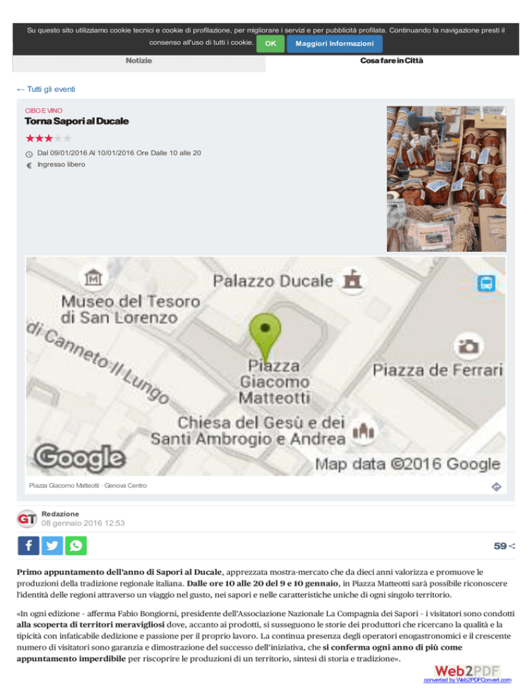 Su questo sito utilizziamo cookie tecnici e cookie di profilazione, per migliorare i servizi e per pubblicità profilata. Continuando la navigazione presti il Sezioni consenso all'uso di tutti i cookie. OK Maggiori Informazioni Notizie Cosa fare in Città ← Tutti gli eventi CIBO E VINO Torna Sapori al Ducale Dal 09/01/2016 Al 10/01/2016 Ore Dalle 10 alle 20 Ingresso libero Piazza Giacomo Matteotti · Genova Centro Redazione 08 gennaio 2016 12:53 59 Primo appuntamento dell’anno di Sapori al Ducale, apprezzata mostra-mercato che da dieci anni valorizza e promuove le produzioni della tradizione regionale italiana. Dalle ore 10 alle 20 del 9 e 10 gennaio, in Piazza Matteotti sarà possibile riconoscere l'identità delle regioni attraverso un viaggio nel gusto, nei sapori e nelle caratteristiche uniche di ogni singolo territorio. «In ogni edizione – afferma Fabio Bongiorni, presidente dell’Associazione Nazionale La Compagnia dei Sapori – i visitatori sono condotti alla scoperta di territori meravigliosi dove, accanto ai prodotti, si susseguono le storie dei produttori che ricercano la qualità e la tipicità con infaticabile dedizione e passione per il proprio lavoro. La continua presenza degli operatori enogastronomici e il crescente numero di visitatori sono garanzia e dimostrazione del successo dell’iniziativa, che si conferma ogni anno di più come appuntamento imperdibile per riscoprire le produzioni di un territorio, sintesi di storia e tradizione». converted by Web2PDFConvert.com Una vera sfida dei cinque sensi, un turbinio di profumi e sapori familiari, ma anche nuovi e inaspettati: dalla Finocchiona toscana ai salumi umbri al pepe rosa, dai formaggi di bufala campana a quelli piemontesi e sardi, dai taralli pugliesi lavorati a mano al pane di castagne. E poi vino, conserve ittiche, pasticceria pasta fresca, confetture, frutta e verdura di stagione, olio extravergine di oliva biologico, riso vercellese, pesto, miele e prodotti dell’alveare, cioccolato e molto altro ancora. Per favorire la partecipazione all’iniziativa delle imprese liguri e del Genovesato, Sapori al Ducale si avvale della collaborazione del Gal Appennino Genovese e della Strada del Castagno. La manifestazione, nata su iniziativa del Comune di Genova con la partecipazione delle tre Confederazioni Agricole Liguri Coldiretti, Cia, Confagricoltura, è curata dall’Associazione Nazionale La Compagnia dei Sapori, che dal 2004 sostiene e promuove il lavoro di persone che producono e valorizzano cibo di qualità: aziende agricole, imprese artigiane, Enti e consorzi, che rappresentano un’unica filiera integrata del gusto e che fanno della qualità, del legame con il territorio e delle lavorazioni tradizionali il proprio criterio operativo. Argomenti: ducale Condividi gastronomia sapori Tweet Commenti Registrati o Accedi per lasciare il tuo commento Eventi Popolari EVENTI La boxe è femmina: corso gratuito sulla violenza di genere converted by Web2PDFConvert.com EVENTI "Street food party" la notte bianca di San Valentino EVENTI Eros e Thanatos: cena erotico noir con portate afrodisiache converted by Web2PDFConvert.com EVENTI Mika in concerto: da X Factor all'Arena del Mare TORNA SU CANALI Cronaca Sport Politica Economia e Lavoro Smart City Cosa fare in città Zone Segnalazioni © Copyright 2010-2016 - GenovaToday supplemento al plurisettimanale telematico RomaToday reg. tribunale di Roma n. 93/2010 P.iva 10786801000 converted by Web2PDFConvert.com