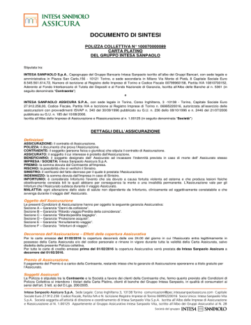 DOCUMENTO DI SINTESI POLIZZA COLLETTIVA N° 100070000089 CARTA PLATINO DEL GRUPPO INTESA SANPAOLO Stipulata tra: INTESA SANPAOLO S.p.A., Capogruppo del Gruppo Bancario Intesa Sanpaolo iscritto all’albo dei Gruppi Bancari, con sede legale e amministrativa in Piazza San Carlo,156 - 10121 Torino, e sede secondaria in Milano Via Monte di Pietà, 8 Capitale Sociale Euro 8.545.561.614,72, Numero di iscrizione al Registro delle Imprese di Torino e Codice Fiscale 00799960158, Partita IVA 10810700152, Aderente al Fondo Interbancario di Tutela dei Depositi e al Fondo Nazionale di Garanzia, Iscritta all’Albo delle Banche al n. 5361 (in seguito denominata “Contraente”) e INTESA SANPAOLO ASSICURA S.P.A., con sede legale in Torino, Corso Inghilterra, 3 -10138 - Torino, Capitale Sociale Euro 27.912.258,00, Codice Fiscale, Partita IVA e Iscrizione al Registro Imprese di Torino n. 06995220016, autorizzata all’esercizio delle assicurazioni con provvedimenti ISVAP n. 340 del 30/09/1996 pubblicato su G.U. n. 236 dello 08/10/1996 e n. 2446 del 21/07/2006 pubblicato su G.U. n. 185 del 10/08/2006. Iscritta all’Albo delle Imprese di Assicurazione e Riassicurazione al n. 1.00125 (in seguito denominata “Società”) DETTAGLI DELL’ASSICURAZIONE Definizioni ASSICURAZIONE: il contratto di Assicurazione. POLIZZA: il documento che prova l'Assicurazione. CONTRAENTE: il soggetto (persona fisica o giuridica) che stipula il contratto di Assicurazione. ASSICURATO: il soggetto il cui interesse è protetto dall'Assicurazione. BENEFICIARIO: il soggetto designato dall' Assicurato ad incassare l'indennità prevista in caso di morte dell' Assicurato stesso IMPRESA / SOCIETÀ: Intesa Sanpaolo Assicura S.p.A. PREMIO: la somma dovuta dal Contraente all'Impresa. RISCHIO: la possibilità che sì verifichi il Sinistro. SINISTRO: il verificarsi del fatto dannoso per il quale è prestata l'Assicurazione. INDENNIZZO: la somma dovuta dall'Impresa in caso di Sinistro. INFORTUNIO: è considerato Infortunio l'evento che sia dovuto a causa fortuita violenta ed esterna e che produca lesioni fisiche obiettivamente constata bili le quali abbiano per conseguenza la morte o una invalidità permanente. L'Assicurazione vale per gli Infortuni che l'Assicurato subisca durante il viaggio Assicurato. MALATTIA: ogni alterazione dello stato di salute non dipendente da Infortunio, clinicamente ed oggettivamente constatabile e che avvenga durante il viaggio dell' Assicurato. Oggetto dell’Assicurazione Le presenti Condizioni di Assicurazione hanno per oggetto la seguente garanzia Assicurativa: Sezione A – Garanzia “Danni da collisione”. Sezione B – Garanzia “Ritardo viaggio/Perdita della coincidenza”. Sezione C – Garanzia “Ritardo/perdita bagaglio”. Sezione D – Garanzia “Protezione acquisti”. Sezione E – Garanzia “Annullamento viaggio”. Sezione F – Garanzia “Infortuni di viaggio”. Decorrenza dell’Assicurazione – Effetti della copertura Assicurativa Per le carte emesse dal 01/02/2016 la copertura decorrerà dalle ore 24.00 del giorno in cui l'Assicurato entra legittimamente in possesso della Carta Assicurata e/o del codice personale e rimane in vigore durante tutta la validità della Carta Assicurata, salvo disdetta della presente Polizza collettiva. Per tutte le carte di credito emesse prima del 01/02/2016 la copertura Assicurativa verrà prestata da Intesa Sanpaolo Assicura a decorrere dal 01/02/2016. Premio di Assicurazione. Il pagamento del Premio è a carico della Contraente, restando inteso che le garanzie di Assicurazione opereranno a titolo gratuito per l’Assicurato. Soggetti Assicurati La Polizza è stipulata tra la Contraente e la Società a favore dei clienti della Contraente che, fermo quanto previsto alle Condizioni di Polizza Collettiva si intendono i titolari della Carta Platino, clienti di banche del Gruppo Intesa Sanpaolo, in qualità di consumatori ai sensi dell'art. 3 lett. a) del D.Lgs. 206/2005. Garanzie prestate L’Assicurazione garantisce ai soggetti Assicurati le seguenti coperture, nei termini e nei limiti indicati nella Polizza collettiva: A) Danni da collisione Dichiarazioni Persone assicurabili e Assicurati: saranno assicurabili ai sensi della presente Polizza tutti i titolari di Carta Platino, a condizione che le rispettive spese siano state addebitate sul conto Carta Platino. Garanzie/Indennizzi A condizione che abbia pagato il noleggio del veicolo con la propria carta per un periodo complessivo non superiore a 31 giorni, il titolare beneficerà della copertura Assicurativa in caso di danni materiali subiti dal veicolo noleggiato o in caso di furto dello stesso. In caso di danni materiali al veicolo noleggiato ovvero di furto dello stesso, indipendentemente dal fatto che vi siano terzi identificati, responsabili o meno, l'Assicurazione copre i costi sostenuti per riparare il veicolo o ripristinarne le condizioni originarie entro i seguenti limiti: • l'importo della franchigia prevista nel contratto di noleggio quando l'Assicurato rifiuti l'Assicurazione del noleggiatore, laddove il noleggiatore garantisca la copertura dei danni ai veicoli ai sensi di un altro contratto per una somma superiore a tale franchigia, ovvero • l'importo della franchigia non rimborsabile prevista nel contratto di noleggio quando l'Assicurato accetti l'Assicurazione della società di noleggio, laddove la società di noleggio garantisca la copertura dei danni ai veicoli per un importo eccedente tale franchigia in virtù di un'altra Polizza. La presente copertura è prestata al titolare senza alcuna formalità nonché alle persone che viaggiano con il titolare e sono alla guida del veicolo noleggiato, a condizione che i loro nomi siano stati preventivamente riportati sul contratto di noleggio. Per usufruire della copertura Assicurativa, il titolare deve: soddisfare i criteri di guida previsti dalla società di noleggio, dalle leggi vigenti o dalla giurisdizione locale guidare il veicolo nolegg