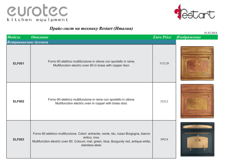 Прайс-лист на технику Restart (Италия) 01.03.2014 Модель Описание Встраиваемые духовки Euro Price ELF001 Forno 60 elettrico multifunzione in ottone con sportello in rame. Multifunction electric oven 60 in brass with copper door. 3123,20 ELF002 Forno 60 elettrico multifunzione in rame con sportello in ottone. Multifunction electric oven in copper with brass door. 3123,2 ELF003 Forno 60 elettrico multifunzione. Colori: antracite, verde, blu, rosso Borgogna, bianco antico, inox. Multifunction electric oven 60. Colours: mat, green, blue, Burgundy red, antique white, stainless-steel. 3052,8 Изображение ELF005 Forno 90 elettrico multifunzione. Colori: antracite, verde, blu, rosso Borgogna, bianco antico, inox. Multifunction electric oven 90. Colours: mat, green, blue, Burgundy red, an- tique white, stainless-steel. 3435,2 ELF005G Forno 90 a gas ventilato. Colori: antracite, verde, blu, rosso Borgogna, bianco antico, inox. Gas oven 90 with fan. Colours: mat, green, blue, Burgundy red, antique white, stainlesssteel. 3707,2 ELF038 Forno 90x48 elettrico multifunzione. Colori: antracite, verde, blu, rosso Bor- gogna, bianco antico, inox. Multifunction electric oven 90x48. Colours: mat, green, blue, Burgundy red, antique white, stainless-steel. 3465,6 ELF039 Forno doppio 90 (60 elettrico+30 elettrico). Colori: antracite, blu, verde, rosso Borgogna, bianco antico, inox. Double oven 90 (60 electric+30 electric). Colours: mat, blue, green, Burgundy red, antique white, stainless-steel. 5448 ELF039G Forno doppio 90 (60 gas+30 elettrico). Colori: antracite, blu, verde, rosso Borgogna, bianco antico, inox. Double oven 90 (60 gas+30 electric). Colours: mat, blue, green, Burgundy red, antique white, stainless-steel. 5816 ELF043 Forno 60 elettrico multifunzione in ottone con sportello in rame. Multifunction electric oven 60 in brass with copper door. 3700,8 ELF043G Forno 60 a gas in ottone con sportello in rame. Gas oven 60 in brass with copper door. 4260,8 ELF044 Forno 60 multifunzione in rame con sportello in ottone. Multifunction electric oven 60 in copper with brass door. 3700,8 ELF044 Forno 60 a gas in rame con sportello in ottone. Gas oven 60 in copper with brass door. 4260,8 ELF045 Forno 60 multifunzione. Sportello in ottone. Colori: antracite, verde, blu, rosso Borgogna, bianco antico, inox. Multifunction electric oven 60. Brass door. Colours: mat, green, blue, Burgun- dy red, antique white, stainless-steel. 3139,2 ELF045G Forno 60 a gas. Sportello in ottone. Colori: antracite, verde, blu, rosso Bor- gogna, bianco antico, inox. Gas oven 60. Brass door. Colours: mat, green, blue, Burgundy red, antique white, stainless-steel. 3545,6 ELF050 Forno 90 elettrico multifunzione. Sportello in ottone. Colori: antracite, verde, blu, rosso Borgogna, bianco antico, inox. Multifunction electric oven 90. Brass door. Colours: mat, green, blue, Burgun- dy red, antique white, stainless-steel. 4628,8 ELF050G Forno 90 a gas ventilato. Sportello in ottone. Colori: antracite, verde, blu, rosso Borgogna, bianco antico, inox. Gas oven 90. Brass door. Colours: mat, green, blue, Burgundy red, antique white, stainless-steel. 4968 ELF060 Forno 60 multifunzione. Sportello in ottone. Colori: antracite, verde, blu, rosso Borgogna, bianco antico, inox. Multifunction electric oven 60. Brass door. Colours: mat, green, blue, Burgun- dy red, antique white, stainless-steel. 3867,2 ELF061 Forno 60 multifunzione. Colori: antracite, verde, blu, rosso Borgogna, bianco antico, inox. Multifunction electric oven 60. Colours: mat, green, blue, Burgundy red, an- tique white, stainless-steel. 2939,2 ELF061G Forno 60 a gas. Colori: antracite, verde, blu, rosso Borgogna, bianco antico, inox. Gas oven 60. Colours: mat, green, blue, Burgundy red, antique white, stainless- steel. 3281,6 ELF062 Forno 60 multifunzione. Colori: antracite, verde, blu, rosso Borgogna, bianco antico, inox. Multifunction electric oven 60. Colours: mat, green, blue, Burgundy red, an- tique white, stainless-steel. 3302,4 ELF070 Forno 70 multifunzione. Sportello in ottone. Colori: antracite, bianco antico, inox. Multifunction electric oven 70. Brass door. Colours: mat, antique white, stain- less-steel. 4532,8 ELF072 Forno 70 multifunzione. Colori: antracite, bianco antico, inox. Multifunction electric oven 70. Colours: mat, antique white, stainless-steel. 3984 ELF073 Forno 70 elettrico multifunzione in ottone con sportello in rame. Multifunction electric oven 70 in brass with copper door. 4304 ELF074 Forno 70 elettrico multifunzione in rame con sportello in ottone. Multifunction electric oven 70 in copper with brass door. 4304 ELF090 Forno 90 multifunzione. Sportello in ottone. Colori: antracite, verde, blu, rosso Borgogna, bianco antico, inox. Multifunction electric oven 90. Brass door. Colours: mat, green, blue, Burgun- dy red, antique white, stainless-steel. 4803,2 ELF091 Forno 90 multifunzione. Colori: antracite, verde, blu, rosso Borgogna, bianco antico, inox. Multifunction electric oven 90. Colours: mat, green, blue, Burgundy red, an- tique white, stainless-steel. 3174,4 ELF091G Forno 90 a gas. Colori: antracite, verde, blu, rosso Borgogna, bianco antico, inox. Gas oven 90. Colours: mat, green, blue, Burgundy red, antique white, stainless- steel. 3436,8 ELF092 Forno 90 multifunzione. Colori: antracite, verde, blu, rosso Borgogna, bianco antico, inox. Multifunction electric oven 90. Colours: mat, green, blue, Burgundy red, an- tique white, stainless-steel. Компактная серия 4139,2 0 ELF062C Macchina da caffè automatica con display digitale. Colori: antracite, verde, blu, rosso Borgogna, bianco antico, inox. Automatic coffee machine with digital display. Colours: mat, green, blue, Burgundy red, antique white, stainless-steel. 4872 ELF062P Forno pizza 60 multifunzione quickstart, con termostato 400°C. Colori: antracite, verde, blu, rosso Borgogna, bianco antico, inox. Multifunction quickstart 