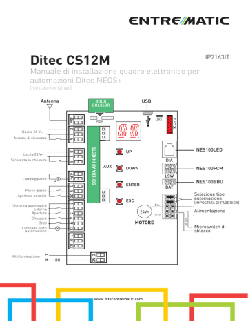 Ditec CS12M IP2163IT Manuale di installazione quadro elettronico per automazioni Ditec NEOS+ (Istruzioni originali) USB GOLR GOL868R JR1 RDX SCHEDA AD INNESTO NES100LED UP DIA AUX NES100FCM DOWN LSW NES100BBU ENTER BAT Selezione tipo automazione ESC 1 2 3 4 9 13 Chiusura automatica esterna Apertura Chiusura Stop Lampada stato automazione 1 5 20 Passo-passo Apertura parziale +LP- Lampeggiante 0 1 8 Uscita 24 V + Sicurezza in chiusura 0 1 6 + Arresto di sicurezza Uscita 24 V (IMPOSTATA DI FABBRICA) + blu 24V C NO www.ditecentrematic.com Alimentazione nero MOTORE 1 G1 G3 L N Kit illuminazione C O M grigio Antenna Microswitch di sblocco 4 IP2163IT - 2014-08-05 Indice Argomento Pagina 1. Avvertenze generali per la sicurezza 6 2. Dichiarazione di conformità CE 7 3. Dati tecnici 7 4. Comandi 8 4.1 Inserimento scheda ad innesto (AUX) 9 4.2 Costa di sicurezza autocontrollata 5. 9 Uscite ed accessori 11 6. Selezioni 13 7. Regolazioni 14 7.1 Accensione e spegnimento 14 7.2 Combinazione di tasti 15 7.3 Menù principale 16 7.4 Menù di secondo livello - AT (Automatic Configurations) 17 7.5 Menù di secondo livello - BC (Basic Configurations) 19 7.6 Menù di secondo livello - BA (Basic Adjustment) 21 7.7 Menù di secondo livello - RO (Radio Operations) 25 7.8 Menù di secondo livello - SF (Special Functions) 28 7.9 Menù di secondo livello - CC (Cycles Counter) 30 7.10 Menù di secondo livello - EM (Energy Management) 7.11 Menù di secondo livello - AP (Advanced Parameters) 8. Modalità visualizzazione Display 32 34 40 8.1 Visualizzazione stato automazione 40 8.2 Visualizzazione sicurezze e comandi 42 8.3 Visualizzazione allarmi e anomalie 45 9. Avviamento 48 10. Ricerca guasti 49 11. Esempi di applicazione 51 12. Esempi di applicazione per cancelli scorrevoli con alimentazione a pannelli solari 52 13. Esempi di applicazioni in parallelo 53 14. Esempi di applicazione per automazioni con interblocco bidirezionale senza rilevamento di presenza 54 15. Esempi di applicazione per automazioni con interblocco bidirezionale con rilevamento di presenza 55 IP2163IT - 2014-08-05 Legenda Questo simbolo indica istruzioni o note relative alla sicurezza a cui prestare particolare attenzione. i Questo simbolo indica informazioni utili al corretto funzionamento del prodotto. Impostazioni di fabbrica 5 1. Avvertenze generali per la sicurezza “Istruzioni importanti per la sicurezza dell’installazione. Una installazione non corretta può causare gravi danni” Il presente manuale di installazione è rivolto esclusivamente a personale qualificato. L’installazione, i collegamenti elettrici e le regolazioni devono essere effettuati nell’osservanza della Buona Tecnica e in ottemperanza alle norme vigenti. Leggere attentamente le istruzioni prima di iniziare l’installazione del prodotto. Una errata installazione può essere fonte di pericolo. I materiali dell’imballaggio (plastica, polistirolo, ecc.) non vanno dispersi nell’ambiente e non devono essere lasciati alla portata dei bambini in quanto potenziali fonti di pericolo. Prima di iniziare l’installazione verificare l’integrità del prodotto. Non installare il prodotto in ambiente e atmosfera esplosivi: presenza di gas o fumi infiammabili costituiscono un grave pericolo per la sicurezza. I dispositivi di sicurezza (fotocellule, coste sensibili, stop di emergenza, ecc.) devono essere installati tenendo in considerazione: le normative e le direttive in vigore, i criteri della Buona Tecnica, l’ambiente di installazione, la logica di funzionamento del sistema e le forze sviluppate dall’automazione. Prima di collegare l’alimentazione elettrica accertarsi che i dati di targa siano rispondenti a quelli della rete di distribuzione elettrica. Prevedere sulla rete di alimentazione un interruttore/sezionatore onnipolare con distanza d’apertura dei contatti uguale o superiore a 3 mm. Verificare che a monte dell’impianto elettrico vi sia un interruttore differenziale e una protezione di sovracorrente adeguati nell’osservanza della Buona Tecnica e in ottemperanza alle norme vigenti. Quando richiesto, collegare l’automazione ad un efficace impianto di messa a terra eseguito come indicato dalle vigenti norme di sicurezza. Durante gli interventi di installazione, manutenzione e riparazione, togliere l’alimentazione prima di aprire il coperchio per accedere alle parti elettriche. La manipolazione delle parti elettroniche deve essere effettuata munendosi di bracciali conduttivi antistatici collegati a terra. Il costruttore della motorizzazione declina ogni responsabilità qualora vengano installati componenti incompatibili ai fini della sicurezza e del buon funzionamento. Per l’eventuale riparazione o sostituzione dei prodotti dovranno essere utilizzati esclusivamente ricambi originali. 1.1 Funzioni di sicurezza Il quadro elettronico CS12M dispone delle seguenti funzioni di sicurezza: Il tempo di risposta massimo delle funzioni di sicurezza è pari a 0,5 s. Il tempo di reazione al guasto di una funzione di sicurezza è pari a 0,5 s. Le funzioni di sicurezza soddisfano le norme ed il livello di prestazione di seguito indicati: EN ISO 13849-1:2008 Categoria 2 PL=c EN ISO 13849-2:2012 Non è possibile aggirare la funzione di sicurezza né temporaneamente né in maniera automatica. Non è stata applicata alcuna esclusione di guasto. 6 IP2163IT - 2014-08-05 - riconoscimento ostacoli con limitazione delle forze; 2. Dichiarazione CE di conformità Il fabbricante Entrematic Group AB con sede in Lodjursgatan 10, SE-261 44 Landskrona, Sweden dichiara che il quadro elettronico tipo Ditec CS12M è conforme alle condizioni delle seguenti direttive CE: Direttiva EMC 2004/108/CE; Direttiva bassa tensione 2006/95/CE. Direttiva R&TTE 1999/5/CE. Landskrona, 07-04-2014 Marco Zini President & CEO) 3. Dati tecnici Descrizione Alimentazione NES300EHP 230 V~ 50/60 Hz Uscita motore 24 V 12 A max 24 V 14 A max Alimentazione accessori 24 V 0,3 A 24 V 0,3 A Temperatura ambiente -20