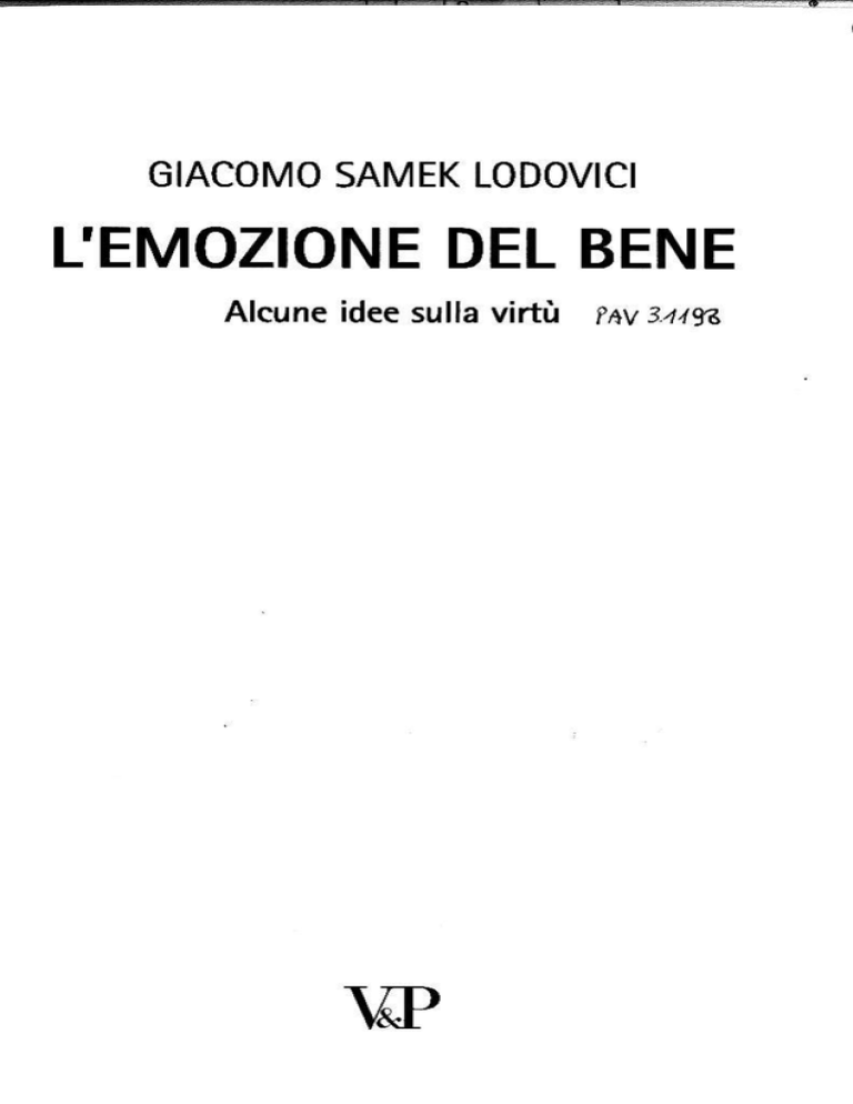 GIACOMO SAMEK LODOVICI L'EMOZIONE DEL BENE Alcune idee sulla virtù ?hv 34.tyd I l- I I _t-;i- I ii INDICE Un'operazione antiquaria e repressira? Anticipazione del perco$o Qualche awertenza RingraziaÌn entì P-tr.hé un'efiea E nccessario thIa ùtìt? La 'sratus quaestimi;' un'telos'delle norme Presernre l'amore e I'amicizia I-e nonne etiche non basrano per asire bene Prender e in , on.iderazione il uolo delle emu/ioni ' Mettere in luce I'importanza dclla comunirà Il punto di vista della prima persona In sintesi: un'etica delle virtir II. 3 3 5 I t1 18 l9 20 23 Excurìr$: sensazioni co)poree, umoí, emozioni, sentimeÌìti Differenzc tra emozioni e sentimenti Un rentarivu di !dlura/ione .iell emo/iunalismo l,e emozioni supportano la ragion prarica morale k emozioni support.1rÌo la ngione reorctica Non bisogna abdicare alle emozioni Rcgolazione d€lìe emozioni Il cuore ha sempre ragione? La vii ru è I amonia lld \olonrà c pa$ioni 'Jgrone. Cenni sulla libcrtà l,a cogitati\a Obiezioni dei deontologi alle emozioni llI. XI XI xVI XIX XX Il sogctf,.r one totalità 43 4J 49 54 69 77 82 84 88 91 Soggetto conìe totalità o come fascio di emo,ioni/percezn,ni? 91 q6 Le azioni non sono ìnelate ln dimensionc etica dell'esistenza: dove si coloca to spazio delle viÍù? l0l -l \'I VII lY. Ontokgia ddla xirtù Facollà, capacità, traÍi del carattere, attitudini, aÍeggiamenti L -unilonnir/- dclta viflu Il "fine" dell'agire virtuoso Lc condìzioni dett'azione virtuosa e it "giusto mezzo" l,a mlùtazione morale dell'agire (e it peso deÌe conseguenze) Valore e merito degli atti virtuosi Sponuneitn e piace!olezza dell agire virruoso Il nesso tl? vil.tù e felicità La virtù come artuàzione perfeuiya Parlàre di virtù implica inroleranza? La bellezzà deÌla virtù Educazione al bello e viftù Le viftrì dianoetiche e I'eticità dei loro aÍi Y. \4. V rù cone 'oút) únori.\' Pnmaro gen.ú, o e immanenTa delt dmore in oSni passione e in ogni azione I criten dell''ordo anorit' La \rrti come ' nào aùùìi Amore di séldegli altri: qììale ha ta precedenza? Egoismo o altruismo dett'erica della virtù? Vìrtù e amore di Dio Incìinazioni, virtù e nolane delta tegg€ naturale La ?hnln sis' Ragion pEtica virtuosa e nonne Identità e anività della ngion pratica virtuosa Gli atd specilìci della pÀrorurir W. I silrgirno frattn e b uù1ù Il sillogismo pratico det temperame, dell'inrempemnte e dell'incontinente Il rapporto virtù etiche-y'Àma?Jù e l.unit.ì delte viÌtù \,Jl. IX. 107 t\'l 110 112 11.1 tl6 Ì19 t22 t2ú 131 132 135 140 147 l5t 15Ì 154 156 r67 170 171 tt7 181 181 189 195 t9? 198 201 i tîattí dd ca:rauere? Al.une obiezioni dzl situaz.ionirmo Alcune obiezioni della psicotogia sociaÌe Le disposizioni esistono 209 Cone sì iruliuirluano e .one na.'.ono Ie l)irtù e t, azioni ui,tuose? Breve feromenologia dell'universalismo etico 2r7 Esistono 209 211 218 Cenesi delÌa conoscenza moml€, del ragionamento pratico e delÌe zzioni virtuose 229 cenesi delb condotta virtuosa Cli ostacoli all'acquìsizione delle virtù e all'apprensione dei principi morali L'influsso della relazione intersoggetti\a, delt'educazione e delle comunilà 219 Bìbliografla 253 255 265