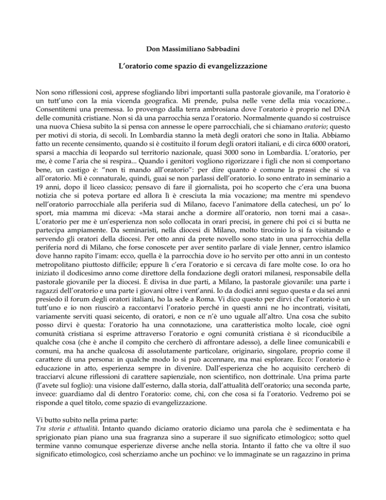 Don Massimiliano Sabbadini L’oratorio come spazio di evangelizzazione Non sono riflessioni così, apprese sfogliando libri importanti sulla pastorale giovanile, ma l’oratorio è un tutt’uno con la mia vicenda geografica. Mi prende, pulsa nelle vene della mia vocazione... Consentitemi una premessa. Io provengo dalla terra ambrosiana dove l’oratorio è proprio nel DNA delle comunità cristiane. Non si dà una parrocchia senza l’oratorio. Normalmente quando si costruisce una nuova Chiesa subito la si pensa con annesse le opere parrocchiali, che si chiamano oratorio; questo per motivi di storia, di secoli. In Lombardia stanno la metà degli oratori che sono in Italia. Abbiamo fatto un recente censimento, quando si è costituito il forum degli oratori italiani, e di circa 6000 oratori, sparsi a macchia di leopardo sul territorio nazionale, quasi 3000 sono in Lombardia. L’oratorio, per me, è come l’aria che si respira... Quando i genitori vogliono rigorizzare i figli che non si comportano bene, un castigo è: “non ti mando all’oratorio”: per dire quanto è comune la prassi che si va all’oratorio. Mi è connaturale, quindi, guai se non parlassi dell’oratorio. Io sono entrato in seminario a 19 anni, dopo il liceo classico; pensavo di fare il giornalista, poi ho scoperto che c’era una buona notizia che si poteva portare ed allora lì è cresciuta la mia vocazione; ma mentre mi spendevo nell’oratorio parrocchiale alla periferia sud di Milano, facevo l’animatore della catechesi, un po’ lo sport, mia mamma mi diceva: «Ma starai anche a dormire all’oratorio, non torni mai a casa». L’oratorio per me è un’esperienza non solo collocata in orari precisi, in genere chi poi ci si butta ne partecipa ampiamente. Da seminaristi, nella diocesi di Milano, molto tirocinio lo si fa visitando e servendo gli oratori della diocesi. Per otto anni da prete novello sono stato in una parrocchia della periferia nord di Milano, che forse conoscete per aver sentito parlare di viale Jenner, centro islamico dove hanno rapito l’imam: ecco, quella è la parrocchia dove io ho servito per otto anni in un contesto metropolitano piuttosto difficile; eppure lì c’era l’oratorio e si cercava di fare molte cose. Io ora ho iniziato il dodicesimo anno come direttore della fondazione degli oratori milanesi, responsabile della pastorale giovanile per la diocesi. È divisa in due parti, a Milano, la pastorale giovanile: una parte i ragazzi dell’oratorio e una parte i giovani oltre i vent’anni. Io da dodici anni seguo questa e da sei anni presiedo il forum degli oratori italiani, ho la sede a Roma. Vi dico questo per dirvi che l’oratorio è un tutt’uno e io non riuscirò a raccontarvi l’oratorio perché in questi anni ne ho incontrati, visitati, variamente serviti quasi seicento, di oratori, e non ce n’è uno uguale all’altro. Una cosa che subito posso dirvi è questa: l’oratorio ha una connotazione, una caratteristica molto locale, cioè ogni comunità cristiana si esprime attraverso l’oratorio e ogni comunità cristiana è sì riconducibile a qualche cosa (che è anche il compito che cercherò di affrontare adesso), a delle linee comunicabili e comuni, ma ha anche qualcosa di assolutamente particolare, originario, singolare, proprio come il carattere di una persona: in qualche modo lo si può accennare, ma mai esplorare. Ecco: l’oratorio è educazione in atto, esperienza sempre in divenire. Dall’esperienza che ho acquisito cercherò di tracciarvi alcune riflessioni di carattere sapienziale, non scientifico, non dottrinale. Una prima parte (l’avete sul foglio): una visione dall’esterno, dalla storia, dall’attualità dell’oratorio; una seconda parte, invece: guardiamo dal di dentro l’oratorio: come, chi, con che cosa si fa l’oratorio. Vedremo poi se risponde a quel titolo, come spazio di evangelizzazione. Vi butto subito nella prima parte: Tra storia e attualità. Intanto quando diciamo oratorio diciamo una parola che è sedimentata e ha sprigionato pian piano una sua fragranza sino a superare il suo significato etimologico; sotto quel termine vanno comunque esperienze diverse anche nella storia. Intanto il fatto che va oltre il suo significato etimologico, così scherziamo anche un pochino: ve lo immaginate se un ragazzino in prima media andasse a chiamare il suo coetaneo in bicicletta e gli dicesse: “Andiamo al pregatorio”: non funzionerebbe tanto, vero? “Andiamo all’oratorio” funziona. Di per sé oratorio vuol dire pregatorio. E a me ha colpito una cosa. Alla televisione, se avete in mente quando ci sono state le Olimpiadi invernali, la cerimonia di chiusura. C’era questa grande cerimonia; ad un certo punto la banda suonava le note di Azzurro. “Sembra quand’ero all’oratorio con tanto sole tanti anni fa, quelle domeniche da solo in un cortile a passeggiar”: Celentano cantava così tanti anni fa; e a me ha colpito che, intanto, era una cosa in mondovisione; le note erano di una canzone in cui si accennava all’oratorio e si vedevano gli spettatori giapponesi che facevano andar le labbra al suono della canzone Azzurro; quindi c’è qualcosa nell’immaginario collettivo, fa parte ormai del lessico che dall’Italia va nel mondo, la parola oratorio. Però cosa ci sta dentro davvero è importante, perché talvolta sembra di dire una cosa comune ed invece ci sono esperienze le più varie, le più diverse, anche connotazioni con accentuazioni giustamente diversificate. Intanto la storia: Sapete che prima di chiamarsi oratorio, San Carlo Borromeo nei tempi della cosiddetta controriforma, avviò un grosso compito di sensibilizzazione delle comunità cristiane, richiamando i preti e i vescovi a risiedere presso le loro comunità e a occuparsi dell’educazione delle giovani generazioni; e inventò, affidandole a quella che poi divenne una congregazione religiosa, ma vide da subito la partecipazione di molti laici (l’oratorio è da sempre il c