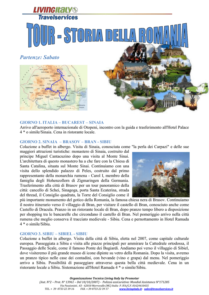 Partenze: Sabato GIORNO 1. ITALIA – BUCAREST – SINAIA Arrivo all'aeroporto internazionale di Otopeni, incontro con la guida e trasferimento all'Hotel Palace 4 * o simile/Sinaia. Cena in ristorante locale. GIORNO 2. SINAIA – BRASOV – BRAN - SIBIU Colazione a buffet in albergo. Visita di Sinaia, conosciuta come "la perla dei Carpazi" e delle sue maggiori attrazioni turistiche: monastero di Sinaia, costruito dal principe Miguel Cantacuzino dopo una visita al Monte Sinai. L'architettura di questo monastero ha a che fare con la Chiesa di Santa Catalina, situata sul Monte Sinai. Continuiamo con una visita dello splendido palazzo di Peles, costruito dal primo rappresentante della monarchia rumena - Carol I, membro della famiglia degli Hohenzollern di Zigmaringen della Germania. Trasferimento alla città di Brasov per un tour panoramico della città: cancello di Schei, Sinagoga, porta Santa Ecaterina, strada del thread, il Consiglio quadrata, la Torre del Consiglio come il più importante monumento del gotico della Romania, la famosa chiesa nera di Brasov. Continuiamo il nostro itinerario verso il villaggio di Bran, per visitare il castello di Bran, conosciuto anche come Castello di Dracula. Pranzo in un ristorante locale di Bran, dopo pranzo tempo libero a disposizione per shopping tra le bancarelle che circondano il castello di Bran. Nel pomeriggio arrivo nella città rumena che meglio conserva il tracciato medievale - Sibiu. Cena e pernottamento in Hotel Ramada 4 * o simile/Sibiu. GIORNO 3. SIBIU – SIBIEL - SIBIU Colazione a buffet in albergo. Visita della città di Sibiu, eletta nel 2007, come capitale culturale europea. Passeggiata a Sibiu e visita alle piazze principali per ammirare la Cattedrale ortodossa, il Passaggio delle Scale, come il famoso Ponte dei Bugiardi. Andiamo poi verso il villaggio di Sibiel, dove visiteremo il più grande museo di icone dipinte su vetro della Romania. Dopo la visita, avremo un pranzo tipico nelle case dei contadini, con bevande (vino e grapa) dal menu. Nel pomeriggio arrivo a Sibiu. Possibilità di passeggiare attraverso questa bella città medievale. Cena in un ristorante locale a Sibiu. Sistemazione all'Hotel Ramada 4 * o simile/Sibiu. Organizzazione Tecnica Living Italy by Promotur (Aut. N°2 – Prot. N° 13961 – Del 10/10/2007) - Polizza assicurativa: Mondial Assistance N°171285 Via Passionisti , 43 - 62010 Morrovalle (MC) Italia P. IVA/C.F. 01624410435 TEL. + 39 0733 22 39 16 FAX. + 39 0733 22 39 17 www.livingitaly.it- [email protected] GIORNO 4. SIBIU – SIGHISOARA – BICAZ – PIATRA NEAMT Colazione a buffet in albergo. Ci dirigemmo verso la città di Sighisoara, l'unica abitata, Cittadella, oggi patrimonio dell'UNESCO e luogo dove nacque il famoso Vlad Impalatore, principe di Valacchia, che ha ispirato la figura di Dracula dal romanzo di Bram. Visitiamo la Torre dell'orologio che ospita il Museo di storia della città di Sighisoara, il Museo di armi medievali, la camera di tortura come la città natale di Dracula oggi un ristorante famoso. Continuiamo il nostro percorso verso la regione della Moldavia, attraverso i Carpazi, più Grande gola della Romania, la gola del fiume Bicaz. Attraverso questa gola possiamo ammirare la bella stazione di Red Lake con il suo bellissimo lago che porta lo stesso nome. Pranzo presso un ristorante locale. Nel pomeriggio arrivo nella città di Piatra Neamt, chiamato "Sinaia moldavo". Piatra Neamt è uno dei più antichi insediamenti rumeni, perché la sua storia risale alla preistoria. Più successivamente è stato fortificato dai primi abitanti della Romania - i Daci. Appare lo s. 2, citato da Tolomeo sotto il nome di Petrodava. Alla fine della s. 14, fu un'importante città commerciale chiamata Piatra lui Craciun. Il periodo di maggior splendore della città era sotto il Regno del famoso capo militare moldavo - Stephen il grande (1457-1504). Cena e pernottamento presso l'Hotel Central Plaza 4 * / Piatra Neamt GIORNO 5. PIATRA NEAMT – BUCOVINA – PIATRA NEAMT Colazione a buffet in albergo. La giornata inizia con una visita della regione della Moldavia, una delle regioni turistiche più rappresentative della Romania. La regione dei monasteri di Bucovina, dichiarata patrimonio dell'UNESCO, sono una delle eredità dell'arte bizantina nel mondo, paragonabile a quelli di Cappadocia Mistra o le meteore. Visiteremo i monasteri di Voronet, Sucevita, Moldovita e Humor come i laboratori di ceramica nera Marginea. Pranzo al ristorante Poasada Bucovina. Nel pomeriggio arrivo a Piatra Neamt. Cena e pernottamento presso l'Hotel Central Plaza 4 * / Piatra Neamt. GIORNO 6. PIATRA NEAMT – MARASESTI - BUCAREST Colazione a buffet in albergo. Uscita per la capitale della Romania - Bucarest, la città di Marasesti, dove visiteremo il più grande ossario della Romania, dove riposano, più di seimila soldati rumeni uccisi nelle battaglie della prima guerra mondiale. Pranzo nel villaggio di Focsani. Nel pomeriggio arrivo a Bucarest. Cena nel ristorante Caru cu Bere. Sistemazione in Hotel Doubletree by Hilton 4 * / Bucarest GIORNO 7. BUCAREST Colazione a buffet in albergo. Intera giornata dedicata alla visita della capitale della Romania. Tour panoramico della: Plaza de la Constitución, la piazza della rivoluzione, Arc de Triomphe, Accademia militare, Chiesa patriarcale e Palazzo del Parlamento - il secondo edificio al mondo dopo il Pentagono. Pranzo in ristorante Jaristea. Pomeriggio libero per lo shopping. Cena di arrivederci con spettacolo folcloristico e bevande dal menu, il ben noto ristorante Pescarus. Sistemazione in Hotel Doubletree by Hilton 4 * / Bucarest. GIORNO 8. BUCAREST – ITALIA Colazione a buffet in albergo. Trasferimento in aeroporto e fine dei nostri servizi. Organizzazione Tecnica Living Italy by Promotur (Aut. N°2 – Prot. N° 13961 – Del 10/10/2007) - Polizza assicurativa: Mondial Assistance N°171285 Via Passionisti , 43 - 62010 Morrovalle (MC) Italia P. IVA/C.F. 01624410435 TEL. + 39 0733 22