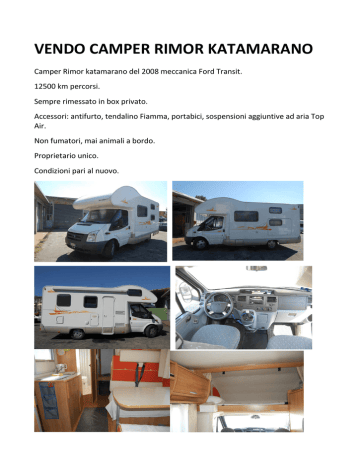 VENDO CAMPER RIMOR KATAMARANO Camper Rimor katamarano del 2008 meccanica Ford Transit. 12500 km percorsi. Sempre rimessato in box privato. Accessori: antifurto, tendalino Fiamma, portabici, sospensioni aggiuntive ad aria Top Air. Non fumatori, mai animali a bordo. Proprietario unico. Condizioni pari al nuovo.