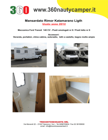 Mansardato Rimor Katamarano Ligth Usato anno 2012 Meccanica Ford Transit 140 CV - Posti omologati nr 6 / Posti letto nr 6 Accessori: Veranda, portabici, clima cabina, autoradio, letti a castello, bagno molto ampio TRECENTOSESSANTA SRL Via Morandi 22 – 21047 Saronno ( Va ) - Tel 0296705834 Fax 02 39195830 email [email protected]