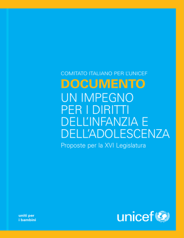 COMITATO ITALIANO PER L’UNICEF DOCUMENTO UN IMPEGNO PER I DIRITTI DELL’INFANZIA E DELL’ADOLESCENZA Proposte per la XVI Legislatura uniti per i bambini UN IMPEGNO PER I DIRITTI DELL’INFANZIA E DELL’ADOLESCENZA Documento "Un impegno per i diritti dell'infanzia e dell'adolescenza" Il Documento è stato presentato ai partiti candidati alle elezioni politiche del 2008. Frutto dell’attività di monitoraggio che il Comitato Italiano per l’UNICEF svolge relativamente ai lavori del Governo e del Parlamento in tema di infanzia e adolescenza, nonché dello studio delle indicazioni internazionali al riguardo, il Documento presenta una serie di proposte per mettere la tutela dei diritti dei bambini e degli adolescenti al centro del programma di Governo. Presentato nel marzo 2008. Sulla base della Convenzione sui diritti dell’infanzia e dei suoi due Protocolli opzionali (uno concernente il coinvolgimento dei bambini nei conflitti armati, l’altro sulla vendita di bambini, la prostituzione dei bambini e la pornografia rappresentante bambini); visto lo Studio globale sulla Violenza sui bambini del 2006 delle Nazioni Unite ed il Rapporto di Follow up del 2007; tenendo presente quanto sottoscritto anche dall’Italia nel documento “Un mondo a misura di bambino” in occasione della Sessione Speciale dell’Assemblea Generale delle Nazioni Unite dedicata all’infanzia (New York, maggio 2002) e di quanto dichiarato nel dicembre 2007 dall’Assemblea Generale a distanza di cinque anni; alla luce delle indicazioni contenute nei Commenti generali del Comitato ONU sui diritti dell’infanzia e delle Raccomandazioni prodotte a seguito delle Giornate annuali di discussione generale del medesimo Comitato; in base a quanto raccomandato all’Italia nelle Osservazioni Conclusive del Comitato ONU sui diritti dell’infanzia e del Comitato ONU contro le discriminazione razziale; valorizzando l’ampio dibattito, i documenti e le azioni comuni che, negli ultimi anni, hanno sempre più caratterizzato l’impegno di quanti nel mondo dell’Associazionismo, del Terzo settore, delle Organizzazioni Non Governative operano con e per i bambini e gli adolescenti; ricordando che i principi del superiore interesse, dell’ascolto, della partecipazione del bambino, della non discriminazione, del diritto alla vita alla sopravvivenza e allo sviluppo, nella sopra citata Convenzione, dovrebbero guidare l’applicazione dei diritti in essa sanciti; apprezzando l’impegno assunto dalla Commissione europea di giungere ad una Strategia globale europea per promuovere i diritti dei bambini e degli adolescenti e accogliendo positivamente l’approvazione da parte del Parlamento europeo della Risoluzione verso una Strategia dell’Unione europea sui diritti dei bambini e degli adolescenti, 3 ricordando che quest’anno l’Italia deve presentare al Comitato ONU sui diritti dell’infanzia il Rapporto sullo stato di attuazione della Convenzione sui diritti dell’infanzia e come questo esercizio rivesta un’importanza fondamentale nella valutazione delle attività sin qui intraprese; il Comitato Italiano per l’UNICEF propone di inserire nel prossimo programma di Governo e nelle attività del prossimo Parlamento i seguenti punti a favore di una piena attuazione dei diritti dei bambini e degli adolescenti e degli impegni sottoscritti dal nostro Paese. 4 MISURE GENERALI DI APPLICAZIONE LEGISLAZIONE La legislazione italiana risulta essere copiosa e sostanzialmente attenta alla promozione e tutela dei diritti dell’infanzia e dell’adolescenza. D’altra parte, si riscontra un forte divario tra gli impegni formalmente assunti dall’Italia (anche in sede internazionale e sovranazionale) e l’applicazione della normativa stessa. Si constata nelle ultime legislature, specie in taluni ambiti (come in materia di diritto d’asilo o relativamente all’istituzione di un Garante nazionale sui diritti dell’infanzia e dell’adolescenza o all’introduzione del reato di tortura nel nostro codice penale), il lento procedere dell’iter dei relativi disegni di legge, che restano fermi in seno alle Commissioni competenti per l’esame, senza spesso giungere nemmeno in aula. Si auspica perciò che il Governo e il Parlamento mantengano alta l’attenzione sulle tematiche riguardanti la promozione e protezione dei diritti dell’infanzia e dell’adolescenza e adempiano ai doveri derivanti dalla ratifica e/o la sottoscrizione dei Trattati e dei Documenti internazionali e sovranazionali in materia, assicurandone altresì l’effettiva applicazione ed il monitoraggio. In particolare si propone che venga data priorità: 1. 2. 3. 4. 5. all’istituzione di un Garante nazionale indipendente per la promozione e la tutela dei diritti dell’infanzia e dell’adolescenza; alla modifica della Legge 189/2002 (cd. Legge Bossi-Fini) come a quella sulla cittadinanza e all’approvazione di una legge organica in materia di diritto di asilo, in conformità agli standard sanciti dal diritto internazionale ed europeo; alla ratifica della Convenzione internazionale sui diritti delle persone con disabilità e del relativo Protocollo opzionale; alla ratifica della Convenzione n.197 del Consiglio d’Europa sulla lotta contro la tratta degli esseri umani (entrata in vigore il 1-2-2008); alla ratifica del Protocollo n.12 (sul tema della non discriminazione) alla Convenzione europea per la salvaguardia dei diritti dell’uomo e delle libertà fondamentali; 5 6. 7. alla ratifica della Convenzione del Consiglio d’Europa sullo stato giuridico dei figli nati fuori dal matrimonio e alla modifica delle norme del codice civile relativamente all’uguaglianza nei diritti successorii dei figli naturali e dei figli legittimi; alla piena e uniforme attuazione su tutto il territorio nazionale della legge 149/2001 per quanto attiene il superamento del ricovero in istituto. RISORSE Il Comitato ONU sui diritti dell’infanzia nel Commento generale n.5 dedicato alle 