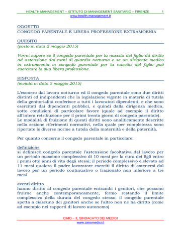 HEALTH MANAGEMENT – ISTITUTO DI MANAGEMENT SANITARIO – FIRENZE www.health-management.it 1 OGGETTO CONGEDO PARENTALE E LIBERA PROFESSIONE EXTRAMOENIA QUESITO (posto in data 2 maggio 2015) Vorrei sapere se il congedo parentale per la nascita del figlio dà diritto ad astensione dai turni di guardia notturna e se un dirigente medico in extramoenia in congedo parentale per la nascita del figlio può esercitare la sua libera professione. RISPOSTA (inviata in data 5 maggio 2015) L’esonero dal lavoro notturno ed il congedo parentale sono due diritti distinti ed indipendenti che la legislazione vigente in materia di tutela della genitorialità conferisce a tutti i lavoratori dipendenti, e che sono esercitati dai dipendenti pubblici, e quindi dalla dirigenza medica, sotto condizioni di particolare favore (quale ad esempio il diritto all’intera retribuzione per il primi trenta giorni di congedo parentale). Le modalità di fruizione di questi diritti sono analiticamente descritte nella sezione riferimenti normativi, nella quale per completezza sono riportate le diverse norme a tutela della maternità e della paternità. Per quanto concerne il congedo parentale in particolare: definizione si definisce congedo parentale l’astensione facoltativa dal lavoro per un periodo massimo complessivo di 10 mesi per la cura dei figli entro i primi otto anni di vita degli stessi; il periodo complessivo è elevato ad 11 mesi qualora il padre lavoratore eserciti il diritto di astenersi dal lavoro per un periodo continuativo o frazionato non inferiore a tre mesi aventi diritto hanno diritto al congedo parentale entrambi i genitori, che possono fruirne anche contemporaneamente, fermo restando il limite complessivo della durata del congedo stesso; il congedo parentale spetta a ciascuno dei genitori anche se l’altro non ne ha diritto (come ad esempio nei rapporti di lavoro autonomo) CIMO – IL SINDACATO DEI MEDICI www.cimomedici.it HEALTH MANAGEMENT – ISTITUTO DI MANAGEMENT SANITARIO – FIRENZE www.health-management.it 2 modalità di fruizione il congedo può essere fruito in modo continuativo o frazionato, fermo restando il limite complessivo della sua durata; la richiesta di congedo parentale non è soggetta a valutazione discrezionale da parte del datore di lavoro, al quale deve essere presentata istanza corredata dalla seguente documentazione: - certificato di nascita del figlio per il quale si chiede il congedo: - dichiarazione (non autenticata) dell’altro genitore dalla quale risulti il periodo di congedo eventualmente già fruito per lo stesso figlio o la condizione di non avente diritto; - dichiarazione (non autenticata) del richiedente dalla quale risulti il periodo di congedo eventualmente già fruito per lo stesso figlio - l’impegno di entrambi i genitori a comunicare successive variazioni I dipendenti privati devono presentare istanza sia al datore di lavoro che all’INPS, utilizzando la modalità telematica resa disponibile sul sito istituzionale dell’INPS. L’istanza di fruizione del congedo parentale deve essere presentata almeno quindici giorni prima della data di inizio del periodo prescelto, salvo casi di oggettiva impossibilità, nei quali è l’istanza può essere presentata 48 ore prima della stessa data. trattamento economico - entro i primi tre anni di vita del bambino per il periodo di congedo spetta una indennità pari al 30% della retribuzione, calcolata considerando la retribuzione del mese precedente l’inizio del periodo indennizzabile; per i dirigenti medici, per i primi 30 giorni spetta l’intera retribuzione; - da tre anni e un giorno a otto anni di vita del bambino se non è stato fruito nei primi tre anni l’intero periodo disponibile spetta il 30% della retribuzione solo se il reddito individuale del genitore richiedente risulta inferiore a 2,5 volte l'importo annuo del trattamento minimo di pensione. trattamento giuridico e previdenziale - il periodo di congedo parentale è utile ai fini della maturazione dell’anzianità di servizio, ma non è utile ai fini della maturazione delle ferie (salvo i primi 30 giorni per i dirigenti medici); - il periodo di congedo parentale è soggetto a contribuzione figurativa ridotta, integrabile su base volontaria a richiesta dell’interessato CIMO – IL SINDACATO DEI MEDICI www.cimomedici.it HEALTH MANAGEMENT – ISTITUTO DI MANAGEMENT SANITARIO – FIRENZE www.health-management.it 3 Per quanto concerne l’esonero dal lavoro notturno si applica l’articolo 53 del decreto legislativo 26 marzo 2001, n. 151, che testualmente dispone: Articolo 53. Lavoro notturno 1. periodo in cui è vietato adibire le donne al lavoro notturno È vietato adibire le donne al lavoro, dalle ore 24 alle ore 6, dall'accertamento dello stato di gravidanza fino al compimento di un anno di età del bambino. 2. periodo in cui i genitori non sono obbligati al lavoro notturno Non sono obbligati a prestare lavoro notturno: a) la lavoratrice madre di un figlio di età inferiore a tre anni o, in alternativa, il lavoratore padre convivente con la stessa; b) la lavoratrice o il lavoratore che sia l'unico genitore affidatario di un figlio convivente di età inferiore a dodici anni. Per quanto concerne la seconda questione, la possibilità di esercitare l’attività libero professionale extramoenia per un dirigente a rapporto non esclusivo durante i periodi di congedo parentale, personalmente ritengo di sì, ma al riguardo si riscontrano opinioni ed interpretazioni non univoche. La lettura che induce a ritenere l’esercizio dell’attività libero professionale extramoenia compatibile con la fruizione del congedo parentale scaturisce dalla natura del rapporto di lavoro non esclusivo così come questa è definita dalla normativa vigente. L’articolo 15-sexies del decreto legislativo 30 dicembre 1992, n. 502, precisa che l’opzione per il rapporto non esclusivo comporta la totale disponibilità nell'ambito dell'impegno di servizio, per la realizzazione 