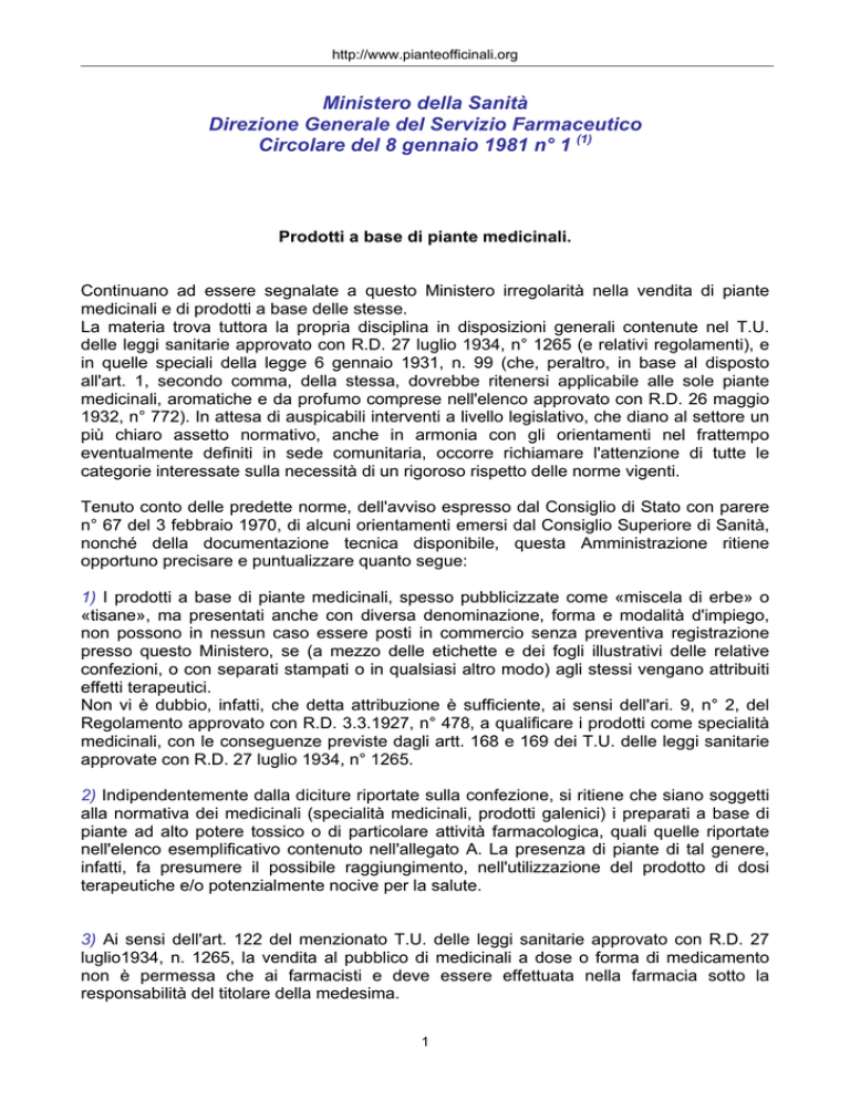 http://www.pianteofficinali.org Ministero della Sanità Direzione Generale del Servizio Farmaceutico Circolare del 8 gennaio 1981 n° 1 (1) Prodotti a base di piante medicinali. Continuano ad essere segnalate a questo Ministero irregolarità nella vendita di piante medicinali e di prodotti a base delle stesse. La materia trova tuttora la propria disciplina in disposizioni generali contenute nel T.U. delle leggi sanitarie approvato con R.D. 27 luglio 1934, n° 1265 (e relativi regolamenti), e in quelle speciali della legge 6 gennaio 1931, n. 99 (che, peraltro, in base al disposto all'art. 1, secondo comma, della stessa, dovrebbe ritenersi applicabile alle sole piante medicinali, aromatiche e da profumo comprese nell'elenco approvato con R.D. 26 maggio 1932, n° 772). In attesa di auspicabili interventi a livello legislativo, che diano al settore un più chiaro assetto normativo, anche in armonia con gli orientamenti nel frattempo eventualmente definiti in sede comunitaria, occorre richiamare l'attenzione di tutte le categorie interessate sulla necessità di un rigoroso rispetto delle norme vigenti. Tenuto conto delle predette norme, dell'avviso espresso dal Consiglio di Stato con parere n° 67 del 3 febbraio 1970, di alcuni orientamenti emersi dal Consiglio Superiore di Sanità, nonché della documentazione tecnica disponibile, questa Amministrazione ritiene opportuno precisare e puntualizzare quanto segue: 1) I prodotti a base di piante medicinali, spesso pubblicizzate come «miscela di erbe» o «tisane», ma presentati anche con diversa denominazione, forma e modalità d'impiego, non possono in nessun caso essere posti in commercio senza preventiva registrazione presso questo Ministero, se (a mezzo delle etichette e dei fogli illustrativi delle relative confezioni, o con separati stampati o in qualsiasi altro modo) agli stessi vengano attribuiti effetti terapeutici. Non vi è dubbio, infatti, che detta attribuzione è sufficiente, ai sensi dell'ari. 9, n° 2, del Regolamento approvato con R.D. 3.3.1927, n° 478, a qualificare i prodotti come specialità medicinali, con le conseguenze previste dagli artt. 168 e 169 dei T.U. delle leggi sanitarie approvate con R.D. 27 luglio 1934, n° 1265. 2) Indipendentemente dalla diciture riportate sulla confezione, si ritiene che siano soggetti alla normativa dei medicinali (specialità medicinali, prodotti galenici) i preparati a base di piante ad alto potere tossico o di particolare attività farmacologica, quali quelle riportate nell'elenco esemplificativo contenuto nell'allegato A. La presenza di piante di tal genere, infatti, fa presumere il possibile raggiungimento, nell'utilizzazione del prodotto di dosi terapeutiche e/o potenzialmente nocive per la salute. 3) Ai sensi dell'art. 122 del menzionato T.U. delle leggi sanitarie approvato con R.D. 27 luglio1934, n. 1265, la vendita al pubblico di medicinali a dose o forma di medicamento non è permessa che ai farmacisti e deve essere effettuata nella farmacia sotto la responsabilità del titolare della medesima. 1 http://www.pianteofficinali.org Soltanto il farmacista, pertanto, può vendere al pubblico i prodotti a base di piante medicinali regolarmente registrati come specialità medicinali, nonché quelli preparati, sotto forma di galenici preconfezionati, da officine farmaceutiche a ciò autorizzate da questo Ministero. Il farmacista è anche autorizzato, oltre a vendere, nel rispetto della vigente normativa, le piante di cui al precedente punto 2) e ogni altra pianta medicinale e officinale, a preparare a dose e forma di medicamento, per la vendita diretta al pubblico nella propria farmacia, prodotti semplici e composti a base di piante medicinali. Tali prodotti, peraltro, non devono essere sigillati, non devono avere nome speciale costituente marchio di fabbrica, non devono essere oggetto di pubblicità, in qualsiasi modo o sotto qualsiasi forma effettuata; altrimenti, essi ricadrebbero sotto, le disposizioni concernenti le specialità medicinali (v. articolo 10 deI Regolamento approvato con R.D. 3 marzo 1927, n° 478). 4) L'area delle piante medicinali vendibili fuori di farmacia deve essere, invece, indi viduata nel gruppo delle piante suscettibili di impieghi diversi da quello terapeutico, largamente acquistata da tempo nell'uso domestico, nell'alimentazione, nella correzione organolettica dei cibi, ecc., talora in grado di operare qualche intervento favorente le funzioni fisiologiche dell'organismo e ritenute, comunque, innocue. Nell'allegato B è riportato, ancora in via esemplificativa, un elenco di piante medicinali, aromatiche e da profumo che, ad avviso di questa Amministrazione, possono essere vendute anche fuori di farmacia e, in particolare, nelle erboristerie, nel rispetto, ovviamente, delle vigenti disposizioni sul commercio. 5) Chi è in possesso del diploma di erborista rilasciato dalle apposite scuole istituite presso facoltà universitarie, ai sensi della legge 6 gennaio 1931, n° 99, è inoltre autorizzato a raccogliere «piante officinali» (quali definite dal già menzionato 2° comma dell'art. 1 della predetta legge), nonché a coltivarle e a sottoporle a preparazione industriale. La raccolta di piante officinali è altresì consentita a chi sia munito della «carta d'autorizzazione» rilasciata dalle autorità comunali (v. artt. 1, 2 e 3 della stessa legge n° 99/1931). 6) Agli erboristi non è consentita la miscelazione estemporanea di piante su prescrizione medica o, comunque, per qualsiasi finalità terapeutica. Tanto meno ad essi è consentito di suggerire al cliente rimedi a base di erbe contro malattie o malesseri sintomatici. Pratiche di tal genere esporrebbero l'autore alla irrogazione della sanzione prevista dall'ari. 348 del Codice Penale, per esercizio abusivo della professione di farmacista o di quella di medico, oltre al rischio di subire le ulteriori conseguenze penali e civili dovute all'illegittimo comportamento. 7) Per la registrazione, come specialit