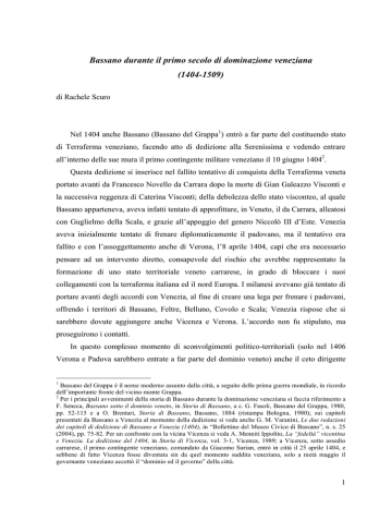 Bassano durante il primo secolo di dominazione veneziana (1404-1509) di Rachele Scuro Nel 1404 anche Bassano (Bassano del Grappa1) entrò a far parte del costituendo stato di Terraferma veneziano, facendo atto di dedizione alla Serenissima e vedendo entrare all’interno delle sue mura il primo contingente militare veneziano il 10 giugno 14042. Questa dedizione si inserisce nel fallito tentativo di conquista della Terraferma veneta portato avanti da Francesco Novello da Carrara dopo la morte di Gian Galeazzo Visconti e la successiva reggenza di Caterina Visconti; della debolezza dello stato visconteo, al quale Bassano apparteneva, aveva infatti tentato di approfittare, in Veneto, il da Carrara, alleatosi con Guglielmo della Scala, e grazie all’appoggio del genero Niccolò III d’Este. Venezia aveva inizialmente tentato di frenare diplomaticamente il padovano, ma il tentativo era fallito e con l’assoggettamento anche di Verona, l’8 aprile 1404, capì che era necessario pensare ad un intervento diretto, consapevole del rischio che avrebbe rappresentato la formazione di uno stato territoriale veneto carrarese, in grado di bloccare i suoi collegamenti con la terraferma italiana ed il nord Europa. I milanesi avevano già tentato di portare avanti degli accordi con Venezia, al fine di creare una lega per frenare i padovani, offrendo i territori di Bassano, Feltre, Belluno, Covolo e Scala; Venezia rispose che si sarebbero dovute aggiungere anche Vicenza e Verona. L’accordo non fu stipulato, ma proseguirono i contatti. In questo complesso momento di sconvolgimenti politico-territoriali (solo nel 1406 Verona e Padova sarebbero entrate a far parte del dominio veneto) anche il ceto dirigente 1 Bassano del Grappa è il nome moderno assunto dalla città, a seguito delle prima guerra mondiale, in ricordo dell’importante fronte del vicino monte Grappa. 2 Per i principali avvenimenti della storia di Bassano durante la dominazione veneziana si faccia riferimento a F. Seneca, Bassano sotto il dominio veneto, in Storia di Bassano, a c. G. Fasoli, Bassano del Grappa, 1980, pp. 52-115 e a O. Brentari, Storia di Bassano, Bassano, 1884 (ristampa Bologna, 1980); sui capitoli presentati da Bassano a Venezia al momento della dedizione si veda anche G. M. Varanini, Le due redazioni dei capitoli di dedizione di Bassano a Venezia (1404), in “Bollettino del Museo Civico di Bassano”, n. s. 25 (2004), pp. 75-82. Per un confronto con la vicina Vicenza si veda A. Menniti Ippolito, La “fedeltà” vicentina e Venezia. La dedizione del 1404, in Storia di Vicenza, vol. 3-1, Vicenza, 1989; a Vicenza, sotto assedio carrarese, il primo contingente veneziano, comandato da Giacomo Surian, entrò in città il 25 aprile 1404, e sebbene di fatto Vicenza fosse diventata sin da quel momento suddita veneziana, solo a metà maggio il governante veneziano accettò il “dominio ed il governo” della città. 1 bassanese dovette ritenere più saggio seguire l’esempio vicentino e presentare una propria spontanea dedizione a Venezia, la quale aveva certamente interesse per tale territorio, confinante con Treviso, che la Serenissima deteneva, ad eccezione di un breve intervallo, sin dal 1339. All’indomani dell’entrata a Bassano dei veneziani, i bassanesi erano dunque pronti a presentare i loro capitoli di dedizione; si noti che in tali capitoli si faccia comunque esplicito riferimento alla positività del dominio visconteo3 –malgrado ci si stesse rivolgendo alla nuova dominante– tanto che gli stessi bassanesi dichiaravano, in una delle versioni degli stessi capitoli, che il nuovo assoggettamento era possibile esclusivamente perché se ne aveva avuta facoltà da Caterina Visconti4. Probabilmente i bassanesi erano consapevoli del loro futuro destino politico-territoriale, che comunque i milanesi avevano ormai assegnato a Venezia, e preferirono allearsi in posizione di forza sin da subito con la Serenissima, favoriti da una più spendibile dedizione volontaria. Il secondo termine temporale che definisce il periodo preso in esame dalla ricerca qui proposta è il 1509, quando, com’è noto, a seguito della sconfitta veneziana contro i francesi ad Agnadello, le forze imperiali della lega di Cambrai occuparono le città della Terraferma veneta, appoggiate dai locali ceti nobiliari, che nel tentativo di riprendere un antico status e potere avevano fatto dedizione all’imperatore. L’anno 1509 segna dunque una cesura all’interno della dominazione veneziana di Bassano. Malgrado la presenza degli imperiali sul territorio, durata pochi mesi e conclusasi il 23 novembre 1509, rappresenti un intervallo veramente breve all’interno dei quattro secoli di dominio veneto, tuttavia come nel resto della Terraferma fu necessario un tempo più lungo per ritornare alla normalità: nove anni di altalena di occupazioni militari, conquiste e perdite che caratterizzarono lo svolgersi degli eventi sino al 1518 ed alla pace stipulata il 31 luglio di quell’anno. Il 1509 è stato dunque assunto come data ante quem nell’impostazione di questa ricerca, potendo così delimitare in modo netto il primo secolo della dominazione veneziana. Tornando al momento della dedizione bassanese a Venezia, va sottolineato il particolare status che Bassano riuscì ad ottenere rispetto ad altre località dalle caratteristiche simili della Terraferma Veneta, quali Monselice, Castelfranco (Castelfranco Veneto) o Conegliano. Bassano va senza dubbio annoverata fra quelle che, a partire da 3 Si veda Varanini, Le due redazioni, p. 77. Ibid., p. 80, in cui è riportata la trascrizione di due delle versioni dei capitoli di dedizioni, in una di esse, conservata presso il Museo Biblioteca Archivio di Bassano del Grappa, Atti del Consiglio, reg. 4/2, cc. 40r41r, si esplicita: “Primo. Comune et homines Bassani dum habita fuerit licentia ab illustrissima domina sua domina ducissa Mediolani et cetera offerunt se fore ac esse intendunt fidelissimos et constantes servi