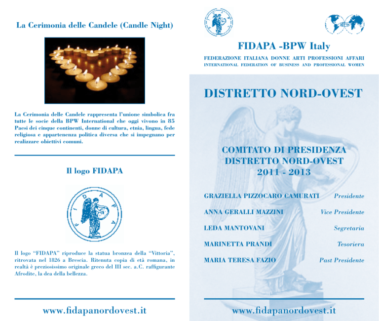 La Cerimonia delle Candele (Candle Night) FIDAPA -BPW Italy FEDERAZIONE ITALIANA DONNE ARTI PROFESSIONI AFFARI INTERNATIONAL FEDERATION OF BUSINESS AND PROFESSIONAL WOMEN DISTRETTO NORD-OVEST La Cerimonia delle Candele rappresenta l’unione simbolica fra tutte le socie della BPW International che oggi vivono in 85 Paesi dei cinque continenti, donne di cultura, etnia, lingua, fede religiosa e appartenenza politica diversa che si impegnano per realizzare obiettivi comuni. Il logo FIDAPA COMITATO DI PRESIDENZA DISTRETTO NORD-OVEST 2011 - 2013 GRAZIELLA PIZZOCARO CAMURATI ANNA GERALLI MAZZINI LEDA MANTOVANI Presidente Vice Presidente Segretaria MARINETTA PRANDI Il logo “FIDAPA” riproduce la statua bronzea della “Vittoria”, ritrovata nel 1826 a Brescia. Ritenuta copia di età romana, in realtà è preziosissimo originale greco del III sec. a.C. raffigurante Afrodite, la dea della bellezza. www.fidapanordovest.it MARIA TERESA FAZIO Tesoriera Past Presidente www.fidapanordovest.it La F.I.D.A.P.A. – B.P.W. Italy è una associazione che conta in Italia 11.700 socie ed appartiene alla Federazione Internazionale – IFBPW. È articolata in 287 sezioni distribuite su tutto il territorio nazionale, raggruppate in 7 Distretti: Nord-Ovest, Nord-Est, Centro, Sud-Ovest, Sud-Est, Sicilia, Sardegna. Sono organi distrettuali della Federazione: la Presidente Distrettuale, il Comitato di Presidenza Distrettuale, il Consiglio Distrettuale, l’Assemblea Distrettuale, il Collegio dei Revisori dei Conti Distrettuale. Il Distretto Nord-Ovest è composto da 27 Sezioni in 4 Regioni: Piemonte (12) • Alba • Alessandria • Cuneo • Mondovì • Pinerolo • Pino-Chieri • Saluzzo • Torino • Torino Est • Torino Rivoli Val Susa • Torino S. Giovanni • Val Pellice Liguria (9) • Albenga • Genova • Genova Due • Imperia • La Spezia • Loano-Riviera delle Palme • Savona • Sanremo • Tigullio Lombardia (5) • Bergamo • Brescia-Vittoria Alata • Milano • Monza e Brianza • Varese Valle d’Aosta (1) • Aosta Le Regioni del Distretto Nord-Ovest sono: Valle d’Aosta, Piemonte, Liguria, Lombardia. Il Distretto Nord-Ovest nasce nel settembre 1995 al Congresso Nazionale di Roma, in ottemperanza al voto del Consiglio Nazionale che, durante il Convegno di Alghero dell’anno precedente, aveva sancito la suddivisione in due (Nord-Est e Nord-Ovest) del Distretto NORD, composto da ben 8 regioni, e perciò troppo vasto. L’Assemblea elesse quale prima Presidente del Nord Ovest Luisa Pavesio Mosso. CENNI STORICI La FIDAPA (Federazione Italiana Donne Arti Professioni Affari) fu costituita dai Circoli “Donne Artiste e Laureate” di Roma, di Milano e di Napoli nel 1930. Prima Presidente Nazionale fu la la prof.ssa Maria Castellani che aveva conosciuto la dott.ssa Lena Madesin Phillips Presidente fondatrice della FBPW degli Stati Uniti d’America, condividendone gli scopi e le idee; la presidente Castellani condivideva anche la struttura organizzativa della Federazione degli Stati Uniti perché associava le donne impengate nelle più diverse attività ed aveva assorbito le Associazioni di categoria per un’attività comune di più ampio respiro in difesa dei diritti delle donne nel lavoro e nella società. Nell’agosto del 1930, fu tenuto a Ginevra il I congresso internazionale delle donne impegnate negli affari e nelle professioni. Alla fine del congresso fu costituita la International Federation of Business and Professional Women “per la loro emancipazione e la partecipazione negli ambienti sociali del loro Paese ed anche per instaurare rapporti di collaborazione e di amicizia”. La Seconda Guerra Mondiale, scoppiata in Italia nel 1940, portò allo scioglimento della Federazione italiana che fu ricostrituita il 14 febbraio 1945 a Roma. Il successo di attività e proselitismo è stato continuo fino a raggiungere attualmente il numero di 287 sezioni presenti sul territorio nazionale. SCOPI E FINALITÀ Lo Statuto: adottato nel 1930 è stato modificato alla ricostituizione della FIDAPA nel 1945 a Roma, nel 1975 a Santa Margherita Ligure, nel 1983 e nel 1989 a Firenze, nel 2000 a Taormina e nel 2010 a Roma. Scopi e finalità: la FIDAPA è un movimento di opinioni indipendente; non ha scopi di lucro, persegue i suoi obiettivi senza distinzione di etnia, lingua e religione. La Federazione ha lo scopo di promuovere, coordinare e sostenere le iniziative delle donne che operano nel campo delle Arti, delle Professioni e degli Affari. Per raggiungere tale scopo si propone di: • valorizzare le competenze e la preparazione delle socie; • incoraggiare le donne ad una consapevole partecipazione alla vita sociale, amministrativa e politica; • favorire rapporti amichevoli, reciproca comprensione e proficua collaborazione fra persone di tutto il mondo. TEMA NAZIONALE 2011-2013 “PARTECIPAZIONE E RESPONSABILITÀ PER LO SVILUPPO DELLA CITTADINANZA ATTIVA E SOLIDALE” TEMA INTERNAZIONALE 2011-2013 “ EMPOWERED WOMEN LEADING BUSINESS” BRINDING THE VOICE OF WOMEN TO BUSINESS.
