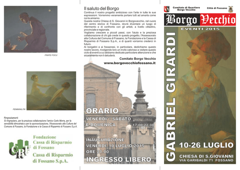 FRATE FOCU Continua il nostro progetto ambizioso con l'arte in tutte le sue espressioni. Vorremmo veramente portare tutti ad amarla come noi la amiamo. Questa nostra Chiesa di S. Giovanni in Borgovecchio, nel cuore del centro storico di Fossano, dovrà diventare un luogo di riferimento e di confronto con gli artisti, a livello cittadino, provinciale e regionale. Vogliamo crescere a piccoli passi, con l'aiuto e la preziosa collaborazione di chi già crede in questo progetto, l'Assessorato alla Cultura del Comune di Fossano, la Fondazione e la Cassa di Risparmio di Fossano S.p.A., e di quanti vorranno crederci in futuro. Ai borgatini e ai fossanesi, in particolare, dedichiamo questo nostro lavoro, rivolgendo loro un invito caloroso a visitare questo ciclo di eventi a cui abbiamo dedicato particolare attenzione e che sicuramente non li deluderà. Comitato Borgo Vecchio www.borgovecchiofossano.it FEMMINILITA‘ ORARIO VENERDI’ - SABATO E DOMENICA 17.00-22.00 INAUGURAZIONE VENERDI’ 10 LUGLIO 2015 ORE 21.00 INGRESSO LIBERO Comitato di Quartiere Borgo Vecchio Città di Fossano Borgo Vecchio EVENTI 2015 GABRIEL GIRARDI Il saluto del Borgo 10-26 LUGLIO CHIESA DI S.GIOVANNI VIA GARIBALDI 71 FOSSANO L’uomo e l’artista LACUSTRE JOLLY Ospitiamo, per la prima volta in Borgo Vecchio, Gabriel GIRARDI, artista Almese, della valle Susa, e il merito lo devo alla carissima compagna di studi Cinzia Ghigliano che qui lo scorso anno ha esposto con successo i suoi lavori. Figlio d’arte, padre e fratelli valenti artisti, ne fa di questa la sua professione. Si ispira ai grandi classici come Courbet, Piero della Francesca, Rembrandt, il Pontormo, reinterpretando la figura in modo straordinariamente personale. Le sensazioni che provo ammirando i suoi lavori sono quelle di una pittura garbata, ordinata, delicata. Aggettivi assolutamente incontestabili e oggettivamente coerenti con tutta la sua produzione artistica dagli anni sessanta ad oggi. “Garbate” sono le figure e il modo con cui sono proposte nelle varie ambientazioni e pose. Personaggi semplici che, seppur prelevati da una passata quotidianità, appaiono, con le loro espressioni e i loro sguardi, stranamente, più che mai attuali. “Ordinate” sono le composizioni, dove la ricerca dell’equilibrio tra forme e volumi sembra essere condizione dominante ed essenziale. “Delicate” sono le tonalità di colore della tavolozza, in una miscellanea morbida e coerente tra primi piani e fondali, così come delicati sono i chiaroscuri, dove la luce, pur necessaria nel contesto compositivo, non è mai invasiva o eccessiva, limitando così il contrasto coloristico finale dell’opera, con un piacevole senso di evanescenza e di trasparenza. Ne risulta una gradevole visione d’insieme che, per merito della sensibilità dell’artista, delle sue grandi capacità nel disegno e dell’uso appropriato delle antiche tecniche pittoriche come la velatura, ci porta indietro nel tempo a una pittura sacrale e monumentale dei grandi cicli pittorici ad affresco. Le numerose mostre personali e collettive, i riconoscimenti avuti a livello nazionale e internazionale, le opere esposte in permanenza in collezioni, musei e palazzi pubblici in Italia e all’estero, le commesse pubbliche per opere in grandi Istituti e Chiese non hanno bisogno di ulteriori commenti sulla genuinità di Gabriel Girardi. La visita in San Giovanni sarà certamente una piacevole rievocazione classica, ma confermerà pure l’assoluta e indiscutibile contemporaneità di quest’artista piemontese. IDILLIO SERENATA Claudio Mana VENDEMMIA NUDO LA MOSSA