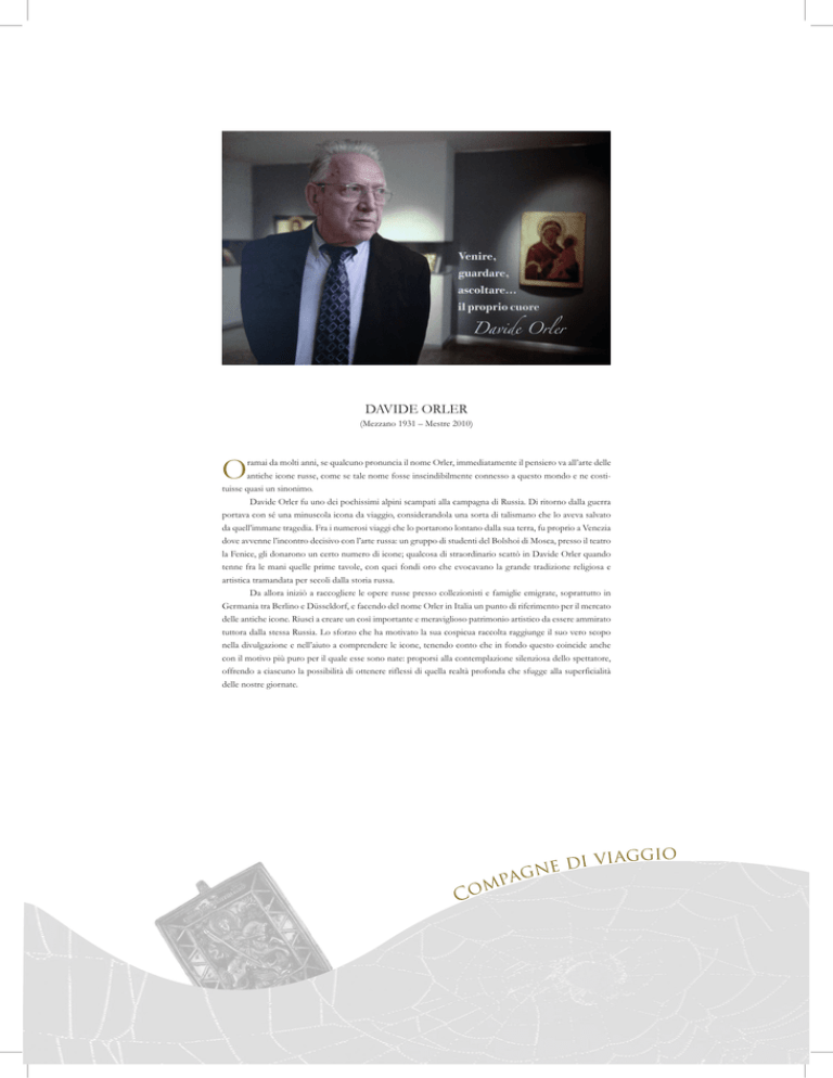 O DAVIDE ORLER (Mezzano 1931 – Mestre 2010) ramai da molti anni, se qualcuno pronuncia il nome Orler, immediatamente il pensiero va all’arte delle antiche icone russe, come se tale nome fosse inscindibilmente connesso a questo mondo e ne costituisse quasi un sinonimo. Davide Orler fu uno dei pochissimi alpini scampati alla campagna di Russia. Di ritorno dalla guerra portava con sé una minuscola icona da viaggio, considerandola una sorta di talismano che lo aveva salvato da quell’immane tragedia. Fra i numerosi viaggi che lo portarono lontano dalla sua terra, fu proprio a Venezia dove avvenne l’incontro decisivo con l’arte russa: un gruppo di studenti del Bolshoi di Mosca, presso il teatro la Fenice, gli donarono un certo numero di icone; qualcosa di straordinario scattò in Davide Orler quando tenne fra le mani quelle prime tavole, con quei fondi oro che evocavano la grande tradizione religiosa e artistica tramandata per secoli dalla storia russa. Da allora iniziò a raccogliere le opere russe presso collezionisti e famiglie emigrate, soprattutto in Germania tra Berlino e Düsseldorf, e facendo del nome Orler in Italia un punto di riferimento per il mercato delle antiche icone. Riuscì a creare un così importante e meraviglioso patrimonio artistico da essere ammirato tuttora dalla stessa Russia. Lo sforzo che ha motivato la sua cospicua raccolta raggiunge il suo vero scopo nella divulgazione e nell’aiuto a comprendere le icone, tenendo conto che in fondo questo coincide anche con il motivo più puro per il quale esse sono nate: proporsi alla contemplazione silenziosa dello spettatore, offrendo a ciascuno la possibilità di ottenere riflessi di quella realtà profonda che sfugge alla superficialità delle nostre giornate. gio g a i v i ed n g pa m Co Ministero dei beni e delle attività culturali e del turismo Compagne di viaggio Icone russe a rilievo. Esemplari in bronzo da collezione privata (XVI –XIX) Mostra in onore di Davide Orler Complesso Monumentale del San Michele a Ripa Grande Via di San Michele 22 Roma 24 giugno - 26 settembre 2016 Con il patrocinio del Centro Russo di Scienza e Cultura a Roma presso: Direzione Generale Archeologia, Belle Arti e Paesaggio Direttore Caterina Bon Valsassina a cura di: Direzione Generale Belle Arti e Paesaggio Direttore Francesco Scoppola in collaborazione con Rettoria del complesso di San Michele a Ripa Rettore Padre Enzo Pacelli Istituto Centrale per la grafica Direttore Maria Antonella Fusco Gallerie Nazionali d’Arte Antica di Roma Direttore Flaminia Gennari Santori e con Direzione Generale Archeologia Direttore Gino Famiglietti Direzione Generale Arte e architettura contemporanee e periferie urbane Direttore Federica Galloni Direzione Generale Musei Direttore Ugo Soragni Direzione Generale Archivi Direttore Mario Guarany Istituto Centrale per il Catalogo e la Documentazione Direttore Laura Moro Istituto Superiore per la Conservazione ed il Restauro Direttore Gisella Capponi Segretariato Regionale per il Lazio Segretario Daniela Porro Soprintendenza Belle Arti e Paesaggio del Comune di Roma Direttore Roberto Banchini Organizzazione: Direzione Generale Belle Arti e Paesaggio Segreteria tecnica Tiziana Biganti Gabriella Sabatini Luisa Tursi Segreteria Direttore Orsola Cascianelli Patrizia Santini Servizio I Dirigente Pia Petrangeli Redazione del Bollettino d’Arte Coordinatore scientifico Lucilla de Lachenal Ufficio controllo di gestione, verifica amministrativo-contabile Antonio Ginanneschi Rossana Coletti Movimentazione Ufficio del Consegnatario Mario Cristo Luigi Fiorenza Gennaro Acanfora Sicurezza Direzione Generale Archeologia Ufficio Tecnico Stefano Ferrante Progetto grafico Donato Lunetti Loredana Francescone Teche e allestimento Istituto Centrale per la grafica Agostino Tropea Documentazione fotografica Istituto Centrale per il Catalogo e la Documentazione Laboratorio fotografico Fabrizio Buratta Collaborazione tecnico-scientifica Gallerie Nazionali d’Arte Antica di Roma-Palazzo Barberini Giorgio Leone, Michele Di Monte Soprintendenza Belle Arti e Paesaggio del Comune di Roma Daniela Barsottini Bibliografia di riferimento I bronzi russi della Collezione Orler, C&M Arte, Archivio Orler, Marcon (Ve). I volti dell’eternità. 150 bronzi dei Vecchi Credenti Russi dalla collezione di Giuseppe Berger, catalogo a cura di Daria Maltseva e Sergio Guiggi, Pontedera, 2005. Catalogo online a cura di: Tiziana Biganti, Loredana Francescone, Donato Lunetti, Gabriella Sabatini, Luisa Tursi gio g a i v i ed n g pa m Co ICONE RUSSE A RILIEVO N ella Russia medievale, croci e icone erano compagne di viaggio nella vita di ogni cristiano, dalla nascita alla morte. Le croci erano usate per pregare e per sperare in un buon augurio, per curare e per essere seppelliti con esse. Erano con- siderate preziosi cimeli di famiglia. Il popolo russo venerava i santi come un sostegno per il paese. In tutto il territorio, infatti, dal Baltico ai confini della Siberia, si pregavano i santi riprodotti sulle icone, nei momenti di gioia e di dolore. Facevano uso delle icone sia gli aderenti al movimento conservatore dei Vecchi Credenti, sia gli ortodossi. Gli originali bronzei erano di piccole dimensioni, il che permetteva il loro spostamento, anche fuori dai confini della Russia. Il repertorio delle immagini proveniva dalle stampe popolari tselebniki (dalla parola tselit ’- guarire), diffuse nella seconda metà del secolo XVIII. I santi più venerati erano Giorgio, Floro, Lauro, Biagio. Tra i martiri si riscontravano con maggiore frequenza Nikita, Giorgio, Teodoro Stratilate, Teodoro di Tiro, Demetrio di Tessalonica, tra gli arcangeli Michele e Sichael. Tra tutti, l’immagine di san Nicola, detta besogon (“colui che espelle i demoni”) ebbe vasta popolarità, testimoniata dal gran numero di croci pettorali, amuleti a forma di serpente e piccole icone sulle quali era raffigurata. A questa si associava l’effigie venerata di san Nicola detto “il Mi