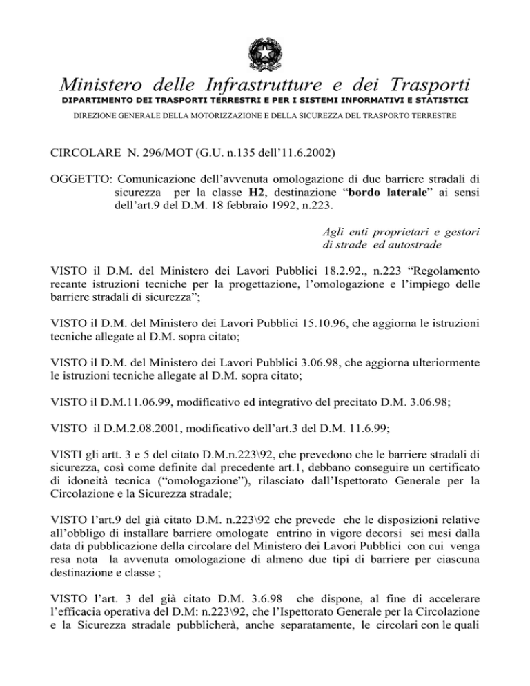 Ministero delle Infrastrutture e dei Trasporti DIPARTIMENTO DEI TRASPORTI TERRESTRI E PER I SISTEMI INFORMATIVI E STATISTICI DIREZIONE GENERALE DELLA MOTORIZZAZIONE E DELLA SICUREZZA DEL TRASPORTO TERRESTRE CIRCOLARE N. 296/MOT (G.U. n.135 dell’11.6.2002) OGGETTO: Comunicazione dell’avvenuta omologazione di due barriere stradali di sicurezza per la classe H2, destinazione “bordo laterale” ai sensi dell’art.9 del D.M. 18 febbraio 1992, n.223. Agli enti proprietari e gestori di strade ed autostrade VISTO il D.M. del Ministero dei Lavori Pubblici 18.2.92., n.223 “Regolamento recante istruzioni tecniche per la progettazione, l’omologazione e l’impiego delle barriere stradali di sicurezza”; VISTO il D.M. del Ministero dei Lavori Pubblici 15.10.96, che aggiorna le istruzioni tecniche allegate al D.M. sopra citato; VISTO il D.M. del Ministero dei Lavori Pubblici 3.06.98, che aggiorna ulteriormente le istruzioni tecniche allegate al D.M. sopra citato; VISTO il D.M.11.06.99, modificativo ed integrativo del precitato D.M. 3.06.98; VISTO il D.M.2.08.2001, modificativo dell’art.3 del D.M. 11.6.99; VISTI gli artt. 3 e 5 del citato D.M.n.223\92, che prevedono che le barriere stradali di sicurezza, così come definite dal precedente art.1, debbano conseguire un certificato di idoneità tecnica (“omologazione”), rilasciato dall’Ispettorato Generale per la Circolazione e la Sicurezza stradale; VISTO l’art.9 del già citato D.M. n.223\92 che prevede che le disposizioni relative all’obbligo di installare barriere omologate entrino in vigore decorsi sei mesi dalla data di pubblicazione della circolare del Ministero dei Lavori Pubblici con cui venga resa nota la avvenuta omologazione di almeno due tipi di barriere per ciascuna destinazione e classe ; VISTO l’art. 3 del già citato D.M. 3.6.98 che dispone, al fine di accelerare l’efficacia operativa del D.M: n.223\92, che l’Ispettorato Generale per la Circolazione e la Sicurezza stradale pubblicherà, anche separatamente, le circolari con le quali Ministero delle Infrastrutture e dei Trasporti DIPARTIMENTO DEI TRASPORTI TERRESTRI E PER I SISTEMI INFORMATIVI E STATISTICI DIREZIONE GENERALE DELLA MOTORIZZAZIONE E DELLA SICUREZZA DEL TRASPORTO TERRESTRE viene resa nota l’avvenuta omologazione di almeno due tipi di barriere per ciascuna destinazione e classe e che dalla pubblicazione di ciascuna di esse decorreranno, relativamente a ciascuna destinazione e classe, i termini indicati nei successivi commi 2 e 3 dello stesso articolo; CONSIDERATO che l’Ispettorato Generale per la Circolazione e la Sicurezza stradale ha omologato due barriere di sicurezza in classe H2 e per la destinazione “bordo laterale”, mediante rilascio dei relativi certificati di idoneità tecnica; VISTO l’art.41, comma 3, del Decreto Legislativo 30.7.99, n.300, con il quale è stato istituito il Ministero delle Infrastrutture e dei Trasporti e sono state trasferite allo stesso le funzioni e i compiti già del Ministero dei lavori pubblici; CONSIDERATO che le competenze dell’Ispettorato Generale per la Circolazione e la Sicurezza stradale sono oggi assorbite da questa Direzione Generale; TUTTO CIÒ PREMESSO E CONSIDERATO, con la presente circolare si rende nota, ai sensi dell’art.9 del D.M.n.223\92, come modificato dall’art.3 del D.M. 3.6.98, l’avvenuta omologazione da parte dell’Ispettorato Generale per la Circolazione e la Sicurezza stradale, di due barriere stradali di sicurezza in classe H2, per la destinazione “bordo laterale”. Dalla data di pubblicazione della presente circolare e con riferimento alla presente classe e destinazione decorre il termine di sei mesi di cui all’art.3, comma 3 del D.M. 3.6.98, decorso il quale gli enti appaltanti saranno tenuti ad installare barriere che abbiano conseguito il certificato di idoneità tecnica. Il termine di diciotto mesi previsto dal comma 3, secondo cpv, del medesimo art.3, relativamente alle classi e destinazioni di cui non sono pubblicate le relative circolari, è stato sostituito, in ultimo dall’art.1 del D.M. 2 agosto 2001, con quello di un anno dalla pubblicazione del decreto medesimo. L’elenco aggiornato delle barriere omologate è disponibile sul sito Internet del Ministero delle Infrastrutture e dei Trasporti (www.infrastrutturetrasporti.it) 28 maggio 2002 IL DIRETTORE GENERALE (Dott. Giorgio Berruti)