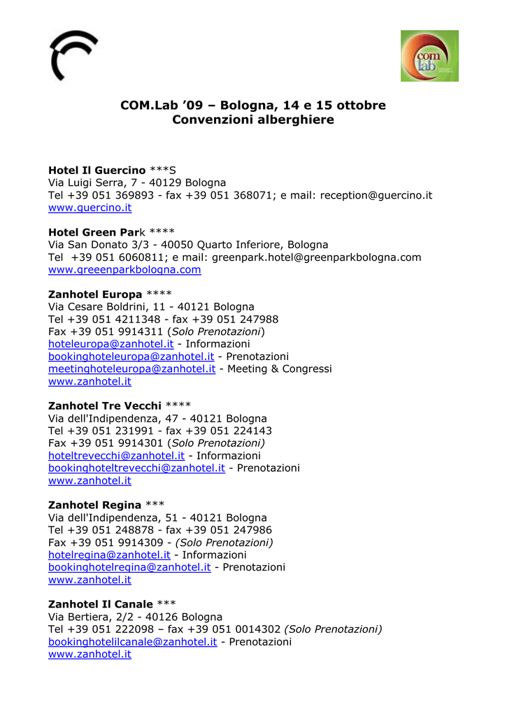 COM.Lab `09 – Bologna, 14 e 15 ottobre Convenzioni alberghiere