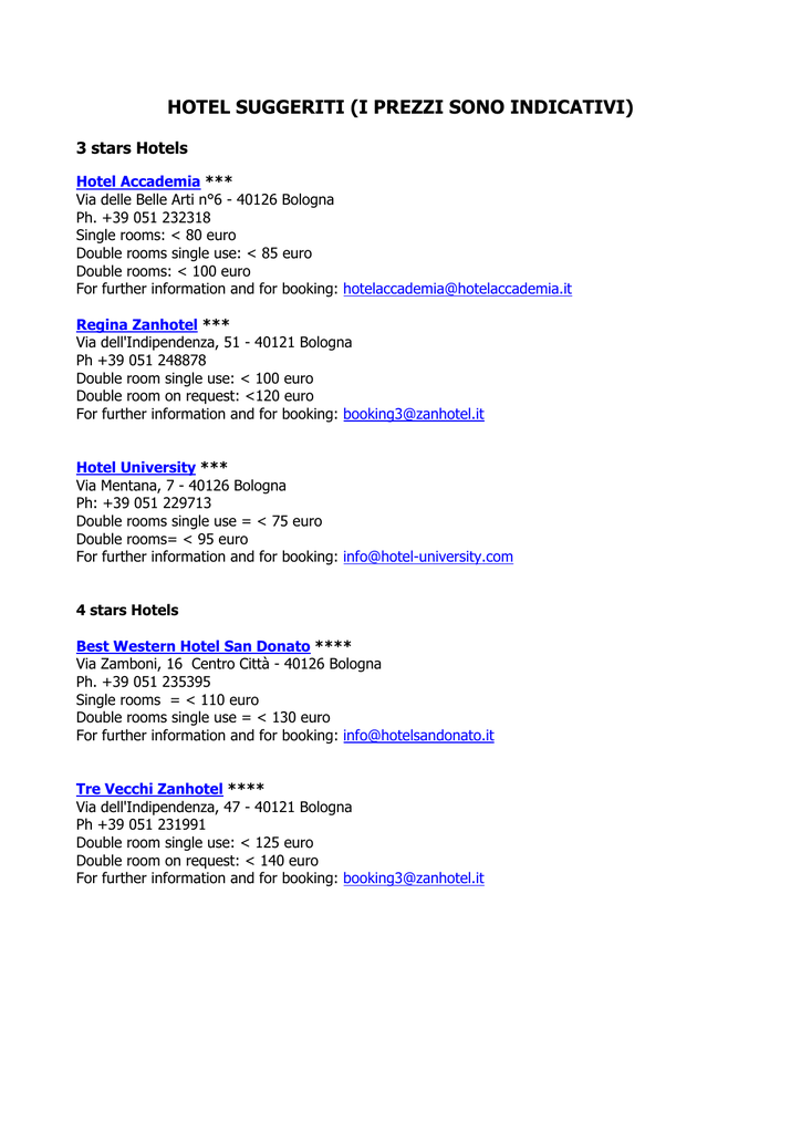 HOTEL SUGGERITI (I PREZZI SONO INDICATIVI) 3 stars Hotels Hotel Accademia *** Via delle Belle Arti n°6 - 40126 Bologna Ph. +39 051 232318 Single rooms: < 80 euro Double rooms single use: < 85 euro Double rooms: < 100 euro For further information and for booking: [email protected] Regina Zanhotel *** Via dell'Indipendenza, 51 - 40121 Bologna Ph +39 051 248878 Double room single use: < 100 euro Double room on request: <120 euro For further information and for booking: [email protected] Hotel University *** Via Mentana, 7 - 40126 Bologna Ph: +39 051 229713 Double rooms single use = < 75 euro Double rooms= < 95 euro For further information and for booking: [email protected] 4 stars Hotels Best Western Hotel San Donato **** Via Zamboni, 16 Centro Città - 40126 Bologna Ph. +39 051 235395 Single rooms = < 110 euro Double rooms single use = < 130 euro For further information and for booking: [email protected] Tre Vecchi Zanhotel **** Via dell'Indipendenza, 47 - 40121 Bologna Ph +39 051 231991 Double room single use: < 125 euro Double room on request: < 140 euro For further information and for booking: [email protected]