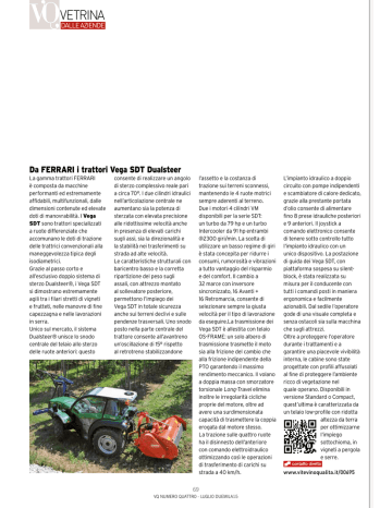 VETRINA DALLE AZIENDE Da FERRARI i trattori Vega SDT Dualsteer La gamma trattori FERRARI è composta da macchine performanti ed estremamente affidabili, multifunzionali, dalle dimensioni contenute ed elevate doti di manovrabilità. I Vega SDT sono trattori specializzati a ruote differenziate che accomunano le doti di trazione delle trattrici convenzionali alla maneggevolezza tipica degli isodiametrici. Grazie al passo corto e all’esclusivo doppio sistema di sterzo Dualsteer®, i Vega SDT si dimostrano estremamente agili tra i filari stretti di vigneti e frutteti, nelle manovre di fine capezzagna e nelle lavorazioni in serra. Unico sul mercato, il sistema Dualsteer® unisce lo snodo centrale del telaio allo sterzo delle ruote anteriori: questo consente di realizzare un angolo di sterzo complessivo reale pari a circa 70°. I due cilindri idraulici nell’articolazione centrale ne aumentano sia la potenza di sterzata con elevata precisione alle ridottissime velocità anche in presenza di elevati carichi sugli assi, sia la direzionalità e la stabilità nei trasferimenti su strada ad alte velocità. Le caratteristiche strutturali con baricentro basso e la corretta ripartizione del peso sugli assali, con attrezzo montato al sollevatore posteriore, permettono l’impiego dei Vega SDT in totale sicurezza anche sui terreni declivi e sulle pendenze trasversali. Uno snodo posto nella parte centrale del trattore consente all’avantreno un’oscillazione di 15° rispetto al retrotreno stabilizzandone l’assetto e la costanza di trazione sui terreni sconnessi, mantenendo le 4 ruote motrici sempre aderenti al terreno. Due i motori 4 cilindri VM disponibili per la serie SDT: un turbo da 79 hp e un turbo Intercooler da 91 hp entrambi @2300 giri/min. La scelta di utilizzare un basso regime di giri è stata concepita per ridurre i consumi, rumorosità e vibrazioni a tutto vantaggio del risparmio e del comfort. Il cambio a 32 marce con inversore sincronizzato, 16 Avanti + 16 Retromarcia, consente di selezionare sempre la giusta velocità per il tipo di lavorazione da eseguire.La trasmissione dei Vega SDT è allestita con telaio OS-FRAME: un solo albero di trasmissione trasmette il moto sia alla frizione del cambio che alla frizione indipendente della PTO garantendo il massimo rendimento meccanico. Il volano a doppia massa con smorzatore torsionale Long-Travel elimina inoltre le irregolarità cicliche proprie del motore, oltre ad avere una surdimensionata capacità di trasmettere la coppia erogata dal motore stesso. La trazione sulle quattro ruote ha il disinnesto dell’anteriore con comando elettroidraulico ottimizzando così le operazioni di trasferimento di carichi su strada a 40 km/h. 69 VQ NUMERO QUATTRO - LUGLIO DUEMILA15 L’impianto idraulico a doppio circuito con pompe indipendenti e scambiatore di calore dedicato, grazie alla prestante portata d’olio consente di alimentare fino 8 prese idrauliche posteriori e 9 anteriori. Il joystick a comando elettronico consente di tenere sotto controllo tutto l’impianto idraulico con un unico dispositivo. La postazione di guida dei Vega SDT, con piattaforma sospesa su silentblock, è stata realizzata su misura per il conducente con tutti i comandi posti in maniera ergonomica e facilmente azionabili. Dal sedile l’operatore gode di una visuale completa e senza ostacoli sia sulla macchina che sugli attrezzi. Oltre a proteggere l’operatore durante i trattamenti e a garantire una piacevole vivibilità interna, le cabine sono state progettate con profili affusolati al fine di proteggere l’ambiente ricco di vegetazione nel quale operano. Disponibili in versione Standard o Compact, quest’ultima è caratterizzata da un telaio low-profile con ridotta altezza da terra per ottimizzarne l’impiego sottochioma, in vigneti a pergola e serre. www.vitevinoqualita.it/00695