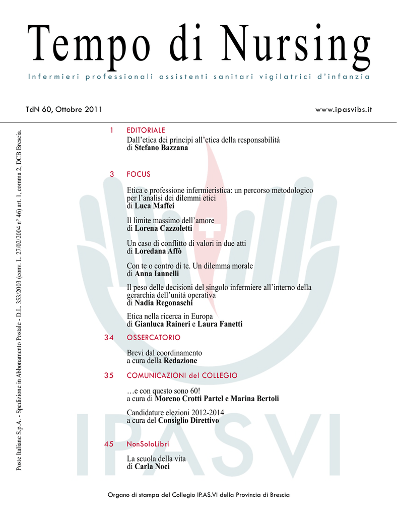 Tempo di Nursing Infermieri professionali assistenti sanitari vigilatrici d’infanzia Poste Italiane S.p.A. - Spedizione in Abbonamento Postale - D.L. 353/2003 (conv. L. 27/02/2004 n° 46) art. 1, comma 2, DCB Brescia. TdN 60, Ottobre 2011 www.ipasvibs.it 1 EDITORIALE Dall’etica dei principi all’etica della responsabilità di Stefano Bazzana 3 FOCUS Etica e professione infermieristica: un percorso metodologico per l’analisi dei dilemmi etici di Luca Maffei Il limite massimo dell’amore di Lorena Cazzoletti Un caso di conflitto di valori in due atti di Loredana Affò Con te o contro di te. Un dilemma morale di Anna Iannelli Il peso delle decisioni del singolo infermiere all’interno della gerarchia dell’unità operativa di Nadia Regonaschi Etica nella ricerca in Europa di Gianluca Raineri e Laura Fanetti 34 OSSERCATORIO Brevi dal coordinamento a cura della Redazione 35 COMUNICAZIONI del COLLEGIO …e con questo sono 60! a cura di Moreno Crotti Partel e Marina Bertoli Candidature elezioni 2012-2014 a cura del Consiglio Direttivo 45 NonSoloLibri La scuola della vita di Carla Noci Organo di stampa del Collegio IP.AS.VI della Provincia di Brescia Sommario EDITORIALE Dall’etica dei principi all’etica della responsabilità di Stefano Bazzana Pag. 1 OSSERVATORIO a cura della Redazione Pag. 34 L’etica professionale come “render-si conto” e “rendere conto” va composta con l’etica del sistema (sanitario, economi- Brevi dal Coordinamento co, sociale…) per dare valore alla persona, al lavoro, alla A cura della Redazione qualità della vita. Pag. 1 Pag. 34 COMUNICAZIONI FOCUS Etica e professione infermieristica a cura della Redazione Pag. 35 Pag. 3 Etica e professione infermieristica: un percorso metodologico per l’analisi dei dilemmi etici di Luca Maffei Pag. 3 Valutazione dei dati di customer satisfaction 2011 delle pubblicazioni IPASVI-BS: Tempo di Nursing e Tempo di Nursing News di Moreno Crotti Partel e Marina Bertoli Pag. 35 Il limite massimo dell’amore di Lorena Cazzoletti Candidature elezioni 2012-2014 a cura del Consiglio Direttivo Un caso di conflitto di valori in due atti di Loredana Affò Pag. 7 Pag. 11 Con te o contro di te. Un dilemma morale di Anna Iannelli Pag. 39 NONSOLOLIBRI Pag. 45 Pag. 16 La scuola della vita. Manifesto per la terza formazione di Carla Noci Pag. 45 Il peso delle decisioni del singolo infermiere all’interno della gerarchia dell’unità operativa di Nadia Regonaschi Pag. 20 Etica nella ricerca in Europa di Gianluca Raineri e Laura Fanetti Pag. 24 Editoriale Dall’etica dei principi all’etica della responsabilità di Stefano Bazzana I n questo momento di trapasso epocale l’etica professionale come “render-si conto” e “rendere conto” va composta con l’etica del sistema (sanitario, economico, sociale…) per dare valore alla persona, al lavoro, alla qualità della vita. Per imprimere una nuova direzione all’esistenza di ciascuno e alla società di domani P arlare di etica della responsabilità e di dilemmi etici in questo periodo di profonda e drammatica crisi mondiale mi ha portato ad intrecciare la dimensione professionale con la dimensione sociale ed economica. Secondo il sociologo Prandstraller le professioni si accingono a diventare vere e proprie forze sociali, e la presenza di un’etica atta a regolare i comportamenti dei membri è importante per definire la loro identità. Il lavoro professionale è quello che più conta, che più incide sui meccanismi di una società -come la nostra- la cui produzione è fondamentalmente basata sulla conoscenza tecnico-scientifica. Conseguenza logica vorrebbe che il peso assunto dal lavoro professionale in una tale società conferisse un elevato ruolo sociale ai professionisti che lo attuano. Anche a livello internazionale le responsabilità professionali si giocano su uno sfondo ormai ridisegnato. Gli infermieri si muovono in un contesto fortemente segnato dal fattore economico e dalle sue profonde contraddizioni. Sono sempre più sensibili alle esigenze del villaggio globale e consapevoli, come cittadini e professionisti, che la crisi può essere un’opportunità per imprimere una direzione diversa alla vita di ciascuno e a quella sociale. Deve far riflettere la paradossale situazione sanitaria mondiale, in quanto influenza il dibattito bioetico, le scelte dei sistemi sanitari e, in definitiva, le decisioni nella pratica clinica quotidiana. I paesi che hanno raggiunto un livello di benessere globale (e quindi anche sanitario) sono un quinto della popolazione mondiale e spendono migliaia di milioni in profumi, cibi per cani, tele- Tempo di Nursing 60/2011 Collegio IP.AS.VI di Brescia Editoriale - 1 fonini e automobili. Queste nazioni consumano nove decimi delle risorse del pianeta, mentre i loro vicini muoiono di fame, morbillo e lebbra. Secondo padre Alex Zanotelli, il nostro paese poteva recuperare circa 60 miliardi di euro (più della durissima manovra finanziaria) semplicemente evitando di aumentare le spese militari nei prossimi 10 anni! Sappiamo che uno dei più importanti principi etici è quello di giustizia e un esempio è la giustizia distributiva (equità): come un infermiere deve saper “distribuire” secondo i bisogni dei suoi assistiti i minuti di assistenza nell’arco di un turno di lavoro, così un sistema sanitario dovrebbe essere in grado di rispondere a ciascuno, ovvero secondo i bisogni di salute dei propri cittadini. Il Consiglio d’Europa, quasi a voler sancire quanto sopra, dichiara che, la “responsabilità essenziale dell’infermiere è di assicurare un’assistenza personalizzata e globale all’individuo, alla famiglia, alla comunità”. Ora, se riflettiamo sui termini che sono contenuti in questa definizione ci possiamo rendere conto di quale sia la sua portata etica, e di come questa recuperi il senso più autentico della nostra professione. L’infermiere, infatti, non è più solo incaricato di eseguire le prescrizioni diagnostiche e t
