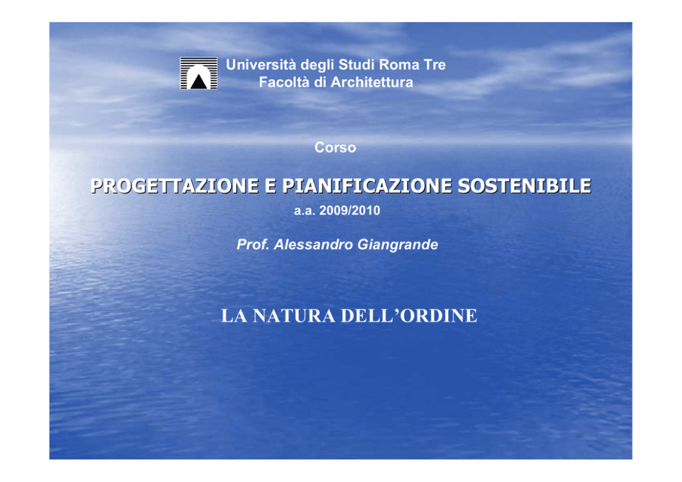 Università degli Studi Roma Tre Facoltà di Architettura Corso PROGETTAZIONE E PIANIFICAZIONE SOSTENIBILE a.a. 2009/2010 Prof. Alessandro Giangrande LA NATURA DELL’ORDINE Premessa In The Nature of Order [1] C. Alexander introduce alcuni concetti e principi che potranno essere utilizzati per migliorare la procedura di pianificazione / progettazione descritta in altri lavori [2] Questa presentazione non ha l’ambizione di sintetizzare l’intero contenuto della nuova opera di Alexander, ma intende soltanto illustrare e discutere criticamente alcuni concetti chiave in esso contenuti. In particolare, non tratterà alcuni argomenti importanti come sequenza, ordine geometrico, linguaggio della forma e stile, per i quali si rimanda alla lettura dei capitoli 11, 15 e 16 del secondo volume di The Nature of Order che li illustrano in dettaglio. Una buona conoscenza delle precedenti opere dell’autore [3] è un requisito necessario per poter comprendere a fondo la materia che è l’oggetto di questa presentazione. [1] C. Alexander, The Nature of Order (4 voll.), CES, Berkeley, 2002-2005. [2] Cfr. ad es. A. Giangrande, E. Mortola, Combining Strategic Choice with other design methods (in J. Freind and A. Hickling, ‘Planning under pressure. The Strategic Choice approach’, Elsevier, London, 2005, p. 322-326). I miglioramenti da apportare alla procedura saranno illustrati in un lavoro successivo. [3] In particolare è necessario conoscere il libro di C. Alexander, S. Ishikawa, M. Silverstein: A Pattern Language. Town, Building ,Construction, Oxford University Press, New York, 1977. A. Concetti, principi e processi A1. Le definizioni di centro e wholeness Tra i concetti introdotti da Alexander in The Nature of Order assumono particolare importanza i concetti di centro (vivente) (living center) e di wholeness. “Quando uso la parola centro mi riferisco ad un sistema fisico distinto, che occupa un certo volume nello spazio e possiede una speciale, rilevante coerenza” (C. Alexander, The Nature of Order, vol. I, p. 84). L’aggettivo living (vivente) va oltre il significato tradizionale che identifica come vivente ogni sistema costituito da atomi di carbonio, ossigeno, idrogeno e azoto che sia capace di riprodursi, restando stabile per un certo tempo. Alexander ne estende il significato attribuendo ad ogni cosa, qualunque cosa, un certo grado di vita. “Ogni pietra, ogni trave e ogni pezzo di cemento possiede un certo grado di vita (…). In generale, ogni singola parte del continuum spazio-temporale ha un certo grado di vita, con alcune parti che ne hanno molto di più, altre di meno. Non è difficile vedere come tale concezione – se accettata – possa facilitare la progettazione di edifici, città e territori. Il concetto di vita, così generalizzato, potrà essere applicato agli oggetti della natura (ad esempio, ai fini della salvaguardia e conservazione della bellezza degli alberi), alla commistione di oggetti naturali e manufatti (strade, giardini, campi coltivati, ecc.) e infine agli edifici stessi (pareti, finestre, stanze, ecc.). In quest’ottica è più facile comprendere il significato dell’architettura, poiché possiamo concepire il nostro compito come qualcosa che ha a che vedere con la creazione della vita e che tale compito, in ogni progetto particolare, consiste nel rendere vitale lo spazio costruito nella massima misura possibile.” (ibidem pp. 31-32). Wholelness (letteralmente: interezza, totalità) è un modo particolare di concepire la realtà fisica. “In ogni data regione dello spazio alcune sub-regioni hanno un’intensità maggiore come centri, altre meno (…). La configurazione complessiva dei centri, in parte inclusi gli uni negli altri, con le loro relative intensità, costituisce una singola struttura. Definisco questa struttura la wholeness di quella regione” (ibidem p. 96). La wholeness è una struttura molto sottile che viene indotta ‘nel tutto’. Essa non può essere predeterminata a partire dalle parti ed è sbagliato pensare ad essa come ad una relazione tra le parti. La wholeness è una struttura autonoma e globale, che viene indotta dai dettagli della configurazione. Si tratta di una reale struttura fisica e matematica dello spazio che è creata implicitamente dalle simmetrie e da altre proprietà che hanno origine nella geometria. “Per comprendere pienamente la natura di questa struttura sottile dobbiamo evitare il pericolo di vedere i centri come fatti di parti. Il pensiero contemporaneo, d’origine cartesiana e meccanicistica, ci dice che ogni cosa è fatta di parti. In particolare, le persone oggi pensano che un ‘tutto’ sia fatto di parti. Alla base di questa convinzione sta l’idea che le parti vengono prima del ‘tutto’: in breve, che le parti esistano come entità di un certo tipo, che sono poi messe in relazione tra loro o combinate, e che un centro sia il risultato di queste relazioni o combinazioni.” (ibidem p. 86). Un centro non può dunque essere una parte di un ‘tutto’, ma è un’entità che può essere definita soltanto in termini di altri centri. I centri sono costruiti sempre da altri centri [definizione ricorsiva di centro]. Un centro non è un punto e nemmeno un centro di gravità. Esso è piuttosto un campo di forza organizzato [1], presente in un oggetto o in una parte di un oggetto, che fa sì che l’oggetto stesso (o una sua parte) presenti un carattere chiaramente riconoscibile. Questa concetto di centralità, assimilata a quello di campo, è fondamentale per l’idea di wholeness. Dal punto di vista fisico-geometrico (che qui soprattutto c’interessa) non si tratta dunque di costruire centri separati da assemblare poi secondo certe regole ai fini di realizzare la wholeness, quanto piuttosto di imparare a costruire ogni centro come un campo, capace di creare “un senso spaziale di centralità”. [1] Il concetto di campo deriva dalla fisica: si dice campo una regione di spazio nella quale una data grand