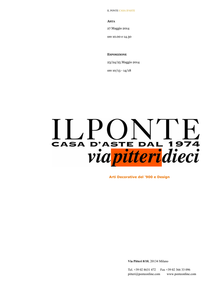 IL PONTE CASA D'ASTE ASTA 27 Maggio 2014 ore 10.00 e 14.30 ESPOSIZIONE 23/24/25 Maggio 2014 ore 10/13 - 14/18 Arti Decorative del '900 e Design Via Pitteri 8/10, 20134 Milano Tel. +39 02 8631 472 Fax +39 02 366 33 096 [email protected] www.ponteonline.com IL PONTE CASA D'ASTE | VIA PITTERI 8 Amministratore Unico Stefano Redaelli Tel. 02 863 1419 Direttore Generale Rossella Novarini Tel. 02 863 1419 [email protected] Uffici Véronique Pirovano [email protected] Azzurra Casali [email protected] Claudia Vanotti [email protected] Gestione Magazzino Marco Brighi Lotfi Zairi Gheorghe Dumitru Moise VIA PITTERI 8/10 - 20134 MILANO Tel. 02 86 31 472 02 86 31 471 02 86 31 470 Fax 02 3663 3096 [email protected] www.ponteonline.com IL PONTE CASA D'ASTE | VIA PITTERI 8 4 1° tornata martedì 27 maggio 2014 (ore 10.00) dal lotto 1 al lotto 336 1 Guido Andlovitz (1900 - 1965) - (Attr.) Manifattura di Laveno, servizio da caffè in ceramica decorato con manico e profili in rosso, marcato "Lavenia-Made in Italy" sotto la base (lievi difetti) € 100,00/120,00 2 Gio Pomodoro (Orciano Di Pesaro 1930 - Milano 2002) “Guscio n. 1” scultura in acciaio nossidabile e polipropilene. Multiplo numerato “AGN 660 ”. Produzione Alessi, disegno 1972, firmato e marcato. (d cm 19) Bibliografia: “Forme 52”, aprile 1974, copertina; Catalogo Officina Alessi 1985, p. 46. € 80,00/100,00 3 Coppia di lampioni in ottone e cristallo, esecuzione italiana, anni '40/'50 del sec. XX (difetti) € 100,00/150,00 4 Felice Tosalli (Torino 1883 - Torino 1958) - Lotto composto da 3 esemplari della ceramica modellata a colaggio "Uccellino", unita a un esemplare simile di analoghe dimensioni e uno più piccolo, tutti decorati con smalto bianco craquelé. Manifattura Lenci, Torino, seconda metà del sec XX. Marcate sotto la base "Lenci MADE IN ITALY" (misure varie) (difetti e rotture) Bibliografia: A. Panzetta, Le ceramiche Lenci. Catalogo dell'archivio storico 1928-1964, Allemandi, Torino 2003, cat. n. 890, p. 251. € 80,00/100,00 5 5 Lotto composto da due fermacarte in vetro sommerso, l’ uno firmato a punta “Cenedese Murano” in vetro ghiaccio azzurro e leggera inclusione di polvere d’oro, l’altro firmato a punta “A. Seguso Murano” in vetro incolore a bolle (misure diverse) € 70,00/80,00 6 Masayo Ave (Giappone 1962) - Lampada da tavolo modello “Genesi grande” in spugna di materiale plastico e tondino d’acciaio. Produzione Antonangeli Illuminazione, Italia 1998 € 100,00/150,00 7 Manifattura Sabino, Francia, vaso modello “24 Pirogues” in vetro opalescente pressato in stampo con base e collo troncoconici, corpo con 24 costolature. Firmato “Sabino France” sotto la base (h cm 29,5) (gravi difetti) Bibliografia: P. Decelle, Sabino. Maître verrier de l’art Déco 1878-1961. Catalogue raisonné, cat. 7044 € 80,00/100,00 8 Mobile radio stereo Grundig. Anni '60 € 200,00/250,00 9 Manifattura di Murano, figurina femminile in abiti settecenteschi, in vetro soffiato trasparente incolore e blu, con applicazioni di foglia d’oro, anni ’60 del sec XX (h cm 22) (difetti e restauri) € 70,00/80,00 IL PONTE CASA D'ASTE | VIA PITTERI 8 6 10 Coppia di poltroncine regolabili da ufficio con seduta e schienale a guscio di legno multistrato; rivestimento in pelle verde. Produzione MIM, Roma, anni '70 del sec XX (difetti) € 80,00/100,00 13 Letto déco in legno e radica di tuja "Regia scuola delle arti del mobile e del merletto Cantù" (Como) (difetti) € 80,00/100,00 11 Lampadario in vetro sabbiato con decorazioni vegetali, struttura in ottone. Esecuzione italiana, anni '50 (difetti) € 60,00/80,00 14 Lampadario a quattro fiamme con struttura in ottone e metallo laccato nero, paralume composto da ghiera metallica. Produzione italiana, anni ’60 del sec XX (diam cm 49,5) (difetti e mancanze) € 80,00/100,00 12 Manifattura di Murano, vaso in vetro trasparente pesante nelle tonalità del verde e del viola. Anni ’60 del sec XX. (h cm 29) € 100,00/180,00 15 Venini per Poltrona Frau, Murano 1987, piuma in vetro a canne di zanfirico, incisione a punta di diamante "Venini per i 75 anni di Poltrona Frau" € 80,00/100,00 7 16 Bottiglia in ceramica policroma raffigurante arance. Manifattura italiana del sec XX (h cm 30) € 100,00/120,00 17 Manifattura Lalique, Francia, metà circa del sec. XX, posacenere "Concarneau" in vetro stampato e molato con rilevo in negativo raffigurante una carpa (diam 15,5) (difetti) € 100,00/150,00 18 Portaombrelli di gusto Novecento in ottone martellinato di forma svasata a costolature, montato su base dello stesso materiale. Fabbricazione italiana anni’40 del sec. XX (h cm 47) € 100,00/120,00 19 Lotto composto da due coppe portafrutta di diverse misure in vetro di Murano trasparente blu e verde. Produzione Cappellini Milano, collezione "Progetto oggetto" € 80,00/100,00 20 Guido Gambone (1909 - 1969) - Lotto composto da una ciotola ed una bottiglia in ceramica, smaltate in verde e a fasce policrome. Anni '50 del sec XX. Firmati sotto la base "Gambone Italy" (misure diverse) (difetti) € 150,00/200,00 21 Venini, Murano 1985, maschera in vetro incamiciato bianco opalino e trasparente di colore melanzana, completa di supporto metallico, produzione recente, recante firma incisa a punta "Venini Italia 85" (cm 23,3x14,3) € 100,00/120,00 IL PONTE CASA D'ASTE | VIA PITTERI 8 8 22 Manifattura di Murano, anni '40 del sec. XX. Lampadario a cinque luci in vetro verdino (difetti) € 200,00/250,00 25 Eliseo Salino (1919 - 1999) - Piatto in ceramica smaltato (d cm 37) Al retro s. Giorgio Albisola € 100,00/120,00 23 Manifattura di Murano, anni '40 del sec. XX. Lampadario a tre luci in vetro pagliesco (difetti) € 150,00/200,00 26 Manifattura di Murano, figura femminile in vetro trasparente e bianco-rosato, applicazioni di foglia d’oro. Anni ’80 del sec XX (h cm 37,5) € 100,00/150,00 24 Giovanni Offredi (1927 - 2007) - Raro scrittoio modello "Bauletto" in legno laccato bianco, qu