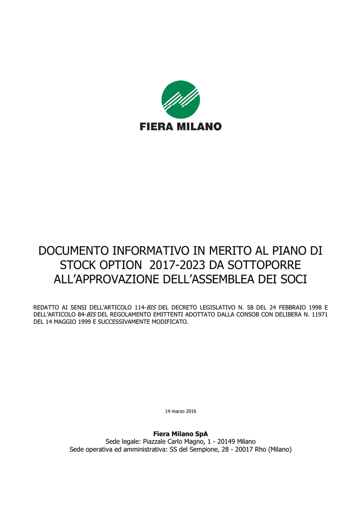 DOCUMENTO INFORMATIVO IN MERITO AL PIANO DI STOCK OPTION 2017-2023 DA SOTTOPORRE ALL’APPROVAZIONE DELL’ASSEMBLEA DEI SOCI REDATTO AI SENSI DELL’ARTICOLO 114-BIS DEL DECRETO LEGISLATIVO N. 58 DEL 24 FEBBRAIO 1998 E DELL’ARTICOLO 84-BIS DEL REGOLAMENTO EMITTENTI ADOTTATO DALLA CONSOB CON DELIBERA N. 11971 DEL 14 MAGGIO 1999 E SUCCESSIVAMENTE MODIFICATO. 14 marzo 2016 Fiera Milano SpA Sede legale: Piazzale Carlo Magno, 1 - 20149 Milano Sede operativa ed amministrativa: SS del Sempione, 28 - 20017 Rho (Milano) PREMESSA In conformità alle prescrizioni di cui all’art. 114-bis del D.Lgs. 24 febbraio 1998, n. 58 (il “Testo Unico della Finanza” ovvero il “TUF”), nonché alle prescrizioni dell’art. 84-bis della delibera Consob n. 11971/99 (il “Regolamento Emittenti”) in materia di informazioni che devono essere comunicate al mercato in relazione all’attribuzione di piani di compensi basati su strumenti finanziari a favore di componenti del Consiglio di Amministrazione, di dipendenti, nonché a favore di componenti del Consiglio di Amministrazione, di dipendenti di altre società controllanti o controllate, il presente documento informativo (il “Documento Informativo”) è stato predisposto in vista dell’Assemblea dei soci di Fiera Milano S.p.A. (la “Società” o l’“Emittente”, ed insieme con le società dalla stessa direttamente o indirettamente controllate, il “Gruppo) convocata dal Consiglio di Amministrazione del 14 marzo 2016, in unica convocazione, in data 28 aprile 2016, per deliberare, inter alia, l’approvazione del “Piano di Stock Option 2017-2023” (il “Piano”). Il Piano prevede l’attribuzione gratuita di opzioni (“Opzioni”) per la sottoscrizione di azioni ordinarie (“Azioni”) a dipendenti ed amministratori del Gruppo (i “Beneficiari”), nel rapporto di un’azione per ogni opzione nei termini ed alle condizioni stabiliti dal Piano e descritti nel presente Documento Informativo, al fine di incentivarne la motivazione al raggiungimento degli obiettivi aziendali e di aumentarne la fidelizzazione nei confronti della Società. Il presente Documento Informativo è redatto, anche nella numerazione dei relativi paragrafi, in conformità a quanto previsto nello Schema 7 dell’Allegato 3A al Regolamento Emittenti ed è volto a fornire ai soci le informazioni necessarie per esercitare in modo informato il proprio diritto di voto in sede assembleare. Alla luce della definizione contenuta nell’art. 84-bis del Regolamento Emittenti, si segnala che il Piano, avuto riguardo ai Beneficiari dello stesso, si qualifica come “piano di particolare rilevanza”, in quanto rivolto, inter alia, ai soggetti con funzioni di direzione nella Società ed ai dirigenti che hanno regolare accesso alle informazioni privilegiate e detengono il potere di adottare decisioni di gestione che possono incidere sull’evoluzione e sulle prospettive future della Società ai sensi dell’art. 152-sexies, comma 1, lett. c)- c.2) del Regolamento Emittenti. Alla data del presente Documento Informativo, la proposta di adozione del Piano non è ancora stata approvata dall’Assemblea dei soci. Pertanto: (i) il presente Documento Informativo è redatto esclusivamente sulla base del contenuto della proposta di adozione del Piano approvata dal Consiglio di Amministrazione della Società in data 14 marzo 2016; (ii) ogni riferimento al Piano contenuto nel presente Documento Informativo deve intendersi riferito alla proposta di adozione del Piano. Il presente Documento Informativo verrà aggiornato, ove necessario e nei termini e con le modalità prescritte dalla normativa vigente, qualora la proposta di adozione del Piano sia approvata dall’Assemblea dei soci e conformemente al contenuto delle deliberazioni assunte dalla medesima Assemblea e dagli organi competenti all’attuazione del Piano. La presente Relazione è a disposizione del pubblico presso la sede legale e la sede operativa e amministrativa della Società, nonché sul sito internet della Società www.fieramilano.it 1 e sul sito internet www.emarketstorage.com gestito da BIt Market Services S.p.A. 1 http://www.fieramilano.it/assemblea-degli-azionisti 1 DEFINIZIONI In aggiunta ai termini altrimenti definiti nel presente documento informativo, i seguenti termini, ove riportati con lettera in maiuscolo, avranno il significato di seguito indicato, essendo inteso che i termini e le espressioni definite al maschile includeranno anche eventuali espressioni al femminile e che i termini e le espressioni definite al singolare si intenderanno definite anche al plurale. Assegnazione o Data di Assegnazione Indica la data nella quale il Consiglio di Amministrazione individua i Beneficiari e individua il numero di Opzioni da attribuire gratuitamente a ciascuno di essi. Assemblea Indica l’Assemblea dei soci della Società. Attribuzione o Data di Attribuzione Indica la data, al termine del periodo di Maturazione, alla quale vengono attribuite in proprietà le Azioni e matura il diritto alla consegna. Azioni Indica le azioni ordinarie della Società prive di valore nominale, con godimento regolare. Beneficiari Indica i destinatari del Piano e dei relativi Diritti. Ciclo di Attribuzione Indica ciascun ciclo di attribuzione di Opzioni composto (i) di un periodo di maturazione di Opzioni (Vesting Period) non inferiore a tre anni, (ii) di un ulteriore periodo durante il quale il Beneficiario nel rispetto di quanto indicato nel Regolamento può esercitare le Opzioni (Periodo di Esercizio). Comitato per la Remunerazione Indica il Comitato per la Remunerazione costituito all’interno del Consiglio di Amministrazione ai sensi del Codice di Autodisciplina. Consiglio di Amministrazione Indica il Consiglio di Amministrazione della Società. Data finale di Esercizio Indica la data del 31 maggio 2023. Dirigenti con Responsabilità Strategiche Indica i Dirigenti che hanno il potere e la responsabilità direttamente o indirettamente della