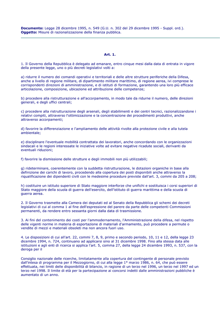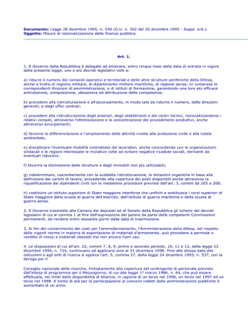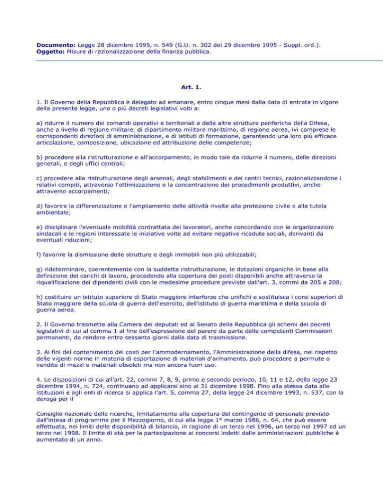 Documento: Legge 28 dicembre 1995, n. 549 (G.U. n. 302 del 29 dicembre 1995 - Suppl. ord.). Oggetto: Misure di razionalizzazione della finanza pubblica. Art. 1. 1. Il Governo della Repubblica è delegato ad emanare, entro cinque mesi dalla data di entrata in vigore della presente legge, uno o più decreti legislativi volti a: a) ridurre il numero dei comandi operativi e territoriali e delle altre strutture periferiche della Difesa, anche a livello di regione militare, di dipartimento militare marittimo, di regione aerea, ivi comprese le corrispondenti direzioni di amministrazione, e di istituti di formazione, garantendo una loro più efficace articolazione, composizione, ubicazione ed attribuzione delle competenze; b) procedere alla ristrutturazione e all'accorpamento, in modo tale da ridurne il numero, delle direzioni generali, e degli uffici centrali; c) procedere alla ristrutturazione degli arsenali, degli stabilimenti e dei centri tecnici, razionalizzandone i relativi compiti, attraverso l'ottimizzazione e la concentrazione dei procedimenti produttivi, anche attraverso accorpamenti; d) favorire la differenziazione e l'ampliamento delle attività rivolte alla protezione civile e alla tutela ambientale; e) disciplinare l'eventuale mobilità contrattata dei lavoratori, anche concordando con le organizzazioni sindacali e le regioni interessate le iniziative volte ad evitare negative ricadute sociali, derivanti da eventuali riduzioni; f) favorire la dismissione delle strutture e degli immobili non più utilizzabili; g) rideterminare, coerentemente con la suddetta ristrutturazione, le dotazioni organiche in base alla definizione dei carichi di lavoro, procedendo alla copertura dei posti disponibili anche attraverso la riqualificazione dei dipendenti civili con le medesime procedure previste dall'art. 3, commi da 205 a 208; h) costituire un istituto superiore di Stato maggiore interforze che unifichi e sostituisca i corsi superiori di Stato maggiore della scuola di guerra dell'esercito, dell'istituto di guerra marittima e della scuola di guerra aerea. 2. Il Governo trasmette alla Camera dei deputati ed al Senato della Repubblica gli schemi dei decreti legislativi di cui al comma 1 al fine dell'espressione del parere da parte delle competenti Commissioni permanenti, da rendere entro sessanta giorni dalla data di trasmissione. 3. Ai fini del contenimento dei costi per l'ammodernamento, l'Amministrazione della difesa, nel rispetto delle vigenti norme in materia di esportazione di materiali d'armamento, può procedere a permute o vendite di mezzi e materiali obsoleti ma non ancora fuori uso. 4. Le disposizioni di cui all'art. 22, commi 7, 8, 9, primo e secondo periodo, 10, 11 e 12, della legge 23 dicembre 1994, n. 724, continuano ad applicarsi sino al 31 dicembre 1998. Fino alla stessa data alle istituzioni e agli enti di ricerca si applica l'art. 5, comma 27, della legge 24 dicembre 1993, n. 537, con la deroga per il Consiglio nazionale delle ricerche, limitatamente alla copertura del contingente di personale previsto dall'intesa di programma per il Mezzogiorno, di cui alla legge 1° marzo 1986, n. 64, che può essere effettuata, nei limiti delle disponibilità di bilancio, in ragione di un terzo nel 1996, un terzo nel 1997 ed un terzo nel 1998. Il limite di età per la partecipazione ai concorsi indetti dalle amministrazioni pubbliche è aumentato di un anno. 5. Le disposizioni richiamate nel primo periodo del comma 4 non si applicano per le assunzioni di personale del comparto sanità, di quello dipendente dal Ministero di grazia e giustizia, degli ispettori di volo da utilizzare presso la Direzione generale dell'aviazione civile del Ministero dei trasporti e della navigazione, di quello operativo dell'Azienda autonoma di assistenza al volo per il traffico aereo generale, di quello degli ordini e collegi professionali e delle relative Federazioni e Consigli nazionali e, per il solo anno 1996, per le assunzioni di personale del Ministero delle finanze limitatamente ai concorsi ultimati ed in fase di ultimazione, nonchè a quelli comunque già autorizzati alla data del 30 settembre 1995. 6. Per l'anno 1996 in deroga alle norme vigenti ai comuni che hanno dichiarato il dissesto finanziario entro il 31 dicembre 1993 ed avranno approvato l'ipotesi di bilancio riequilibrato entro il 31 dicembre 1995 non si applicano i commi da 47 a 52 dell'art. 3 della legge 24 dicembre 1993, n. 537. 7. Gli enti di cui al comma 6 possono, a carico del proprio bilancio, conferire incarichi per l'esercizio delle funzioni dirigenziali, per i posti delle relative qualifiche non ricoperti, a condizione che la percentuale della spesa per il personale sul totale delle spese correnti risulti ridotta o invariata. 8. L'art. 5, comma 25, della legge 24 dicembre 1993, n. 537, si applica nel senso che le dotazioni organiche del personale delle istituzioni e degli enti di ricerca sono rideterminate in riduzione rispetto a quelle costituite in conseguenza delle operazioni di rideterminazione delle piante organiche svolte in base alle disposizioni e alle procedure di cui all'art. 13 dell'accordo sindacale reso esecutivo dal decreto del Presidente della Repubblica 12 febbraio 1991, n. 171. La rilevazione dei carichi di lavoro per il personale degli enti ed istituzioni di ricerca nonchè degli enti autonomi lirici ed istituzioni concertistiche assimilate è riferita all'attività del personale amministrativo di supporto. 9. Gli oneri finanziari derivanti dalla ridefinizione delle dotazioni organiche del personale delle pubbliche amministrazioni di cui all'art. 22, comma 16, della legge 23 dicembre 1994, n. 724, non possono superare gli oneri per spesa di personale conseguenti ai provvedimenti di provvisoria rideterminazione delle dotazioni organiche previsti dall'art. 3, comma 6, della legge 24 dicembre 1993, n. 537, e dalle altre disposizioni sulla stessa materia contenute nella predetta legge in relazione ai diversi comparti dell