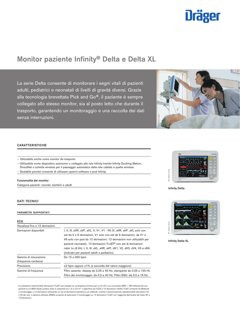 La serie Delta consente di monitorare i segni vitali di pazienti adulti, pediatrici e neonatali di livelli di gravità diversi. Grazie alla tecnologia brevettata Pick and Go®, il paziente è sempre collegato allo stesso monitor, sia al posto letto che durante il trasporto, garantendo un monitoraggio e una raccolta dei dati senza interruzioni. MT-2226-2003 Monitor paziente Infinity® Delta e Delta XL CARATTERISTICHE – Utilizzabile anche come monitor da trasporto – Utilizzabile come dispositivo autonomo o collegato alla rete Infinity tramite Infinity Docking Station, DirectNet o scheda wireless per il passaggio automatico dalla rete cablata a quella wireless – Scalabile perché consente di utilizzare opzioni software e pod Infinity Funzionalità del monitor Categoria pazienti: neonati, bambini e adulti MT-8850-2006 Infinity Delta DATI TECNICI ECG Visualizza fino a 12 derivazioni Derivazioni disponibili Gamma di misurazione (frequenza cardiaca) Precisione Gamme di frequenza I, II, III, aVR, aVF, aVL, V, V+, V1 - V6 (V, aVR, aVF, aVL solo con set da 5 e 6 derivazioni, V+ solo con set da 6 derivazioni, da V1 a V6 solo con pod da 12 derivazioni; 12 derivazioni non utilizzabili per pazienti neonatali). 12 derivazioni TruST® con set di derivazioni ridot- to (6 fili): I, II, III, aVL, aVR, aVF, dV1, V2, dV3, dV4, V5 e dV6 (indicato per pazienti adulti e pediatrici). Da 15 a 300 bpm ±2 bpm oppure ±1% (a seconda del valore maggiore) Filtro assente: display da 0,05 a 40 Hz; stampante da 0,05 a 125 Hz Filtro del monitoraggio: da 0,5 a 40 Hz. Filtro ESU: da 0,5 a 16 Hz Le prestazioni ottimali delle derivazioni TruST sono basate su un‘ampiezza minima pari a 0,3 mV e su una durata QRS < 180 millisecondi con pazienti la cui BSA (body surface area) è compresa tra 1,5 e 2,5 m². L‘algoritmo per ECG a 12 derivazioni ridotte TruST consente di effettuare il monitoraggio a 12 derivazioni utilizzando un set di derivazioni standard a sei elettrodi, nonché il posizionamento standard delle derivazioni V2 e V5 per arti. L‘opzione software ARIES consente di potenziare il monitoraggio su 12 derivazioni TruST con l‘aggiunta dell‘analisi del tratto ST a 12 derivazioni. 1 MT-8848-2006 PARAMETRI SUPPORTATI Infinity Delta XL 02 | MONITOR PAZIENTE INFINITY DELTA E DELTA XL DATI TECNICI (CONTINUA) Gamma di rilevazione QRS Ampiezza Da 0,5 a 5 mV Allarmi Limiti inferiore e superiore selezionabili dall‘utente Pazienti neonatali: da 40 a 120 msec Allarmi Derivazioni di rilevazione del pacemaker: (pazienti adulti/pediatrici) Accessori Set di elettrodi da 3, 5 oppure 6 derivazioni o pod a 12 derivazioni Limiti inferiore e superiore selezionabili dall‘utente I, II oppure III Ampiezza: da ±2 a ±700 mV Durata (dp): da 0,2 a 2,0 msec ST (non utilizzabile per pazienti neonatali) Derivazioni disponibili Con opzione ST a tre derivazioni: scelta tra 3 derivazioni disponibili Con opzione ARIES: fino a 12 derivazioni Lunghezza del complesso ST 892 msec (da -300 a +600 msec dal punto J) Velocità di campionamento 225 campioni al secondo Risposta in frequenza 0,05-40 Hz Punto di misurazione isoelettrica Gamma di misurazione Inizio del complesso ECG fino al punto J Predefinito Inizio di QRS - 28 msec Punto di misurazione del segmento ST Gamma di regolazione Dal punto J alla fine del complesso ECG Predefinito Fine di QRS + 80 msec Intervallo aggiornamento 15 sec, richiesto 1 battito normale Risoluzione ±0,1 mm Trend Formato grafico, tabulare e minitrend in formato grafico Allarme elettrodo scollegato Sì Allarmi ST inferiore e superiore ± 15 mm, incrementi di ±0,1 mm Durata dell‘evento ST per l‘attivazione dell‘allarme Nessuno, 15, 30, 45, 60 sec Rilevazione aritmia Pazienti adulti e pediatrici Sì Pazienti neonatali No. Come allarme di frequenza cardiaca bassa in modalità neonatale è disponibile solo la bradicardia Modalità ARR Selezionabile dall‘utente; disattivata, di base o avanzata ARR di base (standard) ARR avanzata (opzione) Asistolia, fibrillazione ventricolare, tachicardia ventricolare e artefatti (etichetta ARR visualizzata per la registrazione degli eventi di aritmia) Frequenza ventricolare, ritmo idioventricolare accelerato, tachicardia sopraventricolare, coppiette, bigeminismo, tachicardia, bradicardia, pausa; supporta inoltre l‘uscita per il parametro PVC/min. Respiro Derivazioni di rilevamento I, II (selezionabili dall’utente) Metodo di misurazione Impedenziometria Corrente ausiliaria ≤10 μA per ciascun elettrodo attivo Soglia di rilevazione Gamma di misurazione Da 0,15 a 4,0 Ω in modalità manuale (regolazione utente) Da 0,2 a 1,5 Ω in modalità automatica (regolazione automatica) Da 0 a 155 respiri al min Precisione ±1 respiro/min oppure 2% della gamma (a seconda del valore maggiore) Rilevazione apnea Pazienti neonatali e pediatrici Allarmi Inferiore e superiore selezionabili dall‘utente Pulsossimetria (SpO2) Algoritmo SpO2 Algoritmo SpO2 M asimo® SET® (Signal Extraction Technology) Masimo fornisce l‘affermato standard per la pulsossimetria con tolleranza del movimento. Per informazioni più dettagliate, vedere la scheda tecnica del prodotto. Nellcor™ OxiMax™ 2 INFINITY DELTA AND DELTA XL PATIENT MONITORS Algoritmo SpO2 | 03 Per informazioni più dettagliate, vedere la scheda tecnica del prodotto. OxiSure® SpO23 di Dräger3 Dräger OxiSure® SpO2 Collegamento MultiMed Pod (porta SpO2)4 Parametri visualizzati S aturazione (frazione di ossiemoglobina rispetto alla emoglobina funzionale) e polso (velocità e forma d‘onda) Metodo di misurazione Spettrofotometria a trasmissione Gamma di misurazione SpO2: da 1 a 100% Polso: da 30 a 250 bpm Precisione SpO2: da 0 a 69% non specificato SpO2: da 70 a 100%: ±2% (±3% per neonati; Masimo® LNOP-Orecchio: ±3,5%; Nellcor® DS100A: ±3%) Polso: ±3 bpm oppure ±3% (a seconda del valore maggiore) Allarmi Accessori Limiti inferiore e superiore selezionabili dall‘utente per SpO2 e frequenza del polso Allarme di desaturazione p