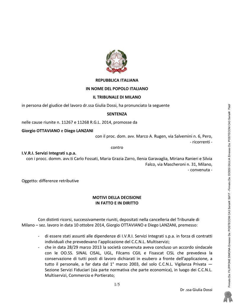 REPUBBLICA ITALIANA IN NOME DEL POPOLO ITALIANO in persona del giudice del lavoro dr.ssa Giulia Dossi, ha pronunciato la seguente SENTENZA nelle cause riunite n. 11267 e 11268 R.G.L. 2014, promosse da Giorgio OTTAVIANO e Diego LANZANI con il proc. dom. avv. Marco A. Rugen, via Salvemini n. 6, Pero, - ricorrenti contro I.V.R.I. Servizi Integrati s.p.a. con i procc. domm. avv.ti Carlo Fossati, Maria Grazia Zarro, Ilenia Garavaglia, Miriana Ranieri e Silvia Falco, via Mascheroni n. 31, Milano, - convenuta Oggetto: differenze retributive MOTIVI DELLA DECISIONE IN FATTO E IN DIRITTO Con distinti ricorsi, successivamente riuniti, depositati nella cancelleria del Tribunale di Milano – sez. lavoro in data 10 ottobre 2014, Giorgio OTTAVIANO e Diego LANZANI, premesso: - di essere stati assunti alle dipendenze di I.V.R.I. Servizi Integrati s.p.a. in forza di contratti individuali che prevedevano l’applicazione del C.C.N.L. Multiservizi; che in data 28/29 marzo 2013 la società convenuta aveva concluso un accordo sindacale con le OO.SS. SINAL CISAL, UGL, Filcams CGIL e Fisascat CISL che prevedeva la conservazione di tutti posti di lavoro dichiarati in esubero a fronte dell'applicazione, a tutto il personale, a far data dal 1° marzo 2003, del solo C.C.N.L. Vigilanza Privata — Sezione Servizi Fiduciari (sia parte normativa che parte economica), in luogo dei C.C.N.L. Multiservizi, Commercio e Portierato; 1/5 Dr .ssa Giulia Dossi Firmato Da: FILIPPONE SIMONA Emesso Da: POSTECOM CA3 Serial#: 5bf17 - Firmato Da: DOSSI GIULIA Emesso Da: POSTECOM CA3 Serial#: 7fabf IL TRIBUNALE DI MILANO che le condizioni descritte nel suddetto accordo, oltre a risultare lesive dei diritti dei ricorrenti, in quanto contrastanti con l’art. 2103 c.c., ovvero dettate in violazione del principio di irriducibilità della retribuzione, dovevano altresì prive di efficacia nei confronti dei ricorrenti atteso che l’accordo prevedeva al punto 6 che “in applicazione al presente accordo, sarà sottoscritto, in una delle sedi privilegiate di cui agli artt. 410 e 411 c.p.c. un accordo individuale”; - di non aver prestato il proprio consenso in qualsiasi forma a tale accordo, né di aver sottoscritto l'accordo individuale di cui al punto che precede; tanto premesso, hanno rassegnato le seguenti conclusioni: accertare e dichiarare l'illegittima decurtazione della retribuzione a danno dei ricorrenti dall’aprile 2013 a tutt’oggi e, per l'effetto, condannare la società convenuta a corrispondere, a tale titolo, a Giorgio OTTAVIANO l’importo di € 7.013,99 e a Diego LANZANI l’importo di € 6.237,00 (calcolati sino al 31 agosto 2014), oltre alle ulteriori differenze maturate sino alla data della sentenza, nonché a pagare a Diego LANZANI l’ulteriore importo di € 1.856,85 a titolo di indennità per ROL maturati e non goduti, con interessi legali e rivalutazione monetaria. Con vittoria di spese e competenze di causa, da distrarsi a favore del procuratore antistatario. Costituendosi ritualmente in giudizio, I.V.R.I. SERVIZI INTEGRATI s.p.a. ha contestato la fondatezza delle deduzioni e domande avversarie, concludendo per il loro rigetto. Le domande svolte dai ricorrenti sono fondate e meritano accoglimento nei limiti di seguito esposti. Le questioni oggetto della presente controversia sono già state affrontate e decise da numerose pronunce di questo Tribunale (cfr. Trib. Milano – sez. lav., 21-23 gennaio 2014 n. 162, est. Di Leo; Trib. Milano – sez. lav., 5 novembre 2014, est. Casella; Trib. Milano – sez. lav., 17 giugno 2014, est. Ravazzoni; Trib. Milano – sez. lav., 12 novembre 2014, est. Porcelli), le cui motivazioni sono condivise da questo giudice e richiamate anche ai sensi dell’art. 118 disp. att. c.p.c.. Si rileva, in primo luogo, l’inefficacia nei confronti degli odierni ricorrenti degli accordi sindacali conclusi in data 28/29 marzo 2013 tra la società convenuta e le OO.SS. SINAL CISAL, UGL, Filcams CGIL e Fisascat CISL, atteso che, per espressa volontà delle parti contraenti, l’efficacia degli accordi è subordinata alla sottoscrizione, in sede protetta ai sensi degli artt. 410 e 411 c.p.c., di un accordo individuale da parte di ciascun dipendente. Come osservato in particolare dalla citata sentenza del Tribunale di Milano – sez. lavoro, 17 giugno 2014, est. Ravazzoni, “la clausola contenuta nell'accordo sindacale del 28/3/2013 al punto 6 deve essere considerata a tutti gli effetti di legge come condizione sospensiva di validità dell'accordo suddetto rispetto a ciascun dipendente, ai sensi dell’ articolo 1353 c.c.. Infatti, si tratta di una clausola che rimette alla volontà del singolo lavoratore la decisione circa l'opportunità di sottoscrivere in sede privilegiata un accordo individuale cui è subordinata l'applicazione di quanto concordato nel verbale del 28/3/2013”. È pacifico in causa che i ricorrenti non hanno sottoscritto alcun accordo individuale, sicché non può trovare applicazione nei loro confronti quanto statuito dagli accordi sindacali in parola. Né può accogliersi la tesi della convenuta, secondo cui i ricorrenti, attraverso la ricezione mensile del proprio trattamento retributivo, avrebbero tacitamente accettato il contenuto 2/5 Dr .ssa Giulia Dossi Firmato Da: FILIPPONE SIMONA Emesso Da: POSTECOM CA3 Serial#: 5bf17 - Firmato Da: DOSSI GIULIA Emesso Da: POSTECOM CA3 Serial#: 7fabf - 3/5 Dr .ssa Giulia Dossi Firmato Da: FILIPPONE SIMONA Emesso Da: POSTECOM CA3 Serial#: 5bf17 - Firmato Da: DOSSI GIULIA Emesso Da: POSTECOM CA3 Serial#: 7fabf dell'accordo sindacale: tale condotta, infatti, non è univocamente interpretabile come condotta abdicativa di diritti inderogabili da parte del lavoratore, tenuto anche conto che le somme percepite a titolo di retribuzione, così come indicate nei relativi prospetti paga, sono somme destinate al mantenimento del lavoratore e della propria famiglia. Inoltre, non può certo ritenersi che l’accettazione tacita sia equipollent