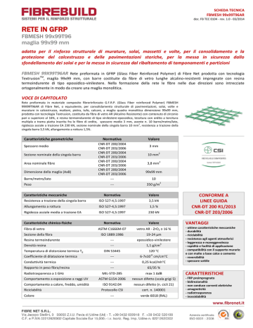SCHEDA TECNICA FBMESH 99x99T96AR doc. FB TEC 0104 - rev. 1.0 - 03/2014 RETE IN GFRP FBMESH 99x99T96 maglia 99x99 mm adatta per il rinforzo strutturale di murature, solai, massetti e volte, per il consolidamento e la protezione del calcestruzzo e delle pavimentazioni storiche, per la messa in sicurezza dallo sfondellamento dei solai e per la messa in sicurezza dal ribaltamento di tamponamenti e partizioni FBMESH 99X99T96AR Rete preformata in GFRP (Glass Fiber Reinforced Polymer) di Fibre Net prodotta con tecnologia TM Textrusion , maglia 99x99 mm, con barre costituite da fibre di vetro lunghe alcalino-resistenti impregnate con resina termoindurente di tipo epossidico-vinilestere. Nella formazione della rete le fibre nelle due direzioni sono intrecciate ortogonalmente in modo da creare una maglia monolitica. VOCE DI CAPITOLATO Rete preformata in materiale composito fibrorinforzato G.F.R.P. (Glass Fiber reinforced Polymer) FBMESH 99X99T96AR di Fibre Net, o equivalente, per consolidamento strutturale di pavimentazioni, solai, volte e murature in calcestruzzo, mattoni, pietra, tufo, calcare, a maglia quadra monolitica dimensione 99x99 mm, prodotta con tecnologia Textrusion, costituita da fibra di vetro AR (Alcalino Resistente) con contenuto di zirconio pari o superiore al 16%, e resina termoindurente di tipo vinilestere-epossidico, tessitura con ordito a torcitura multipla e trama piatta inserita fra le fibre di ordito, spessore medio 3 mm, avente n. 10 barre/metro/lato, rigidezza assiale a trazione EA 230 kN, sezione nominale della singola barra 10 mm2, resistenza a trazione della singola barra 3,5 kN, allungamento a rottura 1,5%. Caratteristiche geometriche Spessore medio Sezione nominale della singola barra Area nominale fibre Dimensione della maglia (AxB) Barre/metro/lato Peso Normativa CNR-DT 200/2004 CNR-DT 203/2006 CNR-DT 200/2004 CNR-DT 203/2006 CNR-DT 200/2004 CNR-DT 203/2006 CNR-DT 200/2004 CNR-DT 203/2006 --- Valore 3 mm 10 mm 2 3,8 mm 2 99x99 mm 10 2 --- 350 g/m Normativa Valore Resistenza a trazione della singola barra ISO 527-4,5:1997 3,5 kN Allungamento a rottura ISO 527-4,5:1997 1,5 % Rigidezza assiale media a trazione EA ISO 527-4,5:1997 230 kN Normativa Valore ASTM C1666M-07 vetro AR - ZrO2 ≥ 16 % Caratteristiche meccaniche Caratteristiche chimico-fisiche Fibra di vetro Sezione della fibra CONFORME A LINEE GUIDA CNR-DT 200 R1/2013 CNR-DT 203/2006 VANTAGGI ISO 1889:1986 19-24 μm Resina termoindurente --- epossidico-vinilestere Densità resina --- 1,1 g/cm DIN 53445 120 °C Coefficiente di dilatazione termica --- 6-7x10 cm/cm°C Conduttività termica --- 0,25 kcal/mh°C Rapporto in peso fibra/resina --- 65/35 % Temperatura di distorsione termica Tg Radiotrasparenza a 1 GHz Comportamento a esposizione a raggi UV Comportamento a calore, freddo, umidità Riciclabilità Colore 3 -6 MIL-STD-285 max 1 ΔdB ASTM G154-2006 nessun difetto (scala grigi 5) ISO 9142:04 nessun difetto (n. cicli 21) Protocollo CSI cert. n. 140001 --- verde 6018 (RAL) - ottime caratteristiche meccaniche - durabilità - riciclabilità - resistenza agli agenti atmosferici - leggerezza e maneggevolezza - rapidità e facilità di applicazione - compatibilità con il supporto murario e con malte a base calce o cemento - reversibilità - spessore sottile CARATTERISTICHE - FRP preimpregnato - bidirezionalità - non conduce correnti elettriche - amagneticità - radiotrasparenza - inossidabilità SCHEDA TECNICA FBMESH 99x99T96AR doc. FB TEC 0104 - rev. 1.0 - 03/2014 RETE IN GFRP FBMESH 99x99T96 maglia 99x99 mm MODALITÀ DI IMPIEGO Rinforzo strutturale di elementi in muratura: La rete FBMESH è utilizzabile, in abbinamento a connettori e accessori preformati in GFRP e a malte a base di calce o di cemento, per realizzare degli intonaci armati sottili, reversibili e collaboranti secondo il sistema FIBREBUILD FRCM, migliorando le resistenze al taglio, alla flessione e alla compressione della muratura e la capacità portante delle volte. Consolidamento di solai: La rete FBMESH, opportunamente collegata al solaio con la tecnica del "solaio collaborante" secondo il sistema FIBREBUILD FRCM, è utilizzabile per la realizzazione di massetti alleggeriti e a basso spessore, con capacità di distribuzione dei carichi e aumento della rigidezza. Messa in sicurezza di solai (antisfondellamento): La rete FBMESH può essere applicata secondo il sistema FIBREBUILD FRCM all'intradosso dei solai, collegata ai travetti attraverso opportuni sistemi di fissaggio ed eventualmente intonacata, per prevenire i fenomeni di sfondellamento dei laterizi. Protezione di elementi strutturali in calcestruzzo armato: La rete FBMESH è utilizzabile secondo il sistema FIBREBUILD FRCM, in abbinamento a connessioni in GFRP e a malte di adeguate caratteristiche meccaniche, per il ripristino e la protezione di strutture in c.a. e c.a.p. degradate, previa passivazione delle armature esposte. Per impieghi diversi da quelli indicati contattare l’Ufficio Tecnico Fibre Net. INDICAZIONI DI POSA Inglobare la rete nella mezzeria dello strato di malta, garantendo un sormonto di 15 cm nelle parti terminali della stessa al fine di garantire la continuità meccanica. Fare riferimento alle schede tecniche del sistema FIBREBUILD FRCM e ai quaderni tecnici Fibre Net per i dettagli sull'applicazione della rete. RICICLABILITA’ Fibre Net è la prima azienda italiana ad aver ottenuto la certificazione “CSI RECYCLABLE COMPOSITES” per i suoi prodotti in FRP. La rete in GFRP FBMESH rientra tra i prodotti certificati dall’ente CSICERT ed è pertanto completamente riciclabile. CONFEZIONI Rotoli: altezza 2 m superficie peso 40 m 2 14 kg 60 m 2 21 kg 80 m 2 28 kg 100 m 2 35 kg INDICAZIONI DI SICUREZZA La movimentazione, il trasporto e lo stoccaggio del materiale devono essere eseguiti con dovute precauzioni al fine di evitare danneggiamenti a seguito di piegature o inopportuna sovrapposizione di materiale. I materiali devono essere puliti da polvere, grassi, olii ecc. dov