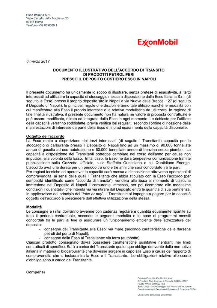 Esso Italiana S.r.l. Viale Castello della Magliana, 25 00148 Roma Telefono +39 06 6569 1 6 marzo 2017 DOCUMENTO ILLUSTRATIVO DELL’ACCORDO DI TRANSITO DI PRODOTTI PETROLIFERI PRESSO IL DEPOSITO COSTIERO ESSO IN NAPOLI Il presente documento ha unicamente lo scopo di illustrare, senza pretese di esaustività, ai terzi interessati ad utilizzare la capacità di stoccaggio messa a disposizione dalla Esso Italiana S.r.l. (di seguito la Esso) presso il proprio deposito sito in Napoli a via Nuova delle Brecce, 127 (di seguito il Deposito di Napoli), le principali regole che disciplineranno tale utilizzo nonché le modalità con cui manifestare alla Esso il proprio interesse e la relativa modulistica da utilizzare. In ragione di tale finalità illustrativa, il presente documento non ha natura né valore di proposta contrattuale e può essere modificato, ritirato od integrato dalla Esso in ogni momento. Le richieste per l’utilizzo della capacità verranno soddisfatte, previa verifica dei requisiti, secondo l’ordine di ricezione delle manifestazioni di interesse da parte della Esso e fino ad esaurimento della capacità disponibile. Oggetto dell'accordo La Esso mette a disposizione dei terzi interessati (di seguito i Transitanti) capacità per lo stoccaggio di carburante presso il Deposito di Napoli fino ad un massimo di 90.000 tonnellate annue di gasolio ad uso autotrazione e 60.000 tonnellate annue di benzina senza piombo. La capacità a disposizione dei Transitanti potrebbe cambiare nel corso dell'anno per cause non imputabili alla volontà della Esso. In tal caso, la Esso ne darà tempestiva comunicazione tramite pubblicazione sulla Gazzetta Ufficiale, sulla Staffetta Quotidiana e sul Quotidiano Energia. L’accordo avrà una durata per un periodo tra uno e tre anni che sarà concordato tra le parti. Per ragioni tecniche ed operative, la capacità sarà messa a disposizione attraverso operazioni di compravendita, ai sensi delle quali il Transitante che abbia stipulato con la Esso l’accordo (per semplicità identificato come "accordo di transito"), venderà alla Esso al momento di ciascuna immissione nel Deposito di Napoli il carburante immesso, per poi ricomprare alle medesime condizioni i quantitativi che intenda via via ritirare dal Deposito entro le quantità di sua pertinenza. In applicazione del principio del “take or pay”, il Transitante si impegna a pagare per la capacità oggetto dell’accordo a prescindere dall’effettiva utilizzazione della stessa. Modalità Le consegne e i ritiri dovranno avvenire con cadenza regolare e quantità equamente ripartite su tutto il periodo contrattuale, secondo le seguenti modalità e in base ai programmi mensili concordati tra le parti al fine di assicurare un funzionamento efficiente delle attrezzature del deposito: - consegne del Transitante alla Esso: via mare (secondo caratteristiche della darsena petroli del porto di Napoli); - consegne della Esso al Transitante: via terra (autobotte). Ciascun prodotto consegnato dovrà possedere caratteristiche qualitative rientranti nei limiti contrattuali di specifica. Sarà a carico del Transitante qualunque obbligo derivante dalla normativa italiana in materia di biocarburante che dovesse sorgere in capo alla Esso a causa del rapporto di compravendita che si instaura tra la Esso e il Transitante. Le obbligazioni relative alle scorte d'obbligo sono a carico del Transitante. Compensi Capitale Euro 134.464.202 int. vers. C.F. e Iscr. Reg. Imprese di Roma N. 00473410587 Partita IVA: IT 00902231000 Socio Unico - Società soggetta all’Attività di Direzione e Coordinamento di ExxonMobil Petroleum & Chemical BVBA Una società del gruppo ExxonMobil 2 Il corrispettivo dei servizi oggetto dell'accordo di transito è fissato, per la prima annualità, in euro 9,30 (nove euro/trenta centesimi) a tonnellata. Resteranno a carico dei Transitanti tutti gli oneri aggiuntivi/accessori al contratto di transito ed alle singole operazioni di compravendita quali, a titolo esemplificativo e non esaustivo, gli oneri per consegne via mare legati alle prescrizioni delle Autorità Locali, le tasse sulle merci sbarcate, le tasse di sdoganamento, gli oneri relativi alle scorte d’obbligo, etc. Il corrispettivo indicato sarà soggetto a revisione annuale per riflettere eventuali variazioni dei costi sostenuti dalla Esso per offrire i servizi di transito. Il corrispettivo dei servizi sarà riconosciuto dai Transitanti nell’ambito di ciascuna operazione di compravendita, e più precisamente all’interno della fattura emessa dalla Esso ai Transitanti in occasione del riacquisto dei prodotti. Tutti i prezzi saranno assoggettati ad I.V.A. ed alle accise previste dalla legge. Le fatture saranno emesse sulla base dei volumi effettivamente movimentati. Con cadenza trimestrale verrà verificato l’effettivo utilizzo della capacità oggetto dell’accordo e, qualora venisse riscontrata capacità non utilizzata, la stessa verrà addebitata al Transitante alla tariffa concordata, sulla base del principio del “take or pay”. Requisiti Sono ammesse tutte le società che abbiano adeguate garanzie finanziarie per far fronte agli impegni contrattuali assunti e al pagamento degli oneri aggiuntivi/accessori. A tal fine, il Transitante dovrà presentare, all’atto della stipula dell’accordo di transito idonee garanzie finanziarie a copertura di tutte le sue obbligazioni. È inoltre richiesto che la Committente possa rifornire in modo regolare il deposito (per soddisfare la domanda dei propri clienti) e che il prelievo di prodotto via autobotte nei vari giorni avvenga in modo sufficientemente regolare. Procedura - Ciascun terzo interessato dovrà manifestare il proprio interesse attraverso l'allegato modulo, da compilarsi in ogni sua parte, sottoscriversi a cura del legale rappresentante od altra persona dotata di idonei poteri e trasmettersi al numero di facsimile +32.2.722.2970 e in versione elettronica all’indirizzo [email protecte