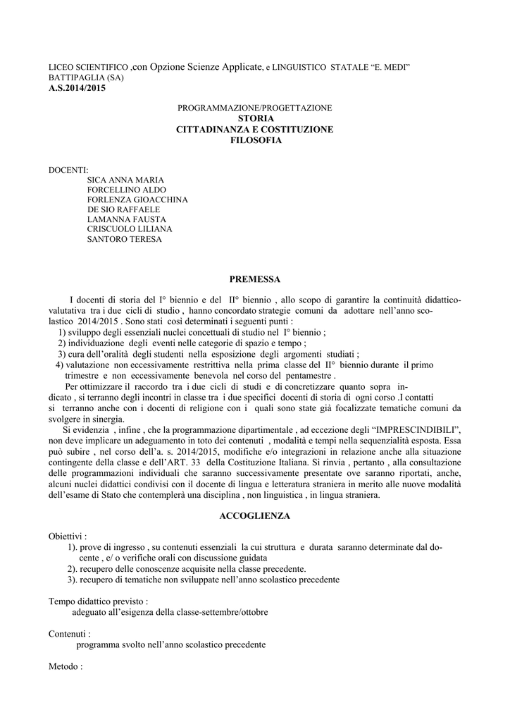 LICEO SCIENTIFICO ,con BATTIPAGLIA (SA) Opzione Scienze Applicate, e LINGUISTICO STATALE “E. MEDI” A.S.2014/2015 PROGRAMMAZIONE/PROGETTAZIONE STORIA CITTADINANZA E COSTITUZIONE FILOSOFIA DOCENTI: SICA ANNA MARIA FORCELLINO ALDO FORLENZA GIOACCHINA DE SIO RAFFAELE LAMANNA FAUSTA CRISCUOLO LILIANA SANTORO TERESA PREMESSA I docenti di storia del I° biennio e del II° biennio , allo scopo di garantire la continuità didatticovalutativa tra i due cicli di studio , hanno concordato strategie comuni da adottare nell’anno scolastico 2014/2015 . Sono stati così determinati i seguenti punti : 1) sviluppo degli essenziali nuclei concettuali di studio nel I° biennio ; 2) individuazione degli eventi nelle categorie di spazio e tempo ; 3) cura dell’oralità degli studenti nella esposizione degli argomenti studiati ; 4) valutazione non eccessivamente restrittiva nella prima classe del II° biennio durante il primo trimestre e non eccessivamente benevola nel corso del pentamestre . Per ottimizzare il raccordo tra i due cicli di studi e di concretizzare quanto sopra indicato , si terranno degli incontri in classe tra i due specifici docenti di storia di ogni corso .I contatti si terranno anche con i docenti di religione con i quali sono state già focalizzate tematiche comuni da svolgere in sinergia. Si evidenzia , infine , che la programmazione dipartimentale , ad eccezione degli “IMPRESCINDIBILI”, non deve implicare un adeguamento in toto dei contenuti , modalità e tempi nella sequenzialità esposta. Essa può subire , nel corso dell’a. s. 2014/2015, modifiche e/o integrazioni in relazione anche alla situazione contingente della classe e dell’ART. 33 della Costituzione Italiana. Si rinvia , pertanto , alla consultazione delle programmazioni individuali che saranno successivamente presentate ove saranno riportati, anche, alcuni nuclei didattici condivisi con il docente di lingua e letteratura straniera in merito alle nuove modalità dell’esame di Stato che contemplerà una disciplina , non linguistica , in lingua straniera. ACCOGLIENZA Obiettivi : 1). prove di ingresso , su contenuti essenziali la cui struttura e durata saranno determinate dal docente , e/ o verifiche orali con discussione guidata 2). recupero delle conoscenze acquisite nella classe precedente. 3). recupero di tematiche non sviluppate nell’anno scolastico precedente Tempo didattico previsto : adeguato all’esigenza della classe-settembre/ottobre Contenuti : programma svolto nell’anno scolastico precedente Metodo : 1). lezione con sintesi schematica 2). dialogo guidato Elementi soggetti a valutazione : 1). conoscenza degli aspetti fondamentali del programma 2) .padronanza del lessico specifico INIZIO DIDATTICA PROGRAMMATA ED ORGANIZZATA IN AREE O MODULI CON U. D. Tempo : Settembre/ottobre METODO Lezione frontale, lezione dialogata, dibattiti, letture di argomenti e/o brani significativi con commento e riflessioni personali, analisi di opere integrali , discussione guidata, visione di cassette audiovisive o CD/Rom , utilizzo di strumenti informatici , Lim, video conferenze , somministrazione di test monodisciplinari, attuazione di progetti didattici POF-PON-POR STRUMENTI di VERIFICA Eventuali prove di ingresso scritte /orali all’inizio dell’a.s. , 2/3 verifiche orali ( interrogazioni individuali , colloqui ) nel corso del trimestre e 3/4 verifiche orali nel corso del pentamestre , eventuali verifiche scritte monodisciplinari mediante questionari , la cui struttura e durata saranno definite dal docente in relazione alla complessità degli argomenti. Prova scritta multidisciplinare nell’ambito della simulazione della terza prova d’esame ( una , due o più prove a seconda delle esigenze della classe ) per le classi V ed eventualmente anche per le classi IV e III. CRITERI PER LA VALUTAZIONE Nel tener presente lo sviluppo armonico della personalità dell’allievo e la sua vocazione , il discente sarà valutato in base alle Conoscenze , alle Competenze e alle Capacità acquisite alla fine dei percorsi di studio ed indicate nelle aree/ moduli con relative unità didattiche ,nonché nei profili di uscita specificati e riportati nel verbale N° 1 del Dipartimento di Storia – Filosofia -Cittadinanza e Costituzione – Religione dell’8 / 9 /2014. All’uopo si allega griglia di valutazione. LIVELLI MINIMI Circa i livelli minimi di competenza , conoscenza e capacità che l’allievo deve aver acquisito per il passaggio alla classe successiva o per gli esami di stato conclusivi si fa riferimento al livello di “sufficienza “ indicato nella griglia di valutazione approvata dal Collegio dei Docenti ed inserita nel P.O.F. a.s.2014/ 2015. SAPERI ESSENZIALI 1) sufficiente conoscenza dei temi indicati nella programmazione e distinti nei moduli 2) sufficiente capacità di analizzare gli eventi storici cogliendone i nessi (Storia) 3) sufficiente capacità di cogliere i punti salienti delle tematiche sviluppate (Filosofia) 4) sufficiente competenza nel riferire i temi trattati con espressione adeguata 5) sufficiente conoscenza di norme sociali e giuridiche per una cittadinanza partecipata ( Cittadinanza e Costituzione) CREDITI E DEBITI FORMATIVI In relazione alla definizione e all’individuazione dei criteri e delle regole per la gestione dei crediti e dei debiti formativi si terranno presenti le indicazioni deliberate ed inserite nel P.O.F. a. s. 2014/2015. GRIGLIA di VALUTAZIONE ( approvata all’unanimità dal Collegio dei Docenti ed inserita nel P.O.F. . a.s.2014/2015 ) VOTAZIONI LIVELDECIMALI LO A B C D 8- 9- 10 7 6 5 Fino a 4 E F 2 INDICATORI Partecipazione propositiva Impegno continuo e puntuale Frequenza assidua Padronanza dei contenuti e delle abilità di trasferirli e rielaborarli autonomamente con linguaggio chiaro e corretto, proprio della terminologia della disciplina; spiccate capacità di critica, analisi e sintesi Partecipazione riflessiva Impegno adeguato Frequenza continua Conseguimento delle mete p