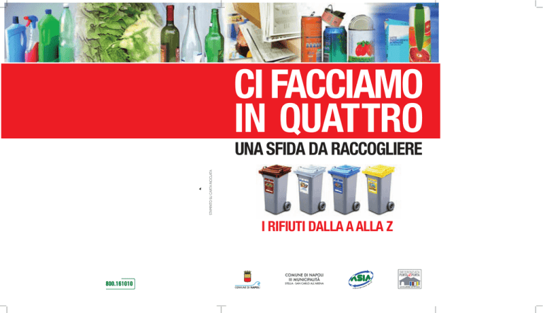 LA RIDUZIONE E IL RIUTILIZZO CI FACCIAMO IN QUATTRO STAMPATO SU CARTA RICICLATA UNA SFIDA DA RACCOGLIERE I RIFIUTI DALLA A ALLA Z 800.161010 COMUNE DI NAPOLI III MUNICIPALITÀ STELLA - SAN CARLO ALL’ARENA Prima di differenziare, è importante pensare in un'ottica di riduzione dei rifiuti, ovvero cercare di non crearne di nuovi. Per questo, al momento dell'acquisto, privilegiamo prodotti con imballaggi poco ingombranti, prodotti in materiali riciclati o riciclabili o che possono essere riutilizzati e scegliamo prodotti che hanno una vita di utilizzo più lunga. Preferiamo i vuoti a rendere, le ricariche e i prodotti alla spina ed evitiamo di comprare oggetti che non usiamo. Abbiamo cura di riparare gli oggetti; tutti i beni non deperibili che acquistiamo hanno una garanzia di legge che consente di ripararli gratuitamente per 2 anni: basta conservarne lo scontrino! Si ricorda che elettrodomestici, telefoni cellulari, personal computer, giocattoli elettronici e apparecchiature elettriche in genere, anche se differenziati presso l'isola ecologica, contengono parti pericolose; perciò usarli più a lungo è un vantaggio maggiore per l'ambiente in cui viviamo. Anche pile e batterie sono rifiuti pericolosi: quando possibile preferiamo l'alimentazione di apparecchi radio mediante la rete elettrica o tramite batterie ricaricabili. LA RIDUZIONE E IL RIUTILIZZO Prima di differenziare, è importante pensare in un'ottica di riduzione dei rifiuti, ovvero cercare di non crearne di nuovi. Per questo, al momento dell'acquisto, privilegiamo prodotti con imballaggi poco ingombranti, prodotti in materiali riciclati o riciclabili o che possono essere riutilizzati e scegliamo prodotti che hanno una vita di utilizzo più lunga. Preferiamo i vuoti a rendere, le ricariche e i prodotti alla spina ed evitiamo di comprare oggetti che non usiamo. Abbiamo cura di riparare gli oggetti; tutti i beni non deperibili che acquistiamo hanno una garanzia di legge che consente di ripararli gratuitamente per 2 anni: basta conservarne lo scontrino! STAMPATO SU CARTA RICICLATA Si ricorda che elettrodomestici, telefoni cellulari, personal computer, giocattoli elettronici e apparecchiature elettriche in genere, anche se differenziati presso l'isola ecologica, contengono parti pericolose; perciò usarli più a lungo è un vantaggio maggiore per l'ambiente in cui viviamo. I RIFIUTI DALLA A ALLA Z Anche pile e batterie sono rifiuti pericolosi: quando possibile preferiamo l'alimentazione di apparecchi radio mediante la rete elettrica o tramite batterie ricaricabili. se un dubbio arta o n u i a Se h le sia in c LO! materiao...STRAPPA bre. sintetic drai le fi e v e n rta Se è ca 800.161010 LEGENDA ISOLA ECOLOGICA AUTORIZZATA ● ● ● ● ▲ NUMERO VERDE INDIFFERENZIATO ORGANICI CARTA - CARTONE MULTIMATERIALE VETRO CONTENITORI PRESSO FARMACIE CONTENITORI PRESSO TABACCHERIE E RIVENDITORI MATERIALE ELETTRICO RACCOGLITORI AUTORIZZATI ▲ ▲ * I residui di questi prodotti non devono mai essere gettati insieme ad altri rifiuti, né devono essere sciacquati o gettati negli scarichi. Queste sostanze, infatti, sono nocive e pericolose per l'ambiente, per l'uomo e per gli altri organismi viventi e possono compromettere, anche in piccole quantità, il corretto funzionamento degli impianti di depurazione delle acque. Questi prodotti sono, di norma, etichettati con i simboli: Per i dettagli è possibile avere ulteriori inforamazioni su: http://www.sicurezzaincasa.it/etichette/etichette.htm I RIFIUTI DALLA A ALLA Z A ▲ abiti usati ● accendini ▲ accumulatori per auto (utenza domestica) ● acetone (contenitore in plastica vuoto)* acido cloridrico (contenitore pieno o con tracce)* ▲ acido muriatico (contenitore pieno o con tracce)* ▲ acido solforico (contenitore pieno o con tracce)* ▲ ▲ acquaragia (contenitore pieno o con tracce)* ● addobbi natalizi ▲ alberi di natale finti ▲ alberi di natale veri ● alcool (contenitore in plastica vuoto)* ● alluminio (oggetti interamente in alluminio) ▲ amianto ● ammoniaca (contenitore vuoto)* animali morti antiparassitari (contenitore pieno o con tracce)* ▲ ▲ antitarme (contenitore pieno o con tracce)* ▲ apparecchiature elettriche ed elettroniche ▲ armadi ▲ aspirapolvere ▲ assi da stiro ● assorbenti ▲ attaccapanni in ferro ▲ attaccapanni in legno ▲ attaccapanni in plastica attrezzi metallici (se composti unicamente da metallo) ● ▲ attrezzi metallici (se composti da più materiali) ● avanzi di cibo B bacinelle in plastica bambole elettriche bambole non elettriche bambù (in piccole quantità) bambù (in grandi quantità) barattoli in alluminio e acciaio barattoli in latta (scatole di pelati, ecc.) ▲ ▲ ● barattoli per alimenti in polvere ● barattoli per articoli da cancelleria ● barattoli per detersivi ● barattoli per rullini fotografici ● barattoli per salviette umide ● barattolini di crema (in plastica o metallo) ▲ batterie di telefono cellulare batuffoli e bastoncini di cotone non biodegradabili ● ● batuffoli e bastoncini di cotone biodegradabili ▲ bauli ● biancheria intima ● bicchieri e stoviglie in plastica ● bicchieri in vetro ▲ biciclette ● biglie in plastica ● biglie in vetro ▲ bistecchiere elettriche ● blister in plastica ▲ bombole del gas (vuote) ● bombolette spray (contenitore vuoto) bombolette spray etichettate T e/o F * ▲ (contenitore pieno o con tracce) ● borse da passeggio in plastica ▲ borse in cuoio ● bottiglie di plastica per acqua, olio, succhi ● bottiglie in vetro ● bottoni ▲ box per bambini ▲ bronzo ● bucce di frutta ● buste e sacchetti per alimenti in carta sporca ● buste e sacchetti per alimenti in plastica ● buste in plastica ● C ● caffettiere (parti in metallo) calcinacci calcolatrici con componenti elettroniche calze di nylon, lana, cotone ▲ ● ● ● ▲ ▲ ▲ I RIFIUTI DALLA A ALLA Z ● candeggina (contenitore vuoto)* ▲ canne per irrigazione ● capell