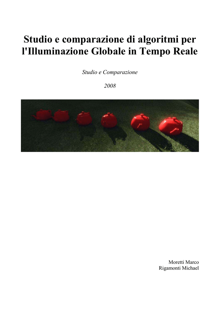 Studio e comparazione di algoritmi per l'Illuminazione Globale in Tempo Reale Studio e Comparazione 2008 Moretti Marco Rigamonti Michael TITOLO DELL'ARTICOLO: Advanced Real-Time Rendering In 3D Graphics and Games Course ANNO: 2007. SOLUZIONE PRESENTATA: Screen Space Ambient Occlusion. BREVE SPIEGAZIONE: Il metodo di Screen Space Ambient Occlusion può essere implementato come un pixel shader, quindi può essere completamente eseguito sulla GPU. Per ogni pixel l'algoritmo esegue una comparazione dei valori delle profondità (memorizzati nel depth buffer) per valutare il livello di occlusione. In forma più semplificata l'occlusione dipende solo dalla differenza di profondità rilevata tra il punto corrente ed un punto rilevato con uno schema casuale. Per ridurre notevolmente il numero di volte in cui si legge da depth buffer questa rilevazione viene fatta usando un kernel che viene ruotato casualmente ogni volta. L'orientamento del kernel viene ripetuto ogni 4x4 pixel; In questo modo si generano esclusivamente degli artefatti che possono essere rimossi facilmente eseguendo un passo di blur 4x4 in fase di post-processing. RISULTATI: Questo metodo genera dinamicamente self shadows e soft shadows in tempo reale. È in grado di supportare scene dinamiche ed è indipendente dalla complessità della scena. PRO: La velocità di calcolo non è determinata dalla complessità della scena ma solo dalla risoluzione. Non c'è bisogno di calcoli pre-processing, nessun tempo di caricamento e nessuno spazio di memoria allocato nel sistema. L'algoritmo lavora completamente sulla GPU ed è identico per ogni pixel dello schermo. CONTRO: La velocità di calcolo non è determinata dalla complessità della scena ma solo dalla risoluzione. Il risultato è una (accettabile) approssimazione della reale illuminazione globale. DATI TECNICI: Questo metodo è stato implementato all'interno di Crysis, un videogioco creato dagli ideatori dell'algoritmo. I requisiti del gioco sono i seguenti: CPU: 2,8 GHz (XP) - 3,2 GHz (Vista); GPU: NVIDIA 6800 GT ATI Radeon 9800 PRO (XP) - X800 (Vista); RAM: 1 GB (XP) - 1,5 GB (Vista). *** TITOLO DELL'ARTICOLO: Ambient Occlusion Fields SOLUZIONE PRESENTATA: Ambient Occlusion. ANNO: 2005. BREVE SPIEGAZIONE: Per ogni oggetto occludente viene pre-computato un settore di spazio circostante ad esso che codifica un'approssimazione dell'occlusione causata dall'oggetto stesso. Questa informazione volumetrica è quindi utilizzabile durante l'esecuzione per determinare rapidamente la ricezione dell'ombra da parte degli oggetti. RISULTATI: L'ambient occlusion è in grado di riprodurre (o perlomeno imitare) gli effetti che altrimenti sarebbero raggiungibili solo attraverso i calcoli di una illuminazione globale completa. PRO: Rispetto al metodo di illuminazione globale completa l'ambient occlusion è significativamente più veloce nei calcoli. Inoltre l'auto-occlusione di un oggetto rigido può essere calcolata separatamente in fase di pre-processing, per poi essere riutilizzata in ambienti diversi. Inoltre, visto che i dati possono essere memorizzati in una texture map o come attributi dei vertici, la tecnica ha un impatto trascurabile nelle applicazioni real-time. In base ai risultati, sia computazionali e sia di requisiti di memoria, questa tecnica ha requisiti sufficientemente bassi per essere direttamente applicabile ai giochi per computer e alle applicazioni 3D interattive, sfruttando gli attuali standard di hardware grafici. CONTRO: L'oggetto ausiliario utilizzato per calcolare l'occlusione deve essere ricalcolato ogni volta che le posizioni degli oggetti subiscono un cambiamento. Questo richiede nella maggior parte dei casi tempi accettabili nei rendering in modalità non interattive, ma non in applicazioni in tempo reale. DATI TECNICI: La tecnica è stata applicata ad un carrarmato (numero di poligoni sconosciuto) e ad una scena in cui dei cubi vengono fatti cadere dall'alto. La scena viene calcolata con una risoluzione 1024×768 su una macchina Pentium 4 con una scheda grafica ATI Radeon 9800XT. Di seguito sono riportati i risultati: Scene Cube-Map Resolution Memory Consumption Preprocess Time FPS Tank 8x8 8400 bytes 1 min 2 s 136 Tank 16x16 27216 bytes 4 min 6 s 136 Tank 32x32 97104 bytes 16 min 29 s 136 Tank 64x64 365904 bytes 66 min 136 1 Cube 32x32 97104 bytes 5 min 16 s 500 5 Cubes 32x32 97104 bytes 5 min 16 s 95 10 Cubes 32x32 97104 bytes 5 min 16 s 44 20 Cubes 32x32 97104 bytes 5 min 16 s 16 *** TITOLO DELL'ARTICOLO: Half Life 2: Valve Source Shading ANNO: 2004. SOLUZIONE PRESENTATA: Radiosity Normal Mapping. BREVE SPIEGAZIONE: L'albero di rendering di Half Life 2 implementa un metodo chiamato Radiosity Normal Mapping. Questo metodo usa la radiosity insieme alla normal mapping e ad un passo che gestisce esclusivamente l'illuminazione specular per renderizzare l'immagine finale. Tutti i calcoli di radiosity vengono effettuati in tangent space, e sono quindi applicabili ad ogni tipo di superficie. Una valutazione in radiosity viene calcolata per ogni vettore della base utilizzata. La Specular lightning viene realizzata utilizzando delle cube maps, pre-generate attraverso il rendering dei dati della scena. Le superfici della scena scelgono la cube map più vicina, alternativamente cube map differenti possono essere assegnate esplicitamente. RISULTATI: La Radiosity normal mapping produce self shadows e soft shadows, ed una volta calcolate le cube maps (per il passaggio speculare) diventa una valida scelta per il calcolo dell'illuminazione globale in tempo reale. PRO: Il metodo calcola in tangent space, quindi i calcoli possono essere applicati a qualsiasi tipo di superficie. Permette una scena composta da geometrie dinamiche. L'algoritmo può calcolare bump maps mentre permette un numero arbitrario di luci in un singolo passaggio. CONTRO: Le luci speculari devono essere calcolate in un passo successivo. Il metodo richiede un passo di pre-processing per il calcolo delle cube maps, che