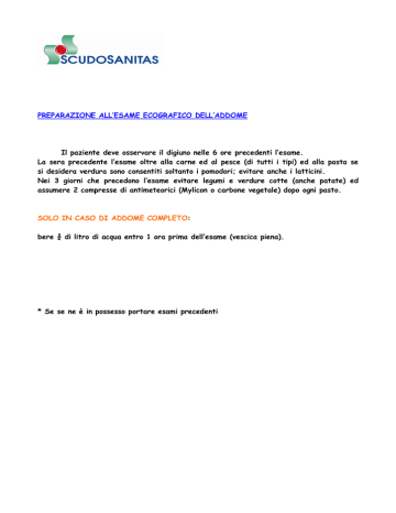 PREPARAZIONE ALL’ESAME ECOGRAFICO DELL’ADDOME Il paziente deve osservare il digiuno nelle 6 ore precedenti l’esame. La sera precedente l’esame oltre alla carne ed al pesce (di tutti i tipi) ed alla pasta se si desidera verdura sono consentiti soltanto i pomodori; evitare anche i latticini. Nei 3 giorni che precedono l’esame evitare legumi e verdure cotte (anche patate) ed assumere 2 compresse di antimeteorici (Mylicon o carbone vegetale) dopo ogni pasto. SOLO IN CASO DI ADDOME COMPLETO: bere ¾ di litro di acqua entro 1 ora prima dell’esame (vescica piena). * Se se ne è in possesso portare esami precedenti