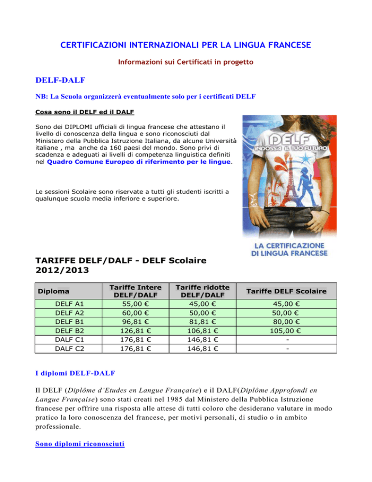 CERTIFICAZIONI INTERNAZIONALI PER LA LINGUA FRANCESE Informazioni sui Certificati in progetto DELF-DALF NB: La Scuola organizzerà eventualmente solo per i certificati DELF Cosa sono il DELF ed il DALF Sono dei DIPLOMI ufficiali di lingua francese che attestano il livello di conoscenza della lingua e sono riconosciuti dal Ministero della Pubblica Istruzione Italiana, da alcune Università italiane , ma anche da 160 paesi del mondo. Sono privi di scadenza e adeguati ai livelli di competenza linguistica definiti nel Quadro Comune Europeo di riferimento per le lingue. Le sessioni Scolaire sono riservate a tutti gli studenti iscritti a qualunque scuola media inferiore e superiore. TARIFFE DELF/DALF - DELF Scolaire 2012/2013 Diploma DELF DELF DELF DELF DALF DALF A1 A2 B1 B2 C1 C2 Tariffe Intere DELF/DALF 55,00 € 60,00 € 96,81 € 126,81 € 176,81 € 176,81 € Tariffe ridotte DELF/DALF 45,00 € 50,00 € 81,81 € 106,81 € 146,81 € 146,81 € Tariffe DELF Scolaire 45,00 € 50,00 € 80,00 € 105,00 € - I diplomi DELF-DALF Il DELF (Diplôme d’Etudes en Langue Française) e il DALF(Diplôme Approfondi en Langue Française) sono stati creati nel 1985 dal Ministero della Pubblica Istruzione francese per offrire una risposta alle attese di tutti coloro che desiderano valutare in modo pratico la loro conoscenza del francese, per motivi personali, di studio o in ambito professionale . Sono diplomi riconosciuti Questi diplomi di francese come lingua straniera costituiscono a livello internazionale le uniche certificazioni riconosciute sia dalle istituzioni pubbliche e privat e francesi che dagli Enti dispensatori di borse di studio e programmi di formazione all'estero dei vari paesi europei. Oggi, nel mondo, più di 60.000 diplomi sono rilasciati ogni anno, coinvolgendo 157 paesi e 900 centri di esame. La validità degli esami del DELF e del DALF, diplomi statali francesi a tutti gli effetti, non ha scadenza. Sono diplomi di stato Il DELF e il DALF sono diplomi rilasciati dal Ministère de l’Education Nationale francese, garante della validità pedagogica delle prove. Si riferiscono ufficialmente ai sei livelli di competenza linguistica definiti nel Quadro Comune Europeo di riferimento per le lingue. L'Italia è tra i primi paesi mondiali per il numero di candidati (nel 2006, circa 30 000 candidati si sono presentati agli esami) e per l’introduzione della certificazione nelle scuole e università: i diplomi francesi sono stati varati dal MIUR sulla base di una convenzione stipulata con gli Enti certificatori stranieri (DPR 8 marzo 1999 n.275 Regolamento dell'autonomia, programma CAMPUS ONE), al fine di “sensibilizzare un vasto pubblico all'importanza di ottenere un certificato trasparente e spendibile oltre il contesto scolastico, in quanto attestato di competenza riconosciuto a livello internazionale". Sono diplomi utili Nelle università francofone, il DALF sostituisce il test di livello in lingua francese necessario per l’iscrizione. Nell’ambito lavorativo, i diplomi sono valorizzati dalla istituzioni pubbliche e private che hanno il francese come lingua di lavoro. La Regione Sardegna dal 2006 ha introdotto il Quadro Comune Europeo di riferimento per le lingue come valutazione delle competenze linguistiche dei candidati ai vari concorsi banditi dalle istituzioni regionali. La certificazione francese e il quadro di riferimento per le lingue Corrispondenza fra quadro di riferimento europeo, livelli di conoscenza della lingua e diplomi Il Consiglio d'Europa ha individuato sei livelli di conoscenza della lingua chiamati livelli comuni di riferimento che corrispondono a sei certificazioni e diplomi autonomi per la Lingua francese Divisione classica A Livello base B Livello intermedio C Livello avanzato Livelli di riferimento del quadro europeo A1 (introduttivo) A2 (intermedio) B1 (soglia) B2 (avanzato) C1 (autonomo) C2 (padronanza) Certificazioni per il FRANCESE DELF A1 DELF A2 DELF B1 DELF B2 DALF C1 DALF C2 I livelli di competenza valutati dai diplomi francesi DELF A1: le prime conoscenze acquisite Verifica le conoscenze ad un livello di scoperta della lingua: si tratta di comprendere e utilizzare espressioni familiari di uso quotidiano per soddisfare bisogni concreti. DELF A2: la competenza elementare Convalida la competenza linguistica dell’utente elementare, che è in grado di comprendere espressioni di uso frequente relative ad ambiti di immediata rilevanza. DELF B1: il livello intermedio Sanziona un livello di competenza vicino a quello dell’utente autonomo, che possiede due competenze fondamentali: la capacità di portare avanti un’int erazione e quella di far fronte con abilità ai problemi della vita quotidiana. DELF B2: l’utente indipendente Si concentra sull’efficacia dell’argomentazione e la spontaneità del discorso sociale. Questo nuovo grado di conoscenza della lingua è caratteri zzato dall’introduzione di argomenti astratti. DALF C1: l’esperienza e l’autonomia E’ il livello della lingua accademica e professionale: implica la comprensione di testi complessi e lunghi con significato implicito, una comunicazione scorrevole e la ca pacità di produrre testi chiari, ben strutturati e articolati su argomenti complessi. DALF C2: la padronanza E’ definito dal quadro Europeo come il grado di precisione, di adeguatezza che si ritrova nel locutore di alto livello. Tipologia delle prove Ciascun esame valuta le 4 competenze del Quadro di riferimento comune per le lingue: COMPRENSIONE (orale e scritta), PRODUZIONE (orale e scritta). La certificazione francese in Italia La certificazione francese e l’Ambasciata di Francia in Italia In Italia, il Centro Pilota per le certificazioni è integrato al Bureau de Coopération Linguistique et Artistique (BCLA) dell’Ambasciata di Francia in Italia. Francese Consiglio d'Europa Alliance Française (dal 09/2005) A1 A2 B1 B2 C1 C2 -DELF DELF DELF (Diplôme DELF DALF (Diplôme DALF (Diplôme (Diplôme (Diplôme