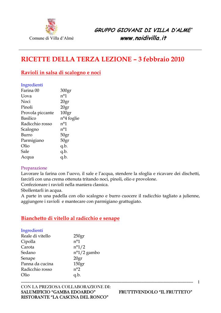 GRUPPO GIOVANI DI VILLA D’ALME’ Comune di Villa d’Almè www.noidivilla.it RICETTE DELLA TERZA LEZIONE – 3 febbraio 2010 Ravioli in salsa di scalogno e noci Ingredienti Farina 00 Uova Noci Pinoli Provola piccante Basilico Radicchio rosso Scalogno Burro Parmigiano Olio Sale Acqua 300gr n°1 20gr 20gr 100gr n°4 foglie n°1 n°1 50gr 50gr q.b. q.b. q.b. Preparazione Lavorare la farina con l’uovo, il sale e l’acqua, stendere la sfoglia e ricavare dei dischetti, farcirli con una crema ottenuta tritando noci, pinoli, olio e provolone. Confezionare i ravioli nella maniera classica. Sbollentarli in acqua. A parte in una padella con olio scalogno e burro cuocere il radicchio tagliato a julienne, aggiungere i ravioli e mantecare con parmigiano grattugiato. Bianchetto di vitello al radicchio e senape Ingredienti Reale di vitello Cipolla Carota Sedano Senape Panna da cucina Radicchio rosso Olio 250gr n°1 n°1/2 n°1/2 gambo 20gr 150gr n°2 q.b. ---------------------------------------------------------------------------------------------------------------------------------------------------------CON LA PREZIOSA COLLABORAZIONE DI: SALUMIFICIO “GAMBA EDOARDO” FRUTTIVENDOLO “IL FRUTTETO” RISTORANTE “LA CASCINA DEL RONCO” 1 GRUPPO GIOVANI DI VILLA D’ALME’ Comune di Villa d’Almè Sale Pepe Vino bianco Rosmarino www.noidivilla.it q.b. q.b. q.b. q.b. Preparazione Far appassire in un tegame la cipolla , il sedano e la carota tritati. Aggiungere la carne e rosolare per dieci minuti circa, girandola di tanto in tanto. Bagnare con il vino bianco e lasciar evaporare. Inserire il rosmarino e coprire con acqua. Cuocere per mezz’ora. Mescolare ed aggiungere il radicchio tagliato finemente. Verso la fine della cottura aggiungere panna e senape. Regolare di sale e pepe. Coniglio alla senese con radicchio Ingredienti Radicchio rosso Coniglio Salvia Rosmarino Cipolla Aglio Bacche di ginepro Vino rosso Sale Pepe Capperi Aceto Passata pomodoro n°2 n°1 q.b. q.b. n°1 n°3 spicchi q.b. q.b. q.b. q.b. 30gr q.b. q.b. Preparazione Tagliare il coniglio a pezzi non grossi e farlo rosolare in un fondo di olio, cipolla, rosmarino e salvia. Salare, pepare ed aggiungere le bacche di ginepro. A metà cottura aggiungere i capperi, il radicchio tagliato a julienne e bagnare con il vino rosso. Aggiungere la passata ed ultimare la cottura. ---------------------------------------------------------------------------------------------------------------------------------------------------------- 2 CON LA PREZIOSA COLLABORAZIONE DI: SALUMIFICIO “GAMBA EDOARDO” FRUTTIVENDOLO “IL FRUTTETO” RISTORANTE “LA CASCINA DEL RONCO”