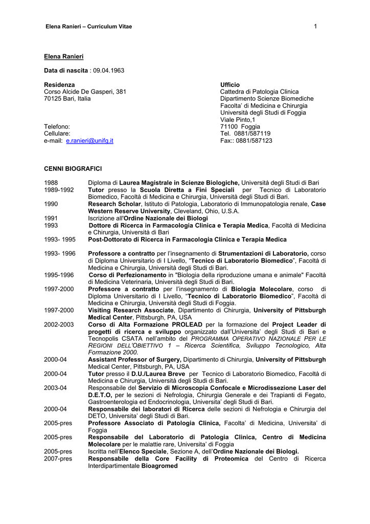 Elena Ranieri – Curriculum Vitae 1 Elena Ranieri Data di nascita : 09.04.1963 Residenza Corso Alcide De Gasperi, 381 70125 Bari, Italia Telefono: Cellulare: e-mail: [email protected] Ufficio Cattedra di Patologia Clinica Dipartimento Scienze Biomediche Facolta’ di Medicina e Chirurgia Università degli Studi di Foggia Viale Pinto,1 71100 Foggia Tel. 0881/587119 Fax:: 0881/587123 CENNI BIOGRAFICI 1988 1989-1992 1990 1991 1993 1993- 1995 1993- 1996 1995-1996 1997-2000 1997-2000 2002-2003 2000-04 2000-04 2003-04 2000-04 2005-pres 2005-pres 2005-pres 2007-pres Diploma di Laurea Magistrale in Scienze Biologiche, Università degli Studi di Bari Tutor presso la Scuola Diretta a Fini Speciali per Tecnico di Laboratorio Biomedico, Facoltà di Medicina e Chirurgia, Università degli Studi di Bari. Research Scholar, Istituto di Patologia, Laboratorio di Immunopatologia renale, Case Western Reserve University, Cleveland, Ohio, U.S.A. Iscrizione all'Ordine Nazionale dei Biologi Dottore di Ricerca in Farmacologia Clinica e Terapia Medica, Facoltà di Medicina e Chirurgia, Università di Bari Post-Dottorato di Ricerca in Farmacologia Clinica e Terapia Medica Professore a contratto per l’insegnamento di Strumentazioni di Laboratorio, corso di Diploma Universitario di I Livello, “Tecnico di Laboratorio Biomedico”, Facoltà di Medicina e Chirurgia, Università degli Studi di Bari. Corso di Perfezionamento in "Biologia della riproduzione umana e animale" Facoltà di Medicina Veterinaria, Università degli Studi di Bari. Professore a contratto per l’insegnamento di Biologia Molecolare, corso di Diploma Universitario di I Livello, “Tecnico di Laboratorio Biomedico”, Facoltà di Medicina e Chirurgia, Università degli Studi di Foggia. Visiting Research Associate, Dipartimento di Chirurgia, University of Pittsburgh Medical Center, Pittsburgh, PA, USA Corso di Alta Formazione PROLEAD per la formazione del Project Leader di progetti di ricerca e sviluppo organizzato dall’Universita’ degli Studi di Bari e Tecnopolis CSATA nell’ambito del PROGRAMMA OPERATIVO NAZIONALE PER LE REGIONI DELL’OBIETTIVO 1 – Ricerca Scientifica, Sviluppo Tecnologico, Alta Formazione 2000. Assistant Professor of Surgery, Dipartimento di Chirurgia, University of Pittsburgh Medical Center, Pittsburgh, PA, USA Tutor presso il D.U./Laurea Breve per Tecnico di Laboratorio Biomedico, Facoltà di Medicina e Chirurgia, Università degli Studi di Bari. Responsabile del Servizio di Microscopia Confocale e Microdissezione Laser del D.E.T.O, per le sezioni di Nefrologia, Chirurgia Generale e dei Trapianti di Fegato, Gastroenterologia ed Endocrinologia, Universita’ degli Studi di Bari. Responsabile dei laboratori di Ricerca delle sezioni di Nefrologia e Chirurgia del DETO, Universita’ degli Studi di Bari. Professore Associato di Patologia Clinica, Facolta’ di Medicina, Universita’ di Foggia Responsabile del Laboratorio di Patologia Clinica, Centro di Medicina Molecolare per le malattie rare, Universita’ di Foggia Iscritta nell’Elenco Speciale, Sezione A, dell’Ordine Nazionale dei Biologi. Responsabile della Core Facility di Proteomica del Centro di Ricerca Interdipartimentale Bioagromed Elena Ranieri – Curriculum Vitae 2007-pres 2007-pres 2008 2008 2009 2 Membro del Comitato Tecnico Scientifico del Centro di Ricerca Interdipartimentale Bioagromed, per il triennio 2007/2010. Componente del nucleo di progettazione, comitato scientifico, e comitato di coordinamento del progetto Formativo “Tecnico superiore per le applicazioni informatiche”, del progetto cofinanziato da F.S.E., Stato e Regione Puglia; Delegato alla Internazionalizzazione per la Facolta’ di Medicina e Chirurgia, Universita’ di Foggia Delegato Del Magnifico Rettore alle Relazioni Internazionali per l’Universita’ di Foggia Membro del Comitato Tecnico-Scientifico (CTS), per l’attuazione del progetto comunitario “I.R.F.-Improve the Research activities of Foggia University by an action plan aimed to upgrade and reinforce its RTD potential”. ATTIVITA' SCIENTIFICA L'attività scientifica della Prof.ssa Ranieri é documentata da n. 342 pubblicazioni a stampa, comparse su riviste italiane ed internazionali (Impact factor dei 58 lavori sottoposti a peer reviewer system: totale 315,615; impact factor medio: 5,4). L'impatto scientifico delle sue ricerche é documentato dalle 1412 citazioni citazioni dei suoi lavori (aggiornato al 08/09/2008; sono state escluse le autocitazioni). Ha scritto editoriali e capitoli di libri in lingua inglese e in lingua italiana (1F-9F) come unico autore o in collaborazione con altri autori. L'attività scientifica é, inoltre, documentata dalle letture e comunicazioni scientifiche presentate a congressi nazionali ed internazionali. La Prof.ssa Ranieri collabora, con numerose Istituzioni di Università italiane ed estere (Department of Surgery, University of Pittsburgh, USA; Institute of Pathology, Case Western Reserve University, Cleveland, OH, USA; Department of Medicine, University of Texas, San Antonio, USA; Dipartimento di Medicina Interna, Università di Firenze, Department of Haemathology/Oncology, University of Mainz, Germany). ATTIVITA' DIDATTICA - Negli anni Accademici 1989-1990, 1990-91 e 1991-92 ha svolto attività didattica in qualità di tutor presso la Scuola Diretta a Fini Speciali per Tecnico di Laboratorio Biomedico, Facoltà di Medicina e Chirurgia, Università degli Studi di Bari. - Negli anni Accademici 1993-94, 1994-95 e 1995-96 e’ stata professore a contratto di “Strumentazioni di Laboratorio” per il Diploma Universitario di I Livello “Tecnico di Laboratorio Biomedico”, Facolta’ di Medicina e Chirurgia, Universita’ degli Studi di Bari. - Negli anni Accademici 1996-97 e 1998-99 e’ stata professore a contratto di “Biologia Molecolare” per il Diploma Universitario di I Livello “Tecnico di Laboratorio Biomedico”, Facolta’ di Medicina e Chirurgia, Universita’ degli St
