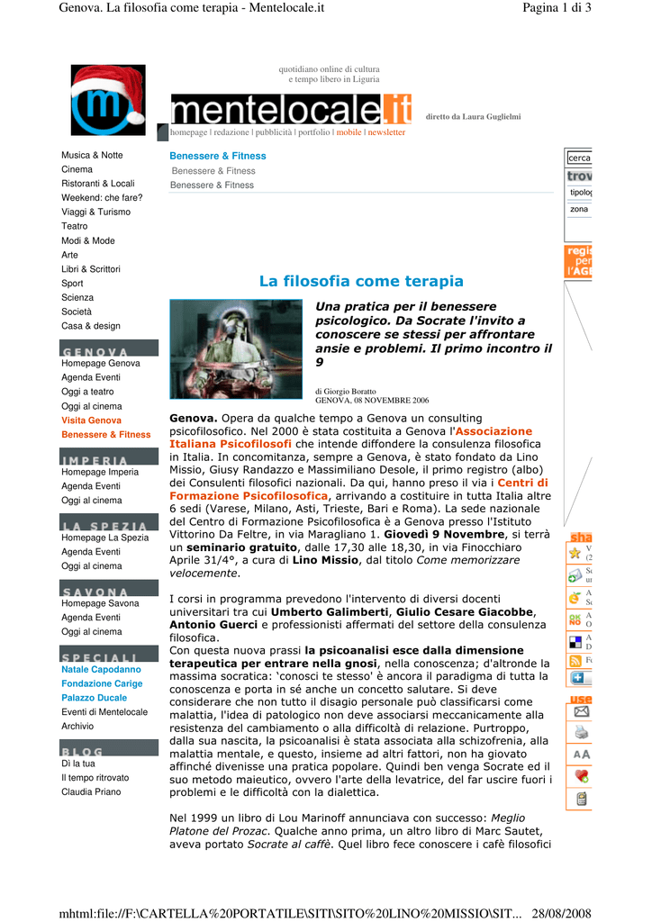 Genova. La filosofia come terapia - Mentelocale.it Pagina 1 di 3 quotidiano online di cultura e tempo libero in Liguria diretto da Laura Guglielmi homepage | redazione | pubblicità | portfolio | mobile | newsletter Musica & Notte Benessere & Fitness Cinema Benessere & Fitness Ristoranti & Locali Benessere & Fitness cerca nel sito tipologia Weekend: che fare? zona Viaggi & Turismo Teatro Modi & Mode Arte Libri & Scrittori Sport Scienza Società Casa & design Homepage Genova La filosofia come terapia Una pratica per il benessere psicologico. Da Socrate l'invito a conoscere se stessi per affrontare ansie e problemi. Il primo incontro il 9 Agenda Eventi Oggi a teatro Oggi al cinema Visita Genova Benessere & Fitness Homepage Imperia Agenda Eventi Oggi al cinema Homepage La Spezia Agenda Eventi Oggi al cinema Homepage Savona Agenda Eventi Oggi al cinema Natale Capodanno Fondazione Carige Palazzo Ducale Eventi di Mentelocale Archivio Dì la tua Il tempo ritrovato Claudia Priano di Giorgio Boratto GENOVA, 08 NOVEMBRE 2006 Genova. Opera da qualche tempo a Genova un consulting psicofilosofico. Nel 2000 è stata costituita a Genova l'Associazione Italiana Psicofilosofi che intende diffondere la consulenza filosofica in Italia. In concomitanza, sempre a Genova, è stato fondato da Lino Missio, Giusy Randazzo e Massimiliano Desole, il primo registro (albo) dei Consulenti filosofici nazionali. Da qui, hanno preso il via i Centri di Formazione Psicofilosofica, arrivando a costituire in tutta Italia altre 6 sedi (Varese, Milano, Asti, Trieste, Bari e Roma). La sede nazionale del Centro di Formazione Psicofilosofica è a Genova presso l'Istituto Vittorino Da Feltre, in via Maragliano 1. Giovedì 9 Novembre, si terrà un seminario gratuito, dalle 17,30 alle 18,30, in via Finocchiaro Aprile 31/4°, a cura di Lino Missio, dal titolo Come memorizzare velocemente. I corsi in programma prevedono l'intervento di diversi docenti universitari tra cui Umberto Galimberti, Giulio Cesare Giacobbe, Antonio Guerci e professionisti affermati del settore della consulenza filosofica. Con questa nuova prassi la psicoanalisi esce dalla dimensione terapeutica per entrare nella gnosi, nella conoscenza; d'altronde la massima socratica: ‘conosci te stesso' è ancora il paradigma di tutta la conoscenza e porta in sé anche un concetto salutare. Si deve considerare che non tutto il disagio personale può classificarsi come malattia, l'idea di patologico non deve associarsi meccanicamente alla resistenza del cambiamento o alla difficoltà di relazione. Purtroppo, dalla sua nascita, la psicoanalisi è stata associata alla schizofrenia, alla malattia mentale, e questo, insieme ad altri fattori, non ha giovato affinché divenisse una pratica popolare. Quindi ben venga Socrate ed il suo metodo maieutico, ovvero l'arte della levatrice, del far uscire fuori i problemi e le difficoltà con la dialettica. Vota questo articolo (28) Segnala a un amico Aggiungi a Segnalo Aggiungi a OkNotizie Aggiungi a Del.icio.us Feed RSS Nel 1999 un libro di Lou Marinoff annunciava con successo: Meglio Platone del Prozac. Qualche anno prima, un altro libro di Marc Sautet, aveva portato Socrate al caffè. Quel libro fece conoscere i cafè filosofici mhtml:file://F:\CARTELLA%20PORTATILE\SITI\SITO%20LINO%20MISSIO\SIT... 28/08/2008 Genova. La filosofia come terapia - Mentelocale.it Pagina 2 di 3 parigini, che si moltiplicarono in molto paesi. Era un primo approccio ad una filosofia che usciva dalle scuole per entrare nella vita comune. Una filosofia come aiuto al vivere quotidiano. Oggi si può affermare che la filosofia si sta riprendendo una sua rivincita. Il caso delle ristampe di libri come Lettere sulla felicità di Epicureo e le guide di Schopenhauer, tipo L'arte di essere felici o L'arte di ottenere ragione, portano l'attenzione sulla felicità, quale parametro della saggezza. In breve, sulle rovine delle ideologie e delle utopie, nella crisi delle coscienze e delle trascendenze, la filosofia si è assegnata un nuovo compito: quello di offrire ricette per imparare a vivere meglio. È sperabile? Insomma, per perdere chili o per calmare le nevrastenie, può bastare un imperativo categorico kantiano o una lettura di Nietzsche? Il presupposto è che ogni persona porta in sé una struttura di idee e valori, una propria visione della vita che può essere alla base di forme di disagio o di sofferenza. Il consulente psicofilosofico in questo caso non punta a una guarigione, non propone una terapia in senso classico, cerca di condurre il suo assistito a prendere maggiore consapevolezza di sé e, allargandone la visione, affrontare i problemi in modo diverso. Lino Missio, l'ideatore italiano per quanto riguarda la psicofilosofia, ha pubblicato un libro: Io preda del mio sosia, (Ed. Erga), in cui spiega dettagliatamente la consulenza filosofica. Alcuni estratti del libro si possono leggere sul sito web: riflessioni.it. Divertiti nel tempo libero con il tuo lettore mp3 e con il tuo palmare. Leggi sul tuo portatile la rivista online di cultura e compara i prezzi dei cellulari. Proprio in questi giorni, grazie alla collaborazione del direttore del circolo Didattico San Teodoro Giancarlo Malombra, è stato stipulato un accordo -con l'associazione dei psicofilosofi genovesi- che prevede l'inserimento del Consulente Filosofico all'interno di 6 scuole statali da lui dirette. Questo accordo, a Genova, è il primo a livello nazionale che prevede all'interno di scuole la figura di un consulente filosofico: una persona utile a sopperire le diverse problematiche d'apprendimento dei ragazzi ed agli aspetti sistemici che nascono dalle relazioni fra gli studenti, gli insegnanti e i genitori. Informazioni: http://www.psicofilosofia.net/ oppure 010 660375. torna su Registrati per ricevere gli eventi di Genova e della Liguria! Testata reg. presso il Trib. di GE, Aut. Nr. 16/2005 del 16/07/2005. Dir. resp. Laura Guglielmi [ contribuisci! ] - [ contattaci ] - [ chi siamo ] - [ dov