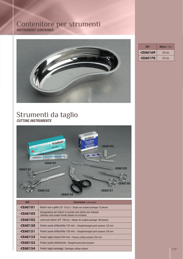 Contenitore per strumenti INSTRUMENT CONTAINER ART. Misura / Size -CEAE169 20 cm. -CEAE170 25 cm. Strumenti da taglio CUTTING INSTRUMENTS -CEAE103 -CEAE101 -CEAE102 -CEAE153 -CEAE150 -CEAE152 -CEAE151 -CEAE154 ART. Descrizione / Description -CEAE101 Bisturi usa e getta (CF. 10 pz.) / Single use scalpel (package 10 pieces) -CEAE102 Impugnatura per bisturi in acciaio inox (lame non incluse) -CEAE103 Lame per bisturi (CF. 100 pz.) / Blades for scalpel (package 100 pieces) -CEAE150 Forbici punta dritta/dritta 125 mm. / Straight/straight point scissors 125 mm -CEAE151 Forbici punta dritta/dritta 150 mm. / Straight/straight point scissors 150 mm -CEAE152 Forbici taglio tessuti 254 mm./ Tissues cutting scissors 254 mm -CEAE153 Forbici punta dritta/tonda / Straight/round point scissors -CEAE154 Forbici taglio bendaggi / Bandage cutting scissors Stainless steel scalpel handle (blades not included) 117 Pinze e ferri PLIERS AND TOOLS ART. Descrizione / Description -CEAE112 Pinza p.te arrotondate -CEAE113 Pinza p.te arrotondate -CEAE114 Pinza p.te arrotondate -CEAE115 Pinza p.te fini -CEAE116 Pinza p.te medie -CEAE117 Pinza p.te fini Round point pliers Round point pliers Round point pliers Thin point pliers Medium point pliers Thin point pliers -CEAE112 Misure / Size -CEAE113 305 mm. -CEAE114 254 mm. -CEAE115 200 mm. -CEAE116 200 mm. 178 mm. 150 mm. -CEAE117 ART. Descrizione / Description -CEAE108 Pinza emostatica p.te tonde -CEAE109 Pinza emostatica p.te tonde -CEAE119 Ferro a gancio -CEAE121 Ferro separatore -CEAE167 Sonda direttrice scanalata Styptic pliers with round points Styptic pliers with round points Hook tool Separating tool Splined line Misure / Size -CEAE109 -CEAE119 150 mm. 125 mm. - -CEAE121 - -CEAE108 -CEAE167 ART. Descrizione / Description -CEAE110 Pinza vascolare -CEAE111 Pinza vascolare -CEAE118 Pinza atraumatica vascolare -CEAE120 Pinza divaricatrice -CEAE120 -CEAE118 Vascular pliers Vascular pliers Vascular atraumatic pliers Retractor pliers -CEAE110 -CEAE111 118 Strumenti per sutura SUTURE TOOLS ART. -CEAE201 -CEAE200 -CEAE201 -CEAE202 -CEAE203 -CEAE203 Descrizione Description Filo di sutura cosmetico Cosmetic suture wire Dispensatore filo Dispensing suture wire Filo di sutura (per dispensatore) Suture wire Filo per suture medio Medium suture wire -CEAE202 -CEAE200 Aghi -CEAE210 NEEDLES -CEAE211 ART. -CEAE212 -CEAE210 Ago per suture "J" fine -CEAE211 Ago per suture "J" fine -CEAE212 Ago per suture "J" extra fine -CEAE213 Ago per suture "C" fine -CEAE214 Ago per suture "C" fine -CEAE215 Ago per suture mezzaluna -CEAE216 Ago per suture mezzaluna fine -CEAE218 Ago per suture "J" steso -CEAE220 -CEAE219 Ago per suture "J" steso -CEAE221 -CEAE220 Ago per suture "J" steso -CEAE221 Ago per suture "J" steso -CEAE222 Ago per suture serpentina -CEAE223 Ago per suture serpentina -CEAE224 Ago per suture serpentina -CEAE213 -CEAE214 -CEAE215 -CEAE216 -CEAE218 -CEAE219 -CEAE222 -CEAE223 -CEAE224 Descrizione / Description Thin suture needle “J” Thin suture needle “J” Extra thin needle “J” Thin suture wire “C” Thin suture wire “C” Half moon suture wire Thin half moon suture wire Flat suture wire “J” Flat suture wire “J” Flat suture wire “J” Flat suture wire “J” Tubular suture wire Tubular suture wire Tubular suture wire Misure / Size 100 mm. 75 mm. 40 mm. 75 mm. 100 mm. 100 mm. 100 mm. 75 mm. 100 mm. 125 mm. 150 mm. 100 mm. 125 mm. 150 mm. 119 Accessori per esecuzione camouflage CAMOUFLAGE ACCESSORIES ART. -CEAE021 Descrizione / Description Pennello/pettine per sopracciglia, barba e baffi Brush/comb for eyebrow, shave and moustache -CEAE022 Pennello da trucco grande -CEAE023 Pennello da trucco sottile -CEAE024 Pennello da trucco medio -CEAE025 Pennello da trucco con punta obliqua -CEAE026 Pennello da fondo -CEAE039 -CEAE041 Large make up brush -CEAE024 -CEAE041 -CEAE025 Thin make up brush Medium make up brush -CEAE026 -CEAE023 Oblique point make up brush Base brush Paletta in acciaio flessibile con manico in legno -CEAE039 Flexible steel small shovel with wooden handle -CEAE022 -CEAE021 Spugnetta in lattice. CF. 2 pz. Oval latex sponge Package 2 pieces Materiale per la cura delle mani MATERIAL FOR HAND TREATMENT ART. 120 Descrizione / Description -CEAE014 Spazzola pulisci unghie -CEAE017 Lima per unghie -CEAE030 Forbicine per pelli -CEAE034 Smalto per unghie -CEAE035 Tagliaunghie -CEAE036 Rasoio -CEAE034 -CEAE014 Nail cleaning brush Nail file -CEAE036 Scissors for cuticles -CEAE017 Nail polish Nail cutter Razor -CEAE035 -CEAE030 Materiale per la preparazione generale della salma MATERIAL FOR GENERAL PREPARATION OF THE CORPSE -CEAE033 -CEAE012 -CEAE011 -CEAE013 -CEAE016 -CEAE018 -CEAE031 -CEAE032 ART. Descrizione / Description -CEAE011 Spazzola scheletro / Brush skeleton -CEAE012 Pettine a denti larghi / Large comb -CEAE013 Pettine a doppia dentatura / Double comb -CEAE016 Mini phon pieghevole / Foldable mini hairdryer -CEAE018 Pennello levapelucchi / Hair removing brush -CEAE031 Pulisci spazzola / Brush cleaner -CEAE032 Pulisci pettine / Comb cleaner -CEAE033 Spazzola rigida / Rigid brush 121