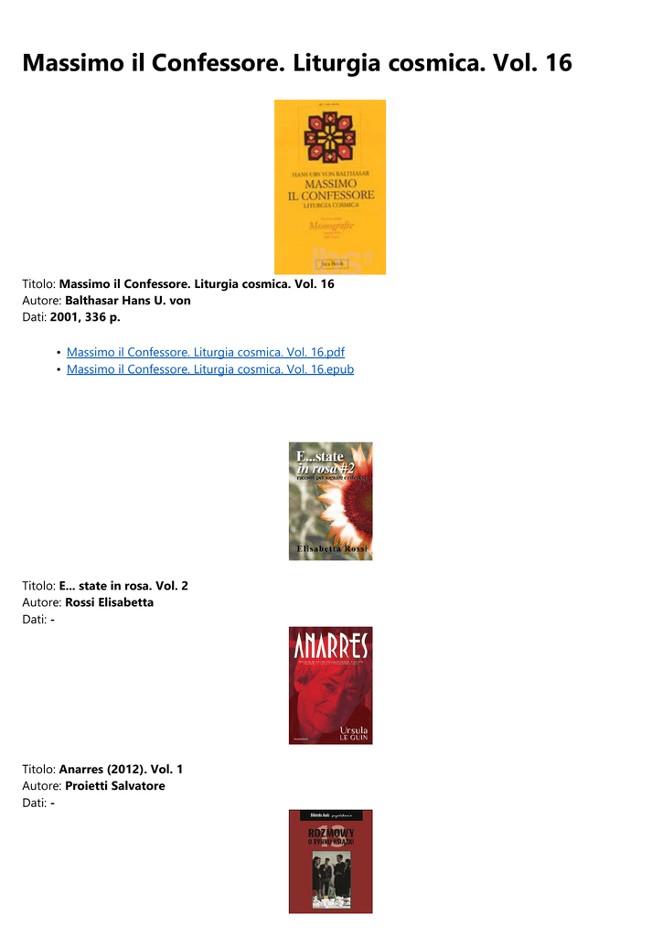 Massimo il Confessore. Liturgia cosmica. Vol. 16 Titolo: Massimo il Confessore. Liturgia cosmica. Vol. 16 Autore: Balthasar Hans U. von Dati: 2001, 336 p. • Massimo il Confessore. Liturgia cosmica. Vol. 16.pdf • Massimo il Confessore. Liturgia cosmica. Vol. 16.epub Titolo: E... state in rosa. Vol. 2 Autore: Rossi Elisabetta Dati: - Titolo: Anarres (2012). Vol. 1 Autore: Proietti Salvatore Dati: - Titolo: Rozmowy o rynku ksiazki. Vol. 13 Autore: Dati: - Titolo: Morte del piccolo giudice. Le indagini di Mary Lester, ispettore di polizia in Bretagna. Vol. 10 Autore: Failler Jean Dati: 2012, 286 p., brossura Titolo: Odissea nei pianeti. Vol. 1 Autore: Bianciardi Lorenzo Dati: - Titolo: Le guardiane del regno. Vol. 1 Autore: Carlucci Martina Dati: - Titolo: I romanzi di Tempesta d'amore. Vol. 3 Autore: Dati: - Titolo: Blue. La trilogia delle gemme. Vol. 2 Autore: Gier Kerstin Dati: 2011, 345 p., rilegato Titolo: Dark Zero. The tube. Nomads. Vol. 1 Autore: Altieri Alan D. Dati: - Titolo: Tutto il resto è noia. Nirvana. Vol. 12 Autore: Caluri Daniele, Cannucciari Bruno, Pagani Emiliano Dati: - Titolo: Biancaneve. Fairy tales. Vol. 1 Autore: Barisone Daniela, Derevel Livin Dati: - Titolo: Opera omnia. Vol. 8 Autore: Giovanni Paolo I Dati: - Titolo: L'ultimo cavaliere. La torre nera. Vol. 1 Autore: King Stephen Dati: 2013,