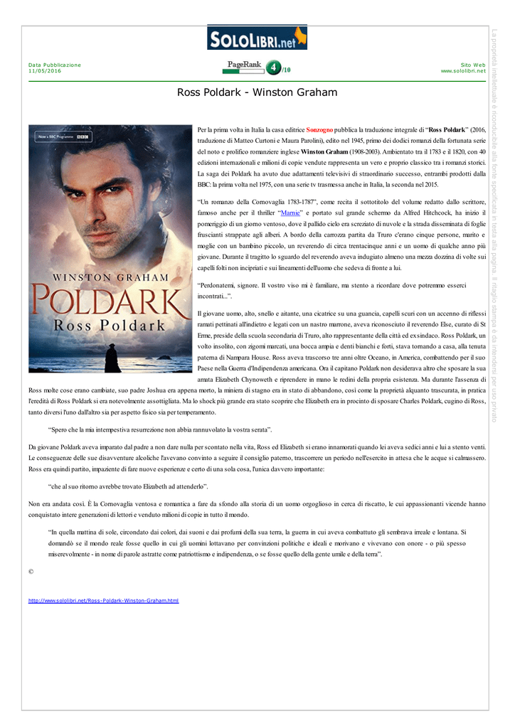 Sito W eb www.sololibri.net Ross Poldark - Winston Graham Per la prima volta in Italia la casa editrice Sonzogno pubblica la traduzione integrale di “Ross Poldark” (2016, traduzione di Matteo Curtoni e Maura Parolini), edito nel 1945, primo dei dodici romanzi della fortunata serie del noto e prolifico romanziere inglese Winston Graham (1908-2003). Ambientato tra il 1783 e il 1820, con 40 edizioni internazionali e milioni di copie vendute rappresenta un vero e proprio classico tra i romanzi storici. La saga dei Poldark ha avuto due adattamenti televisivi di straordinario successo, entrambi prodotti dalla BBC: la prima volta nel 1975, con una serie tv trasmessa anche in Italia, la seconda nel 2015. “Un romanzo della Cornovaglia 1783-1787”, come recita il sottotitolo del volume redatto dallo scrittore, famoso anche per il thriller “Marnie” e portato sul grande schermo da Alfred Hitchcock, ha inizio il pomeriggio di un giorno ventoso, dove il pallido cielo era screziato di nuvole e la strada disseminata di foglie fruscianti strappate agli alberi. A bordo della carrozza partita da Truro c'erano cinque persone, marito e moglie con un bambino piccolo, un reverendo di circa trentacinque anni e un uomo di qualche anno più giovane. Durante il tragitto lo sguardo del reverendo aveva indugiato almeno una mezza dozzina di volte sui capelli folti non incipriati e sui lineamenti dell'uomo che sedeva di fronte a lui. “Perdonatemi, signore. Il vostro viso mi è familiare, ma stento a ricordare dove potremmo esserci incontrati...”. Il giovane uomo, alto, snello e aitante, una cicatrice su una guancia, capelli scuri con un accenno di riflessi ramati pettinati all'indietro e legati con un nastro marrone, aveva riconosciuto il reverendo Else, curato di St Erme, preside della scuola secondaria di Truro, alto rappresentante della città ed ex sindaco. Ross Poldark, un volto insolito, con zigomi marcati, una bocca ampia e denti bianchi e forti, stava tornando a casa, alla tenuta paterna di Nampara House. Ross aveva trascorso tre anni oltre Oceano, in America, combattendo per il suo Paese nella Guerra d'Indipendenza americana. Ora il capitano Poldark non desiderava altro che sposare la sua amata Elizabeth Chynoweth e riprendere in mano le redini della propria esistenza. Ma durante l'assenza di Ross molte cose erano cambiate, suo padre Joshua era appena morto, la miniera di stagno era in stato di abbandono, così come la proprietà alquanto trascurata, in pratica l'eredità di Ross Poldark si era notevolmente assottigliata. Ma lo shock più grande era stato scoprire che Elizabeth era in procinto di sposare Charles Poldark, cugino di Ross, tanto diversi l'uno dall'altro sia per aspetto fisico sia per temperamento. “Spero che la mia intempestiva resurrezione non abbia rannuvolato la vostra serata”. Da giovane Poldark aveva imparato dal padre a non dare nulla per scontato nella vita, Ross ed Elizabeth si erano innamorati quando lei aveva sedici anni e lui a stento venti. Le conseguenze delle sue disavventure alcoliche l'avevano convinto a seguire il consiglio paterno, trascorrere un periodo nell'esercito in attesa che le acque si calmassero. Ross era quindi partito, impaziente di fare nuove esperienze e certo di una sola cosa, l'unica davvero importante: “che al suo ritorno avrebbe trovato Elizabeth ad attenderlo”. Non era andata così. È la Cornovaglia ventosa e romantica a fare da sfondo alla storia di un uomo orgoglioso in cerca di riscatto, le cui appassionanti vicende hanno conquistato intere generazioni di lettori e venduto milioni di copie in tutto il mondo. “In quella mattina di sole, circondato dai colori, dai suoni e dai profumi della sua terra, la guerra in cui aveva combattuto gli sembrava irreale e lontana. Si domandò se il mondo reale fosse quello in cui gli uomini lottavano per convinzioni politiche e ideali e morivano e vivevano con onore - o più spesso miserevolmente - in nome di parole astratte come patriottismo e indipendenza, o se fosse quello della gente umile e della terra”. © http://www.sololibri.net/Ross-Poldark-Winston-Graham.html La proprietà intellettuale è riconducibile alla fonte specificata in testa alla pagina. Il ritaglio stampa è da intendersi per uso privato Data Pubblicazione 11/05/2016