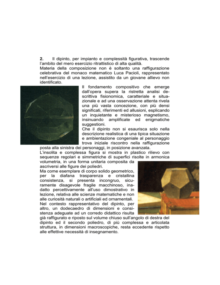 2. Il dipinto, per impianto e complessità figurativa, trascende l’ambito del mero esercizio ritrattistico di alta qualità. Materia della composizione non è soltanto una raffigurazione celebrativa del monaco matematico Luca Pacioli, rappresentato nell’esercizio di una lezione, assistito da un giovane allievo non identificato. Il fondamento compositivo che emerge dall’opera supera la ristretta analisi descrittiva fisionomica, caratteriale e situazionale e ad una osservazione attenta rivela una più vasta concezione, con più densi significati, riferimenti ed allusioni, esplicando un inquietante e misterioso magnetismo, insinuando amplificate ed enigmatiche suggestioni. Che il dipinto non si esaurisca solo nella descrizione realistica di una tipica situazione e ambientazione congeniale al personaggio trova iniziale riscontro nella raffigurazione posta alla sinistra dei personaggi, in posizione avanzata. L’insolita e complessa figura si mostra in plastico rilievo con sequenze regolari e simmetriche di superfici risolte in armonica volumetria, in una forma unitaria composita da ascriversi alle figure dei poliedri. Ma come esemplare di corpo solido geometrico, per la diafana trasparenza e cristallina consistenza, si presenta incongruo, sicuramente disagevole fragile macchinoso, inadatto percettivamente all’uso dimostrativo in lezione, relativa alle scienze matematiche e non alle curiosità naturali o artificiali ed ornamentali. Nel contesto rappresentativo del dipinto, per altro, un dodecaedro di dimensioni e consistenza adeguate ad un corredo didattico risulta già raffigurato e riposto sul volume chiuso sull’angolo di destra del dipinto ed il secondo poliedro, di più complessa e articolata struttura, in dimensioni macroscopiche, resta eccedente rispetto alle effettive necessità di insegnamento. Ad escludere una mera funzione di completamento strutturale del dipinto ed a favore di più estese implicazioni e connessioni, che attestano una rappresentazione non accessoria, icasticamente inserita come elemento figurativo ed ispirativo essenziale dell’intera elaborazione pittorica, in una concezione che trascende l’immediatezza visiva, si aggiunge la suggestione di arcana e misteriosa presenza indotta dalla sospensione in levitazione e dai bagliori di luminescenza interna e riflessi di luce esterna, che, in provenienza da un’invisibile finestra specchiata sul solido, si trasferiscono al libro aperto sulla cattedra. Anche la collocazione più avanzata in apertura della sequenza con i personaggi, in proporzione e coerenza, si pone a segnale di una tematica di una più pregnante referenzialità. Forma pura baluginante di riflessi e trasparenze, la sagoma del singolare poliedro di cristallo, che emerge con le due figure umane dalla fonda e densa oscurità, si espande in insinuante percezione subliminale, in arcana immagine onirica, in amplificata parvenza mnestica, resa assoluta e fissata in emblematico simulacro nel dipinto. In ordine all’esecuzione della struttura del solido geometrico, che appare diviso a livello mediano da una superficie orizzontale e che a luce naturale radente rivela aggiunte di materia coloristica dovute a stesure successive nel tempo di ripresa e ritocco pittorico, s’impongono ulteriori mirate indagini ed accertamenti, nella più ampia e necessaria indagine sull’intero dipinto da effettuarsi mediante tecniche strumentali. Ma aldilà dei risultati ottenibili già possono essere colte le generali referenze e implicazioni di significato inerenti alla simbologia dei poliedri regolari. Paradigmi di sintesi e perfezione formale, per la struttura costituita essenzialmente di convergente modularità, di armonia del molteplice in unità, i poliedri sono archetipi di simbologie diffuse in diverse culture e tradizioni di ogni tempo con significati e valori concordanti di perfezione nella complessità. Il dodecaedro - che nel dipinto è raffigurato sul volume richiuso poggiato sulla cattedra - è considerato in particolare come rappresentazione e immagine del cosmo, della sua realtà complessa, espressione del suo ordine normativo e strutturativo. Fondato sul numero delle suddivisioni del tempo e dello spazio, nella triplice ripartizione del quaternio di stagioni e punti cardinali, il dodecaedro è inteso come sintesi delle forze della creazione, del dinamismo di trasformazione, di transizione ed evoluzione della materia, della pulsione ed elevazione della vita allo spirito. Struttura geometrica connessa alla organizzazione spaziale nelle manifestazioni di estensione, dimensione, configurazione e consistenza, fondamenti corporei dell’esistente, delle cose, del mondo, ed espressione di simmetria, di proporzione tra parti singole ed insieme unitario, il dodecaedro è anche attuazione particolare della misura aurea o “sezione aurea”, regolatrice della proporzione euritmica, fonte di armonia e bellezza, principio ordinamentale di perfezione, di natura cosmogonica. Le valenze simboliche, mutando la relazione modulare e quella numerica nella diversa specifica strutturazione, variano da poliedro a poliedro unitamente alla definizione in volumetria e attuazione in forma. Fondamento di antichi sistemi numerativi a base vigesimale, il numero venti, che identifica la cifra modulare dell’icosaedro, nella connessione al calcolo, alla misurazione, alla progettazione, conferisce un ambito simbologicamente inverso al dodecaedro, evidenziando il procedere verso il particolare e finito, all’atto realizzativo, al perfezionamento e compimento di una opera, alla tecnica ed all’arte, all’espressione del lavoro umano. Analoghe concezioni, che, collegate al contemporaneo neoplatonismo ficiniano, risalgono alla tradizione del platonismo ed alla simbologia ermetica e misteriosofica, alla ”aritmogeometria” ed all’esoterismo matematico pitagorico, ispirano il dipinto e conferiscono chiarimento alle rap-presentazioni. Nel “De Divina Proportione”, secondo una antica