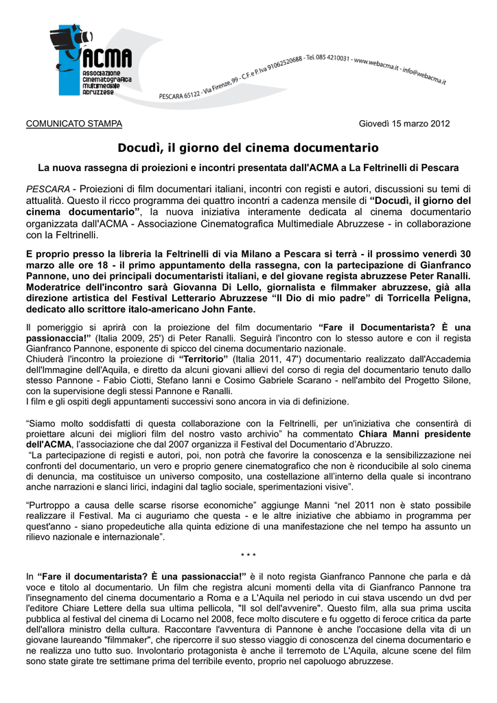 COMUNICATO STAMPA Giovedì 15 marzo 2012 Docudì, il giorno del cinema documentario La nuova rassegna di proiezioni e incontri presentata dall'ACMA a La Feltrinelli di Pescara PESCARA - Proiezioni di film documentari italiani, incontri con registi e autori, discussioni su temi di attualità. Questo il ricco programma dei quattro incontri a cadenza mensile di “Docudì, il giorno del cinema documentario”, la nuova iniziativa interamente dedicata al cinema documentario organizzata dall'ACMA - Associazione Cinematografica Multimediale Abruzzese - in collaborazione con la Feltrinelli. E proprio presso la libreria la Feltrinelli di via Milano a Pescara si terrà - il prossimo venerdì 30 marzo alle ore 18 - il primo appuntamento della rassegna, con la partecipazione di Gianfranco Pannone, uno dei principali documentaristi italiani, e del giovane regista abruzzese Peter Ranalli. Moderatrice dell'incontro sarà Giovanna Di Lello, giornalista e filmmaker abruzzese, già alla direzione artistica del Festival Letterario Abruzzese “Il Dio di mio padre” di Torricella Peligna, dedicato allo scrittore italo-americano John Fante. Il pomeriggio si aprirà con la proiezione del film documentario “Fare il Documentarista? È una passionaccia!” (Italia 2009, 25') di Peter Ranalli. Seguirà l'incontro con lo stesso autore e con il regista Gianfranco Pannone, esponente di spicco del cinema documentario nazionale. Chiuderà l'incontro la proiezione di “Territorio” (Italia 2011, 47') documentario realizzato dall'Accademia dell'Immagine dell'Aquila, e diretto da alcuni giovani allievi del corso di regia del documentario tenuto dallo stesso Pannone - Fabio Ciotti, Stefano Ianni e Cosimo Gabriele Scarano - nell'ambito del Progetto Silone, con la supervisione degli stessi Pannone e Ranalli. I film e gli ospiti degli appuntamenti successivi sono ancora in via di definizione. “Siamo molto soddisfatti di questa collaborazione con la Feltrinelli, per un'iniziativa che consentirà di proiettare alcuni dei migliori film del nostro vasto archivio” ha commentato Chiara Manni presidente dell'ACMA, l’associazione che dal 2007 organizza il Festival del Documentario d’Abruzzo. “La partecipazione di registi e autori, poi, non potrà che favorire la conoscenza e la sensibilizzazione nei confronti del documentario, un vero e proprio genere cinematografico che non è riconducibile al solo cinema di denuncia, ma costituisce un universo composito, una costellazione all’interno della quale si incontrano anche narrazioni e slanci lirici, indagini dal taglio sociale, sperimentazioni visive”. “Purtroppo a causa delle scarse risorse economiche” aggiunge Manni “nel 2011 non è stato possibile realizzare il Festival. Ma ci auguriamo che questa - e le altre iniziative che abbiamo in programma per quest'anno - siano propedeutiche alla quinta edizione di una manifestazione che nel tempo ha assunto un rilievo nazionale e internazionale”. *** In “Fare il documentarista? È una passionaccia!” è il noto regista Gianfranco Pannone che parla e dà voce e titolo al documentario. Un film che registra alcuni momenti della vita di Gianfranco Pannone tra l'insegnamento del cinema documentario a Roma e a L'Aquila nel periodo in cui stava uscendo un dvd per l'editore Chiare Lettere della sua ultima pellicola, "Il sol dell'avvenire". Questo film, alla sua prima uscita pubblica al festival del cinema di Locarno nel 2008, fece molto discutere e fu oggetto di feroce critica da parte dell'allora ministro della cultura. Raccontare l'avventura di Pannone è anche l'occasione della vita di un giovane laureando "filmmaker", che ripercorre il suo stesso viaggio di conoscenza del cinema documentario e ne realizza uno tutto suo. Involontario protagonista è anche il terremoto de L'Aquila, alcune scene del film sono state girate tre settimane prima del terribile evento, proprio nel capoluogo abruzzese. “Territorio” è stato girato tra il novembre del 2010 ed il marzo del 2011 nel capoluogo abruzzese, L'Aquila. Probabilmente è il primo film documentario in cui il terremoto, seppur presente, non è protagonista. I testimoni chiave sono quattro giovani ragazzi aquilani che sono stati ascoltati e pedinati da alcuni giovani ex allievi dell'accademia dell'immagine. Giovani che osservano giovani, in un contesto ambientale congelato dal freddo e dalla neve, quindi ovattato, fermo. Nasce così una pellicola interessante, dove risaltano i reali problemi della città e della popolazione aquilana, specialmente quella giovane. Si ricerca una normalità che non c'è più, nonostante l'alta dignità della popolazione, si percepisce un senso di immobilità che non lascia intravedere spiragli positivi a cui aggrapparsi per un prossimo futuro. Gianfranco Pannone (Napoli, 1963) è un regista italiano di documentari e autore di un lungometraggio di fiction (“Io che amo solo te”, 2004). Dal 1991 al 1998 ha ideato e diretto una trilogia sul sogno americano in Italia e nel 1999 - in collaborazione col produttore Carlo Cresto-Dina - ha realizzato “Pomodori”, viaggio nell'identità italiana. Nel 2007 con Paolo Santoni ha realizzato per Rai 3 la miniserie “Cronisti di strada”. Attualmente insegna al Dams dell'Università degli studi Roma Tre, alla Scuola Zelig di Bolzano ed alla Act Multimedia, Accademia del Cinema e Televisione, a Cinecittà in cui è il curatore del corso di Regia del Documentario. Dall'autunno del 2001 tiene una rubrica mensile sul portale del cinema documentario “ildocumentario.it”. Nel 2008 presenta al Festival internazionale del film di Locarno il documentario “Il sol dell'avvenire”, tratto da un libro di Giovanni Fasanella e Alberto Franceschini incentrato su alcuni esponenti delle Brigate Rosse. La sua ultima fatica riguarda la storia dei 150 anni d'Italia con "Ma che storia", un film prodotto e distribuito dall'istituto luce. Un viaggio tragicomico nella nostra storia attraverso il lungo e faticoso per
